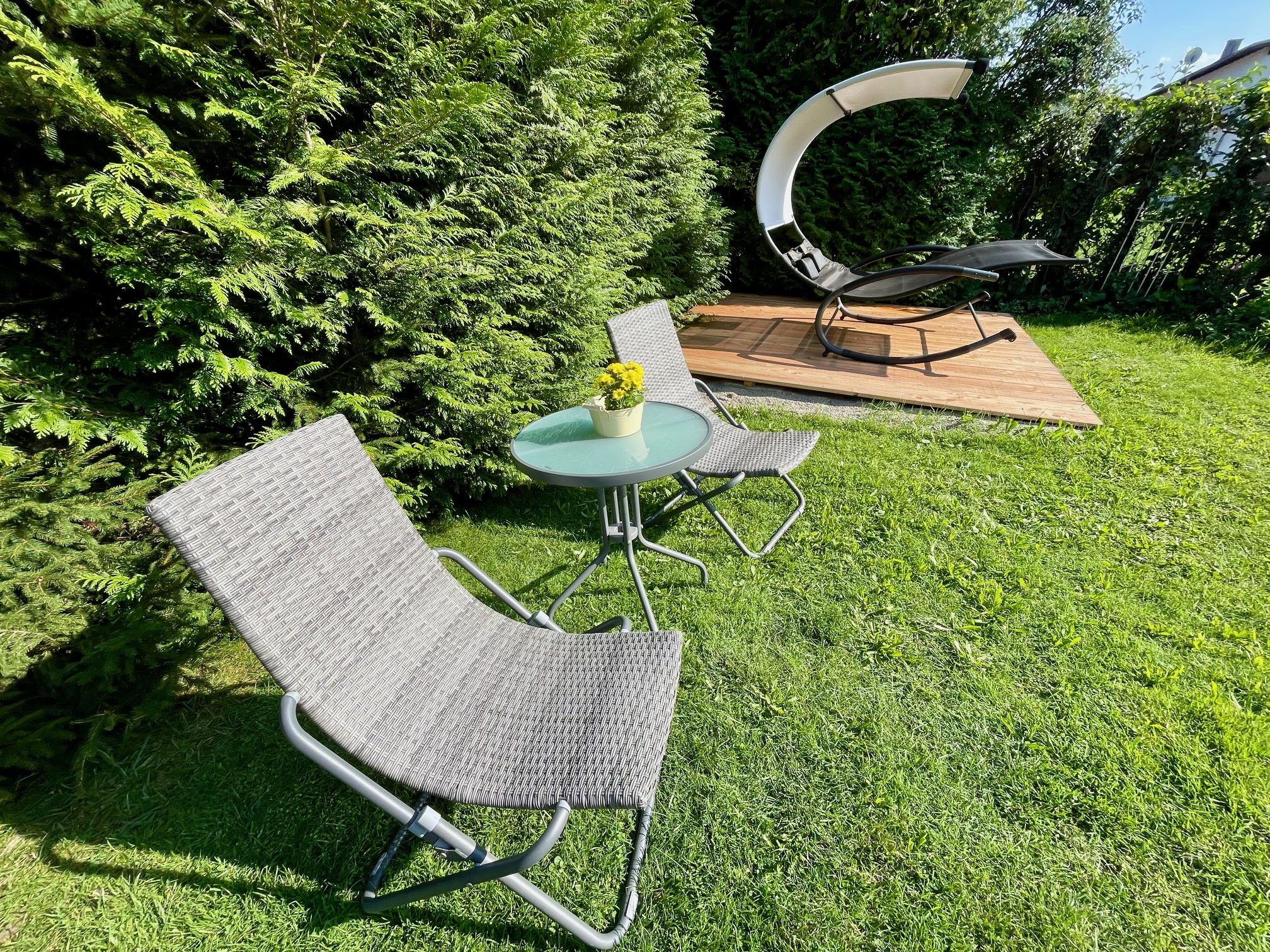 - ein großzügiger ca. 400 m² großer Garten, liebevoll angelegt, mit mehreren Ebenen, ausgestattet mit Sonnenliegen, Tischen und Stühlen