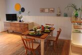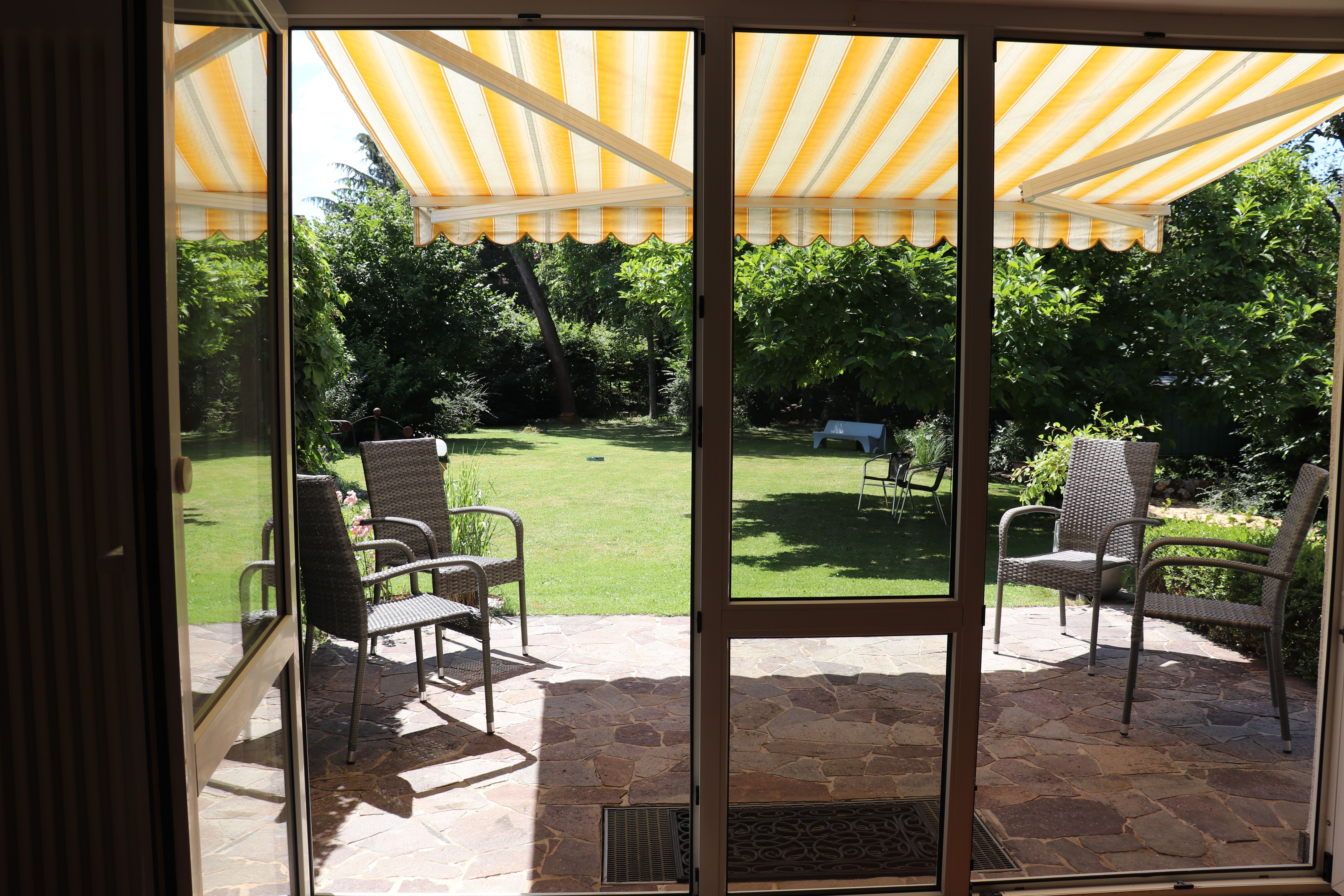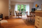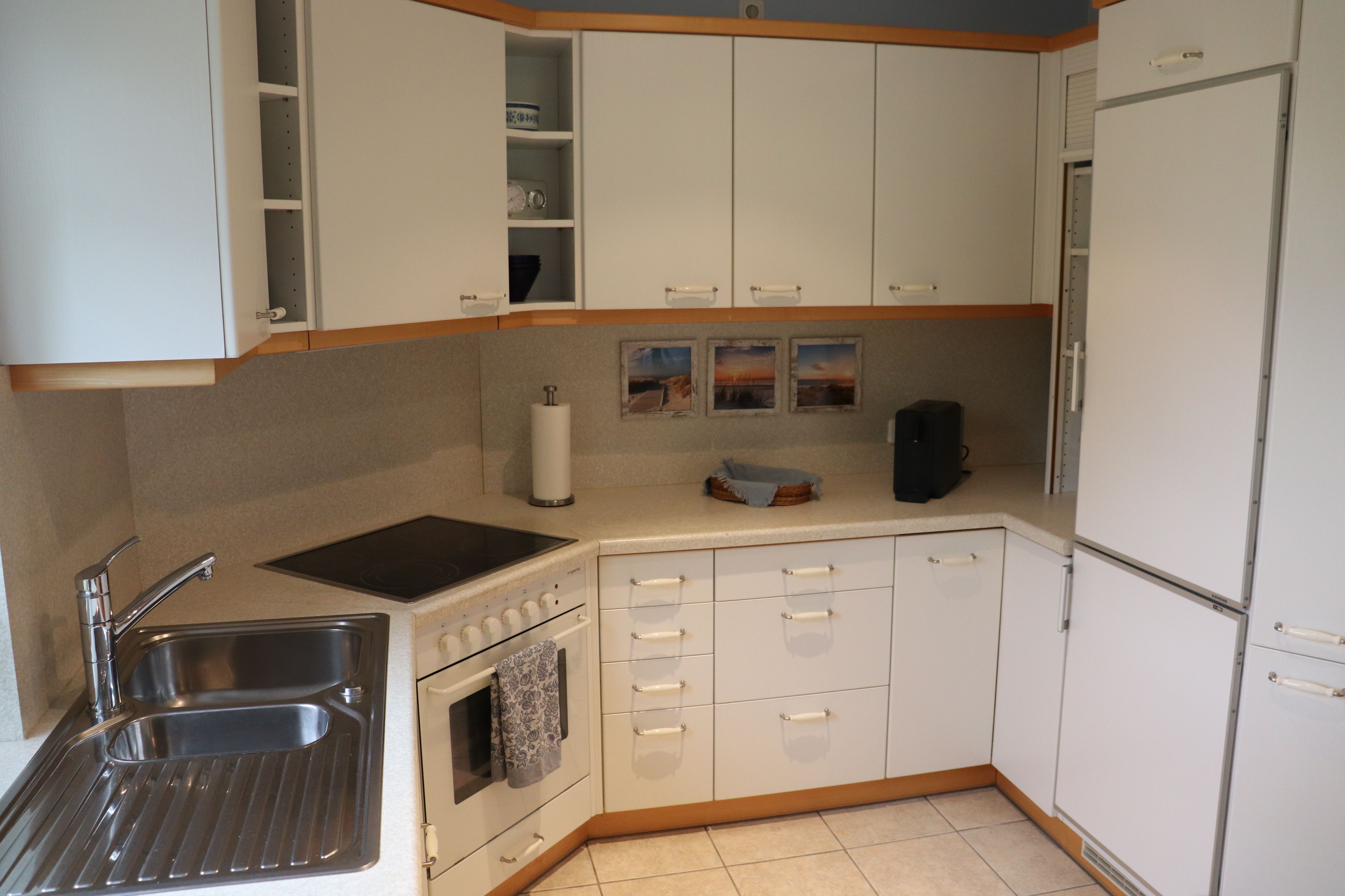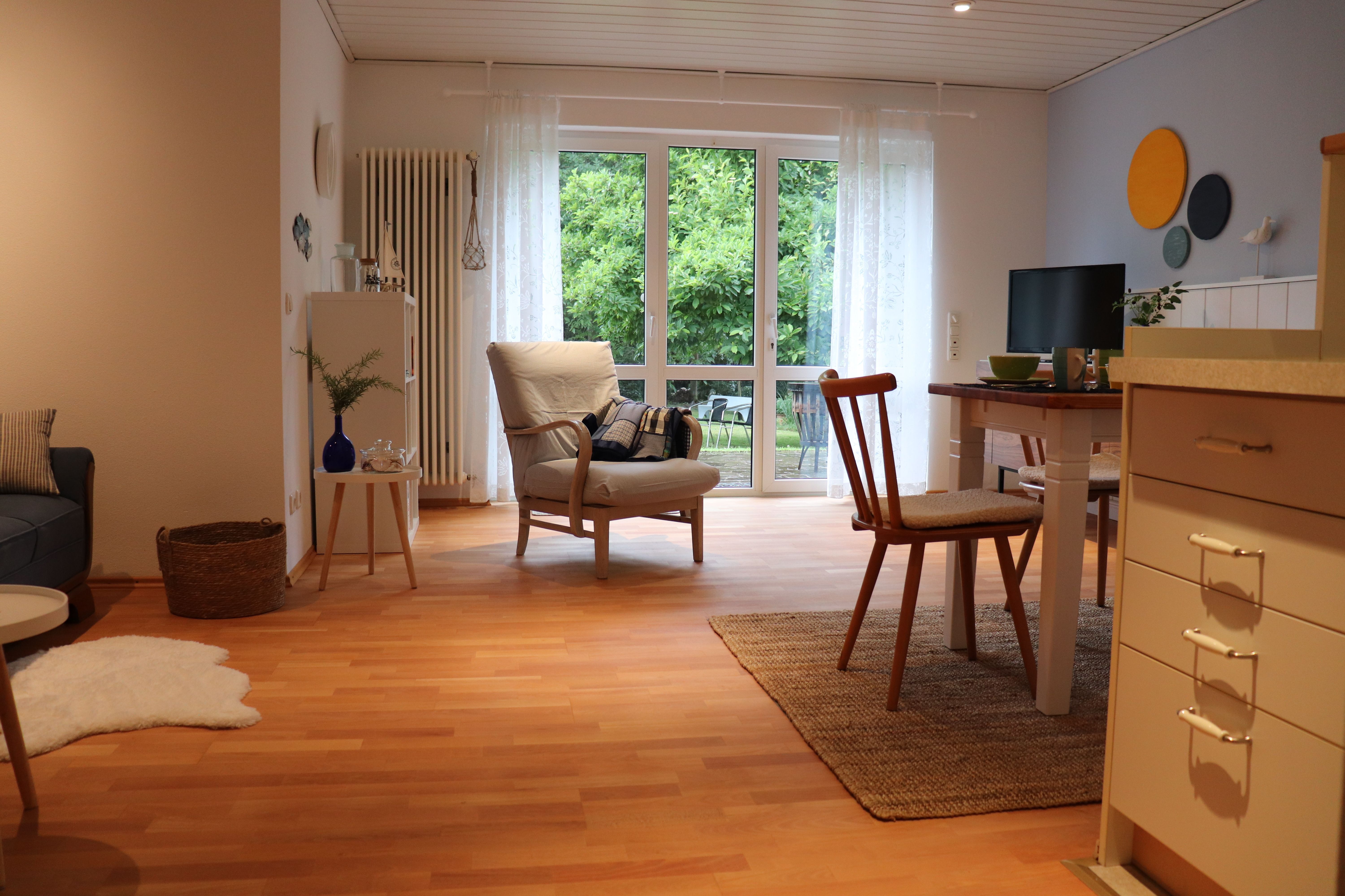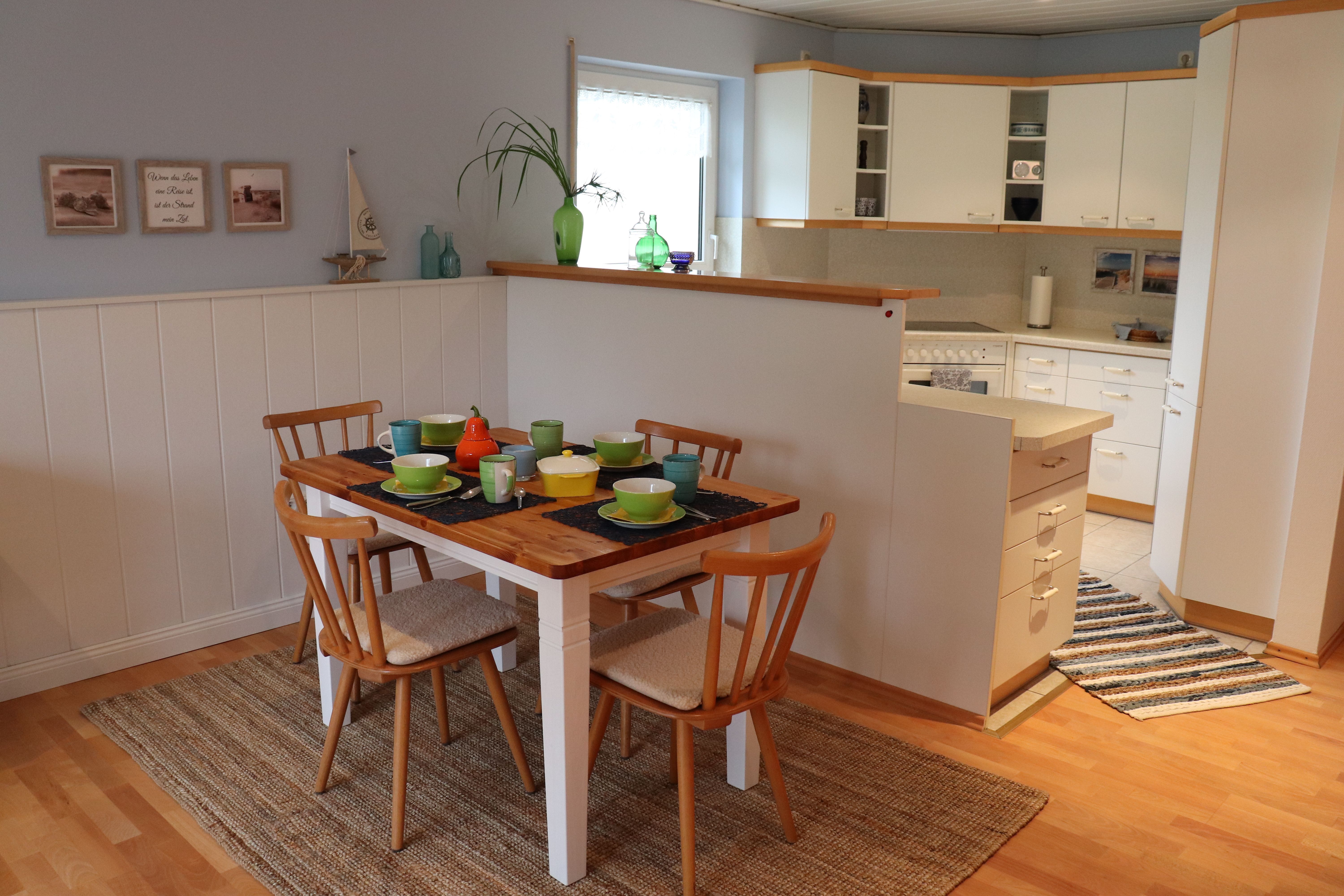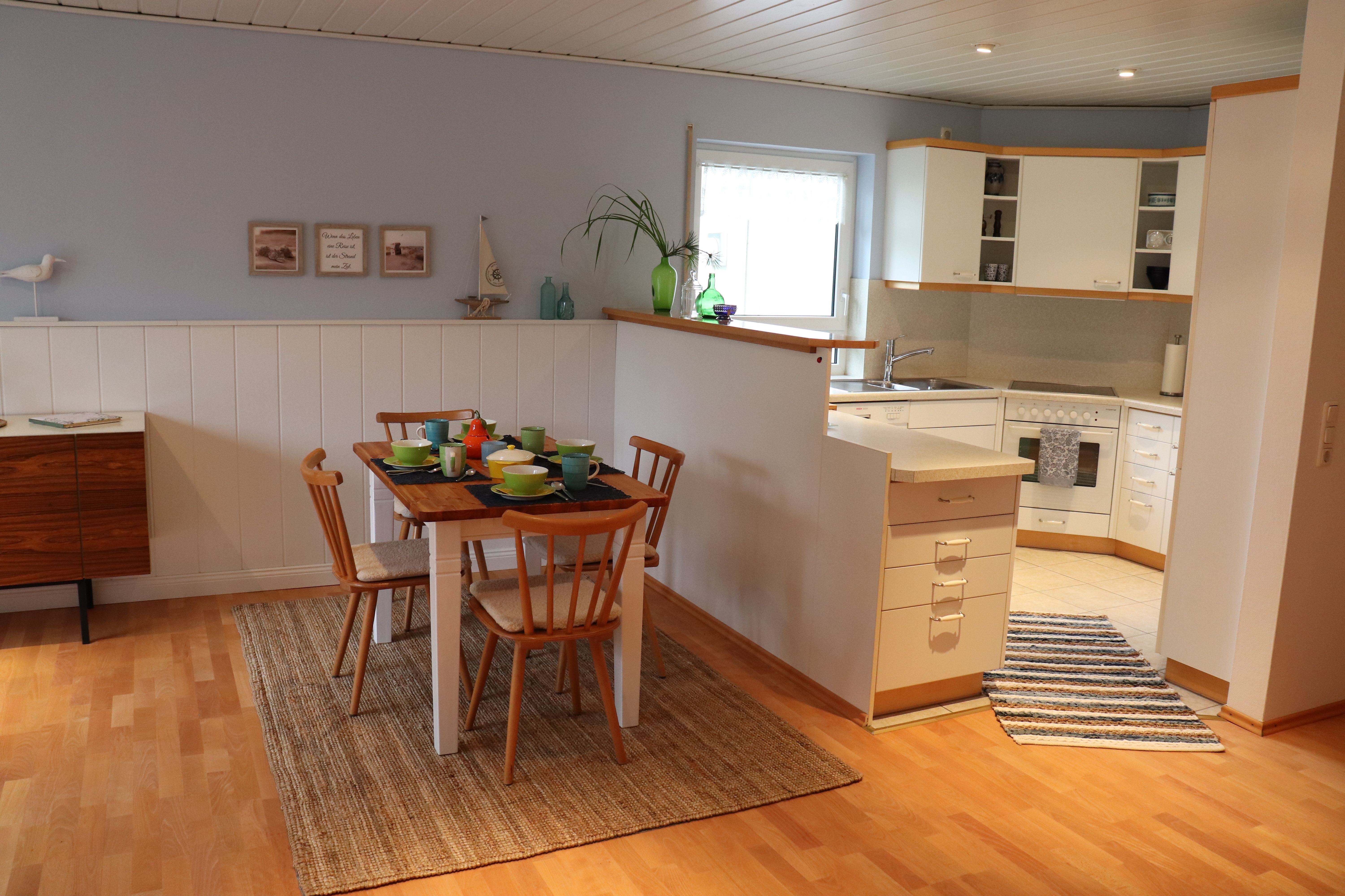 Der im Erdgeschoss befindliche Wohn- und Essbereich mit TV neben der offenen, voll ausgestatteten Küche bietet einen wunderbaren Blick in den Garten mit vorliegender Sonnenterrasse.