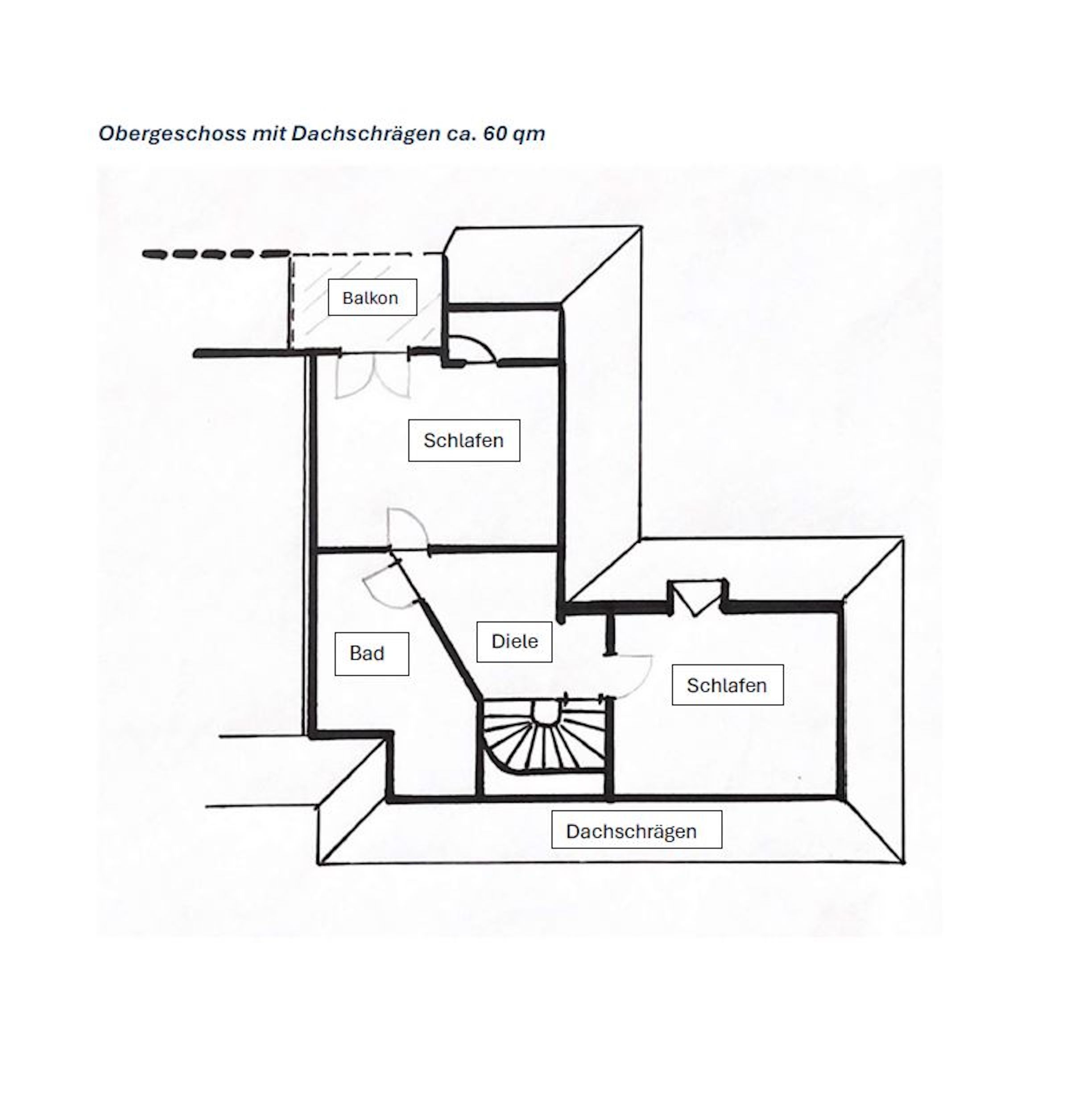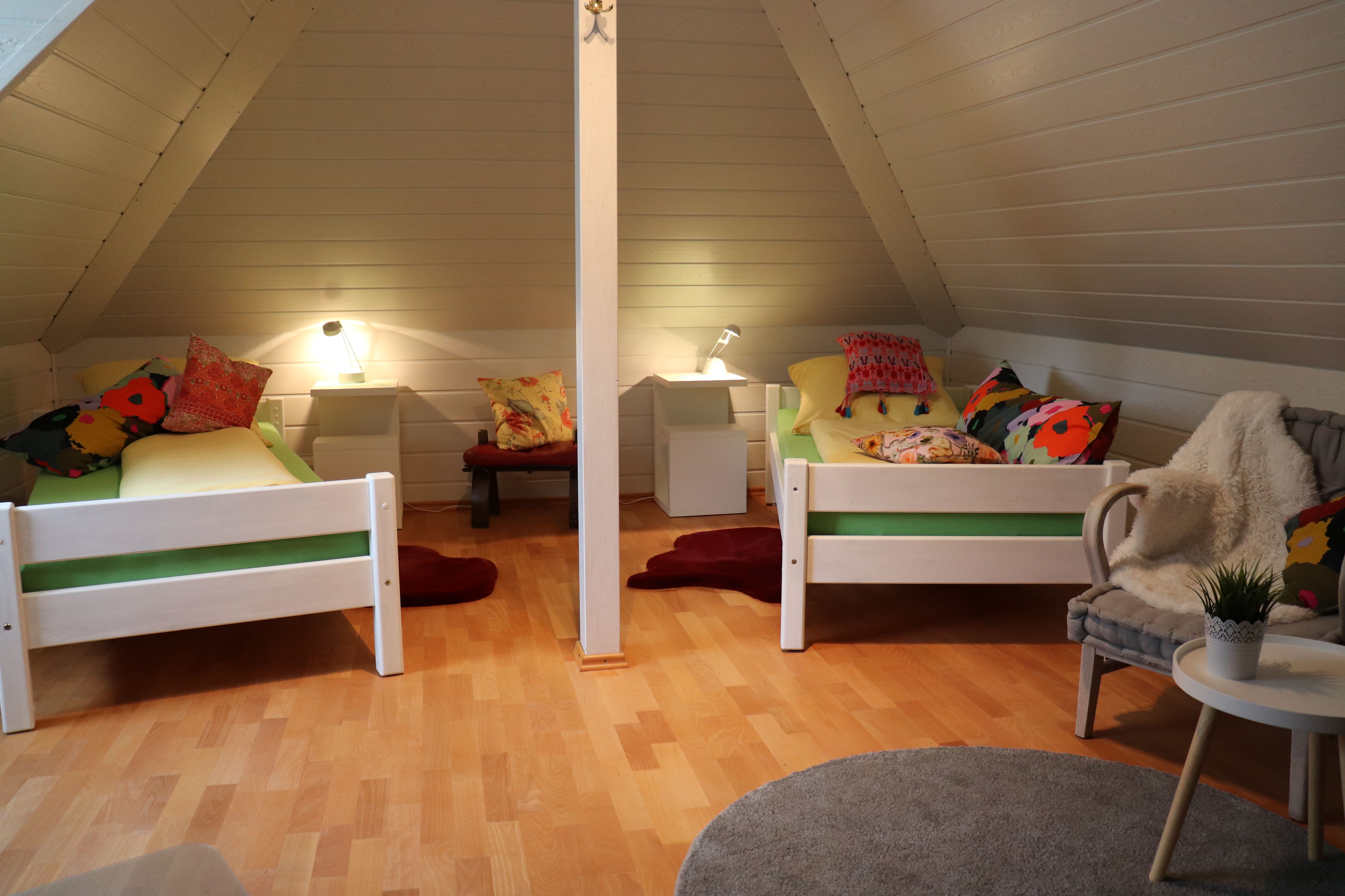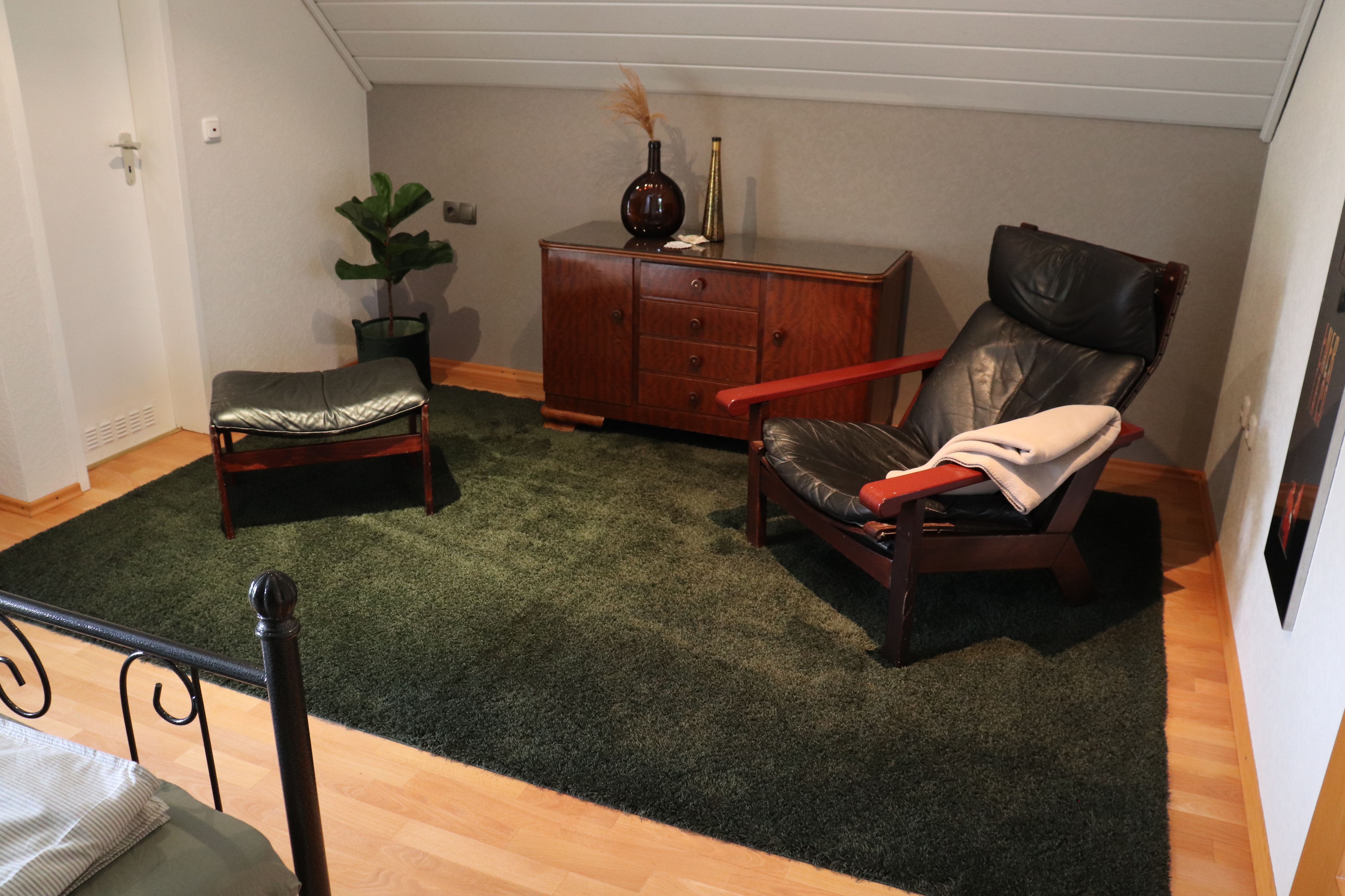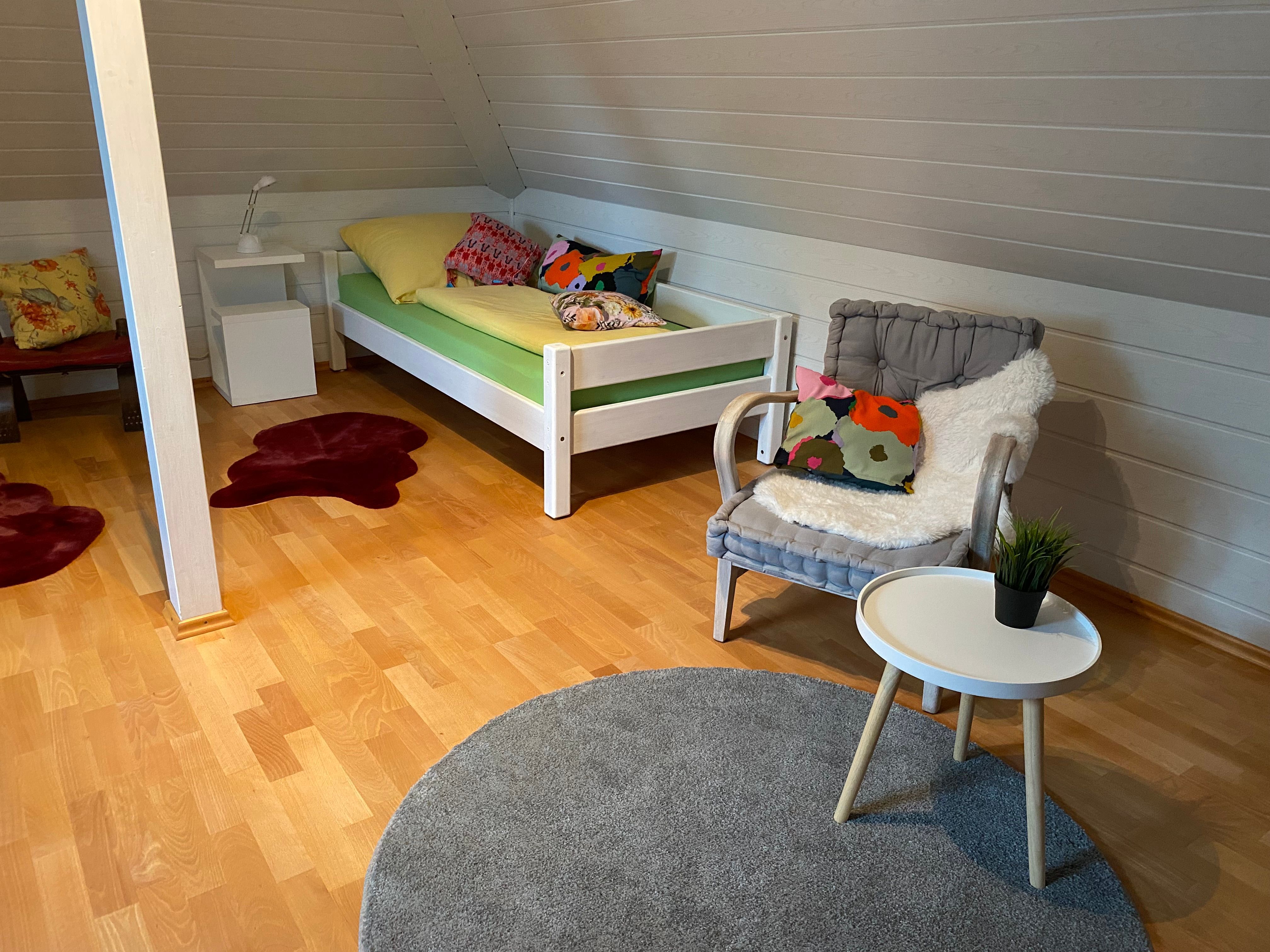Sie bietet ausreichend Platz für vier Personen. Das Schlafzimmer mit Doppelbett und Balkon und einem weiteren Schlafzimmer mit zwei Einzelbetten liegen im Obergeschoss. Ebenso das großzügige helle Badezimmer.