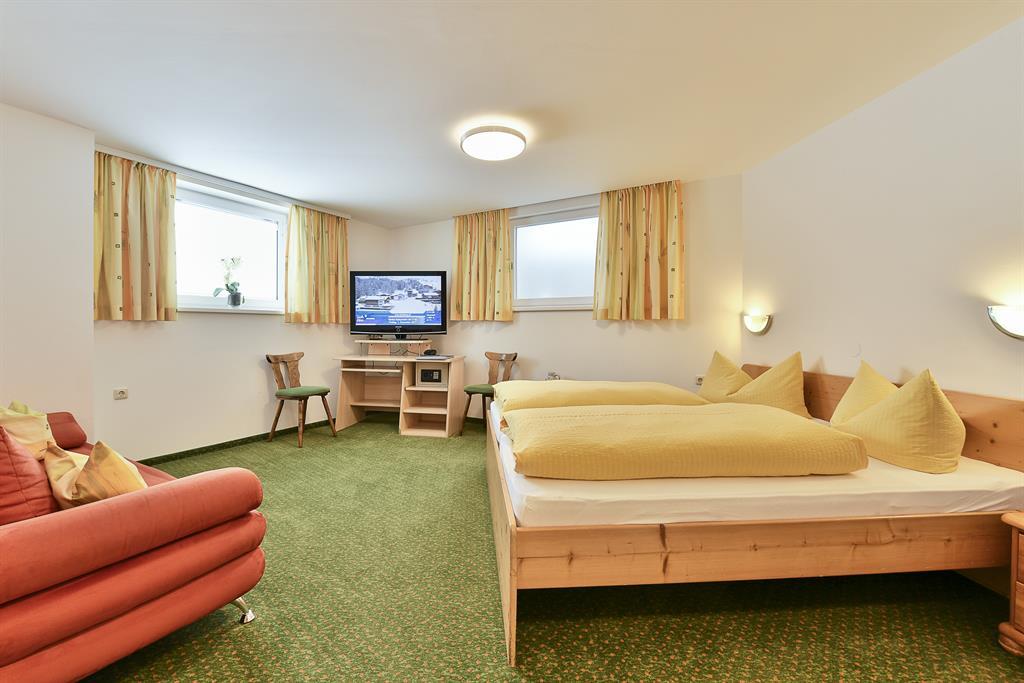 Ein grosses Mehrbettzimmer mit Sitzecke in Untergeschoss, hat TV, Telefon, Safe und einen Couch. Badezimmer verfügt über Dusche/WC/Waschbecken. Das Zimmer bekommt Tageslicht durch ein normales Fenster aber Blick auf den Omeshorn ist leicht eingeschränkt.