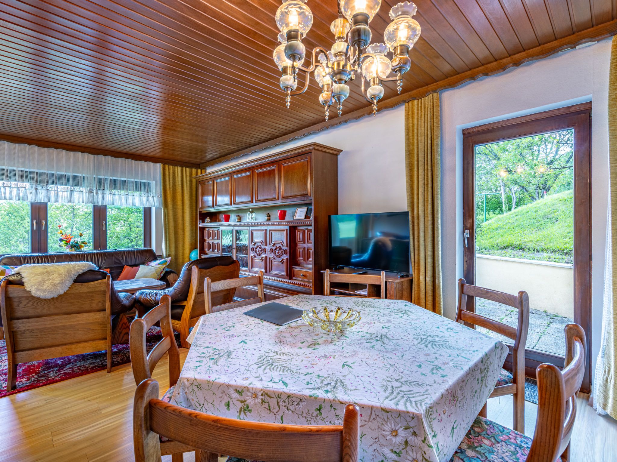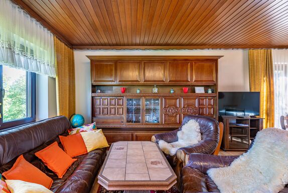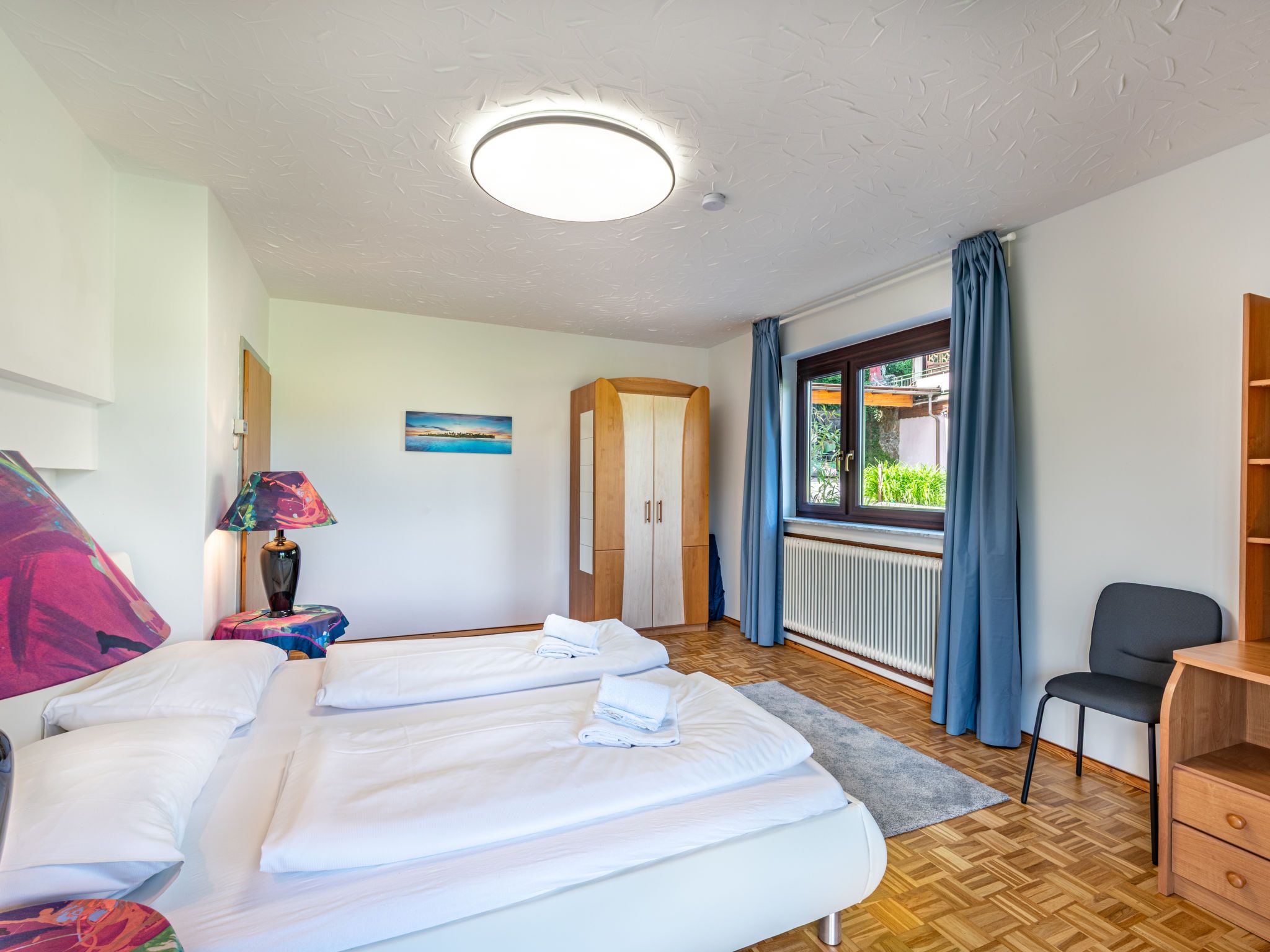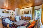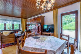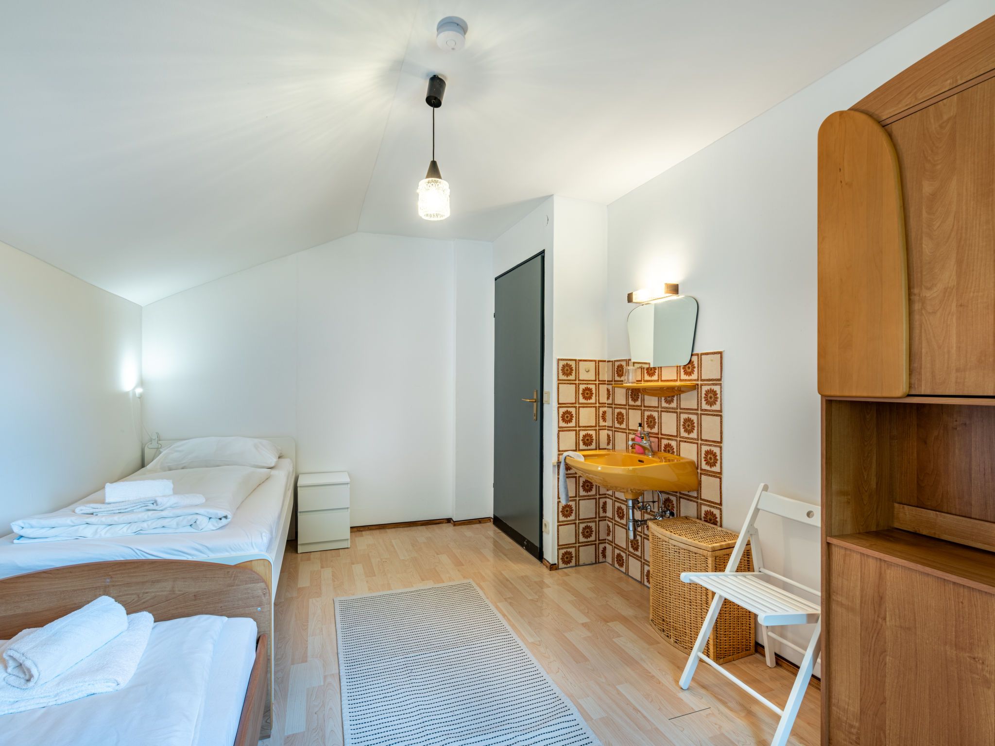 Zeitlos, 5-Zimmer-Haus 112 m2 auf 2 Stockwerken. Objekt geeignet für 8 Erwachsene + 1 Kind. Zweckmässig und gemütlich eingerichtet: Eingang. 1 grosses Doppelzimmer 16 m2 mit Vorhang mit Dusche/WC. Ausgang zum Balkon. 1 grosses Doppelzimmer mit Vorhang mit Dusche/WC. 1 abgeschrägtes Zimmer mit Vorhang mit 2 Betten (90 cm, Länge 200 cm), Waschbecken und Radio. Grosses Wohn-/Esszimmer mit Veranda mit Sat-TV, Flachbildschirm, Radio und CD. Ausgang zum Balkon, zur Terrasse. Kleine, offene Küche 7 m2 (Backofen, Geschirrspüler, 4 Glaskeramikplatten, Wasserkocher, Mikrowelle, Tiefkühler, elektrische Kaffeemaschine) mit kleinem Esstisch, Durchreiche. Bad, Bidet, sep. WC, Doppelwaschbecken. Ölheizung. Unteres Geschoss: (Aussentreppe) 1 Zimmer mit 1 Diwanbett (200 cm, Länge 90 cm), 1 Doppelbett, Bad/WC, Waschbecken, Sat-TV und Flachbildschirm. Ausgang zur Terrasse. Schöne Panoramasicht. Zur Verfügung: Waschmaschine, Kinderhochstuhl, Babybett. Internet (WLAN, gratis). Bitte beachten: Nichtraucher-Haus. Maximal 1 Haustier/Hund erlaubt.