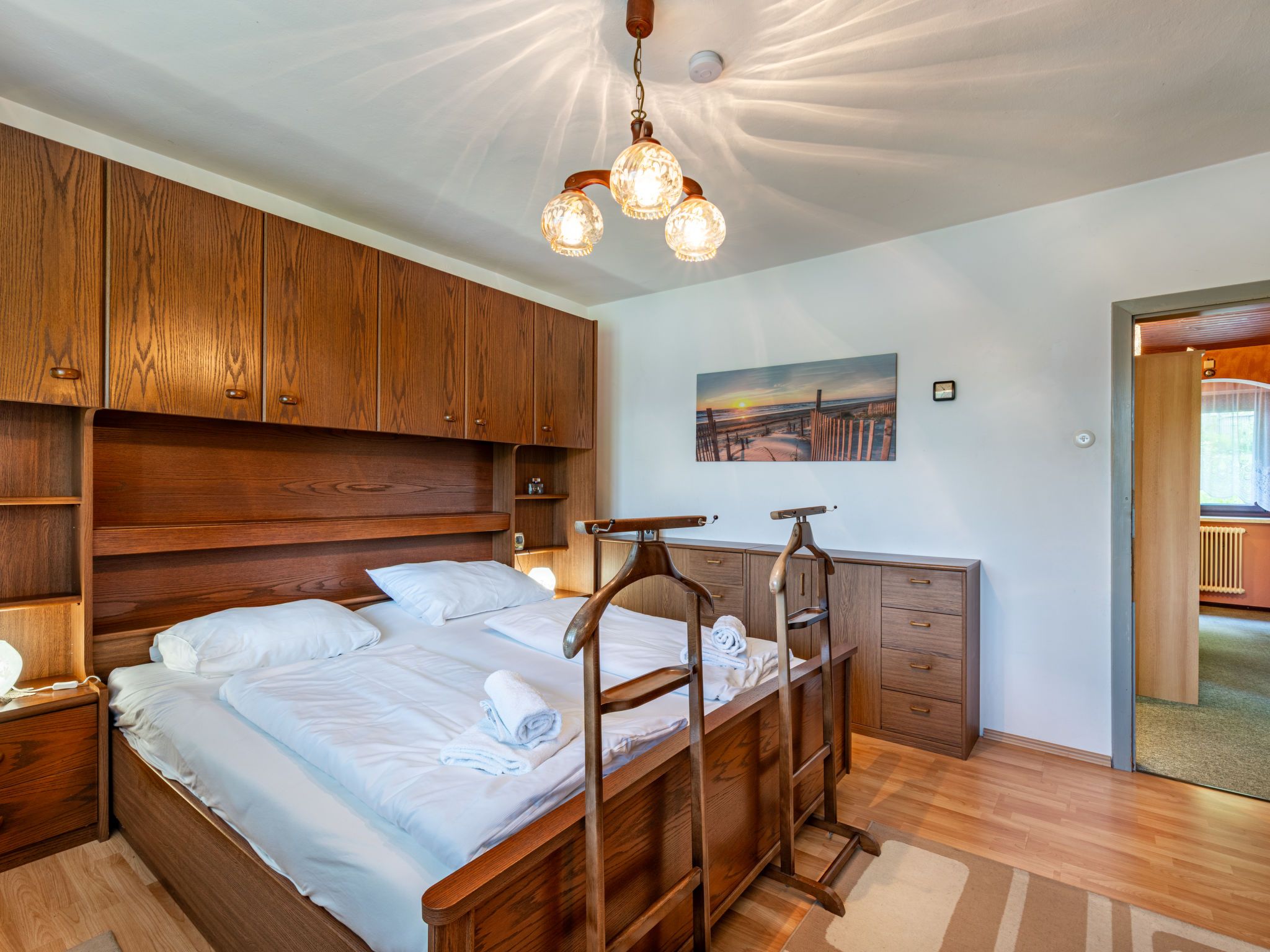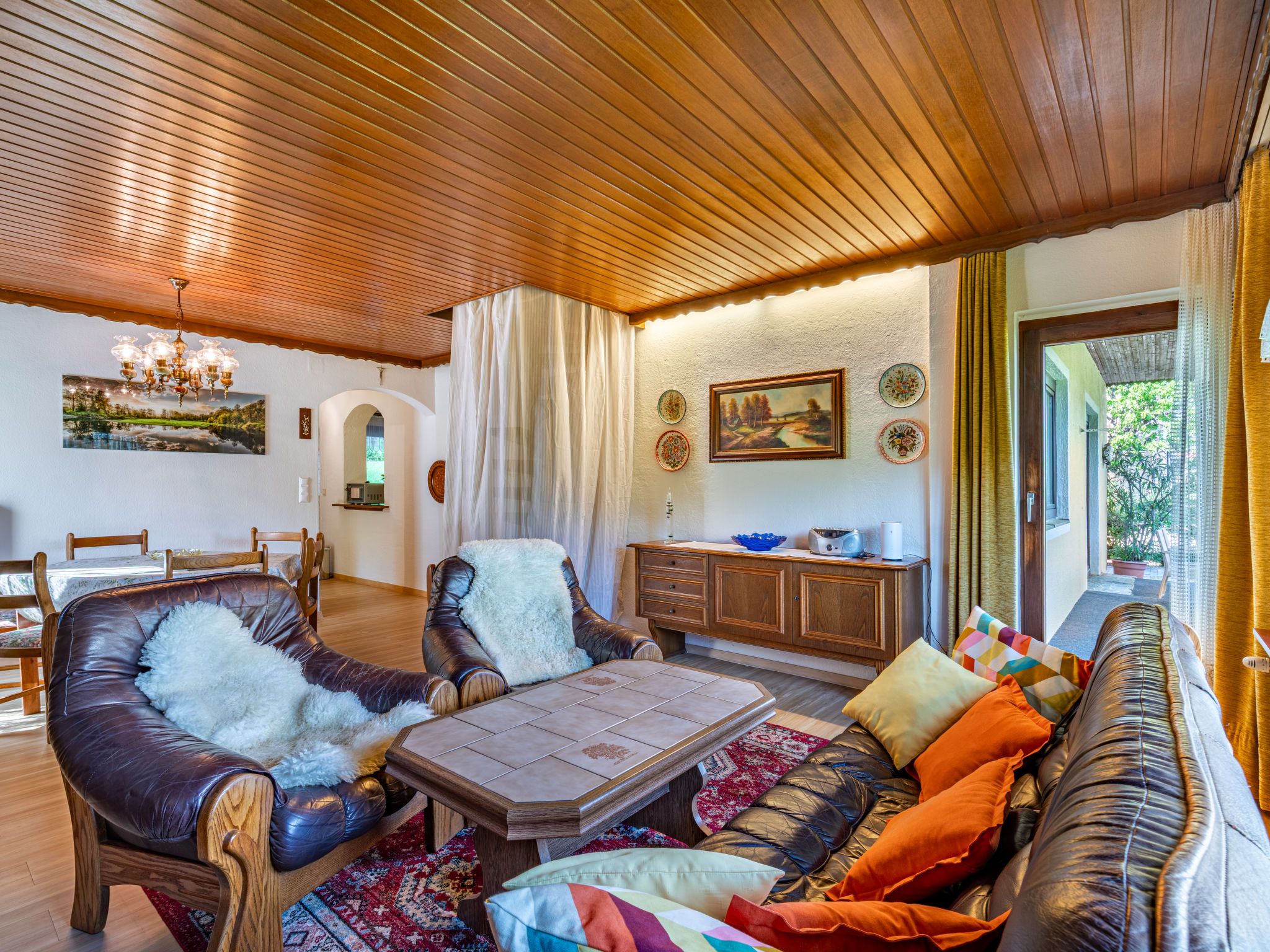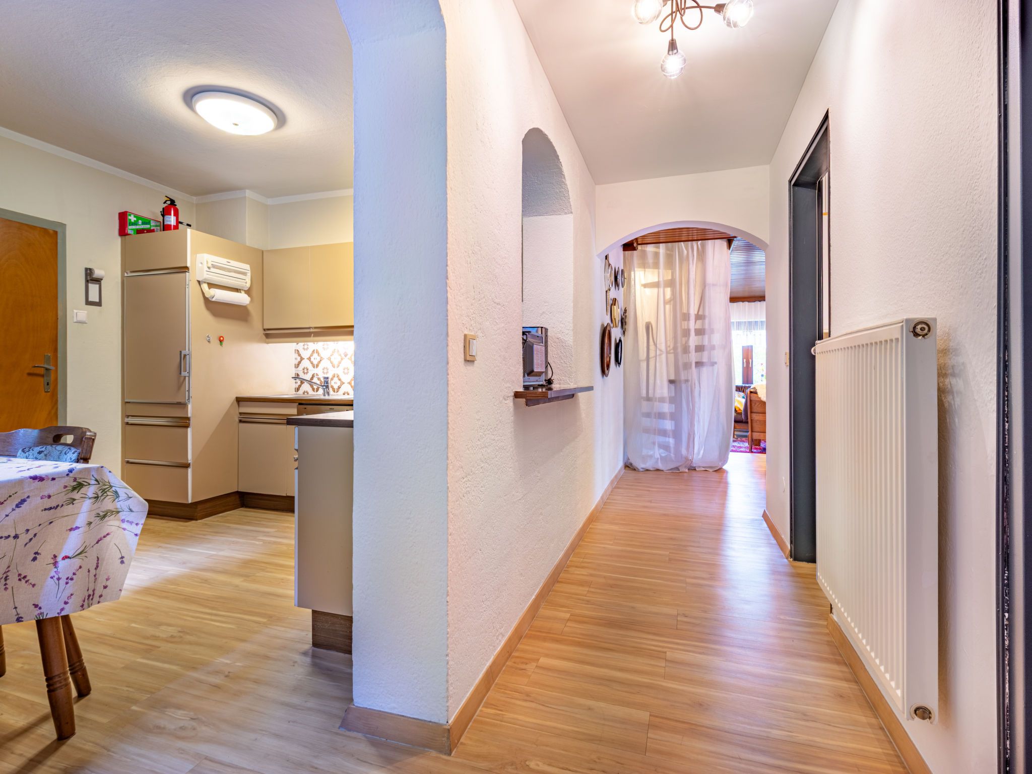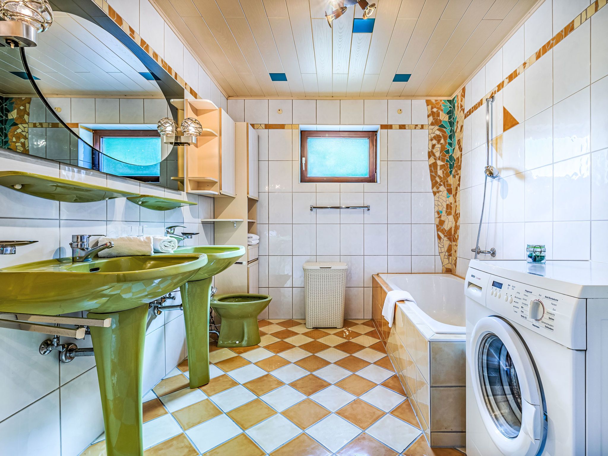 Zeitlos, 5-Zimmer-Haus 112 m2 auf 2 Stockwerken. Objekt geeignet für 8 Erwachsene + 1 Kind. Zweckmässig und gemütlich eingerichtet: Eingang. 1 grosses Doppelzimmer 16 m2 mit Vorhang mit Dusche/WC. Ausgang zum Balkon. 1 grosses Doppelzimmer mit Vorhang mit Dusche/WC. 1 abgeschrägtes Zimmer mit Vorhang mit 2 Betten (90 cm, Länge 200 cm), Waschbecken und Radio. Grosses Wohn-/Esszimmer mit Veranda mit Sat-TV, Flachbildschirm, Radio und CD. Ausgang zum Balkon, zur Terrasse. Kleine, offene Küche 7 m2 (Backofen, Geschirrspüler, 4 Glaskeramikplatten, Wasserkocher, Mikrowelle, Tiefkühler, elektrische Kaffeemaschine) mit kleinem Esstisch, Durchreiche. Bad, Bidet, sep. WC, Doppelwaschbecken. Ölheizung. Unteres Geschoss: (Aussentreppe) 1 Zimmer mit 1 Diwanbett (200 cm, Länge 90 cm), 1 Doppelbett, Bad/WC, Waschbecken, Sat-TV und Flachbildschirm. Ausgang zur Terrasse. Schöne Panoramasicht. Zur Verfügung: Waschmaschine, Kinderhochstuhl, Babybett. Internet (WLAN, gratis). Bitte beachten: Nichtraucher-Haus. Maximal 1 Haustier/Hund erlaubt.