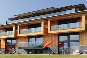Alle drei Obergeschosse dieses Ferienwohnhauses mit 6 Apartments und einem Penthouse wurden in Holzbauweise errichtet.