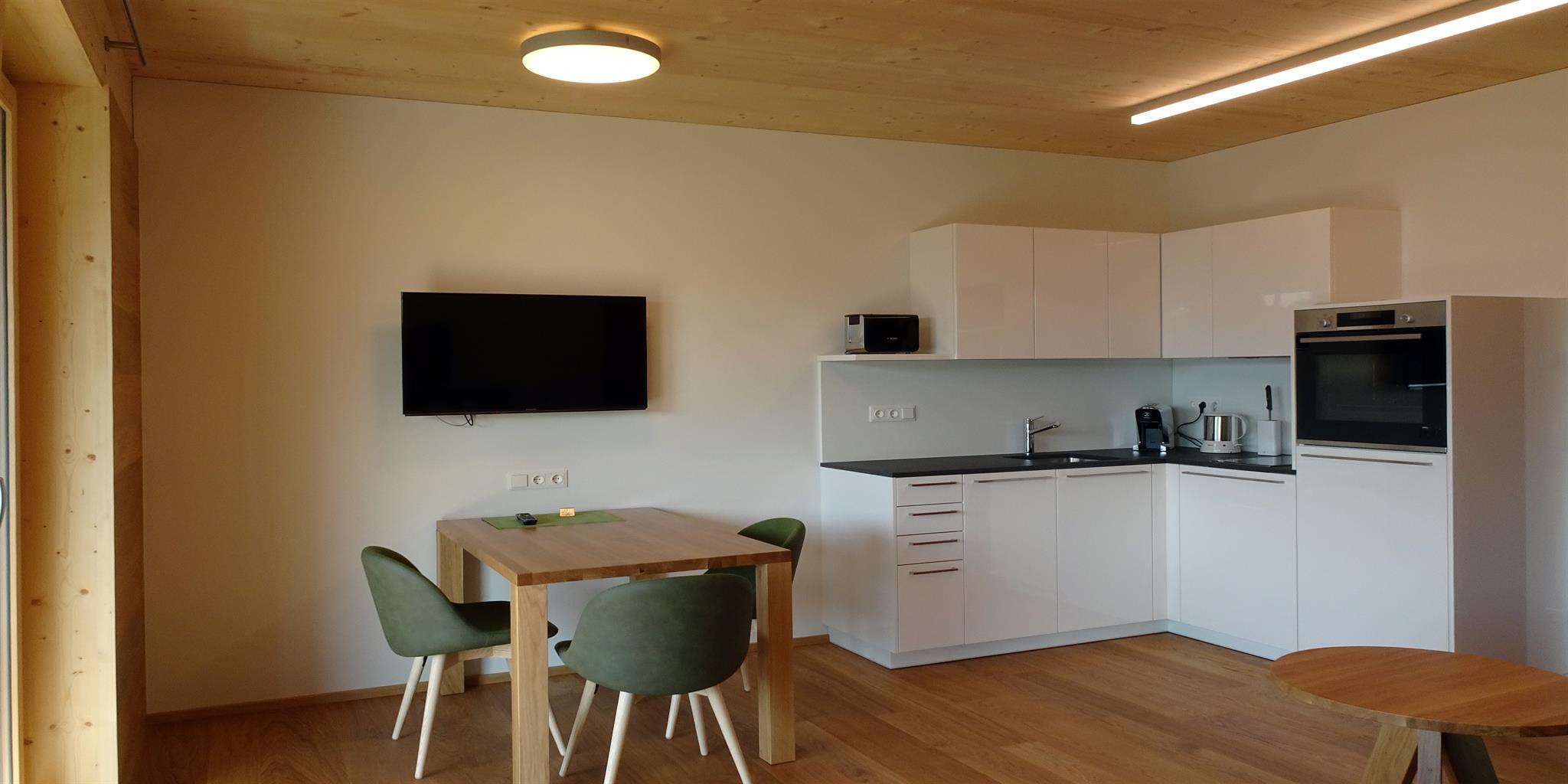 Alle Wohnungen verfügen über eine hochwertige Ausstattung mit individuell designten Eichenholzmöbeln, Küchen mit Steinplatten und bündigem Ceran-Kochfeld, Kühlschrank, Backrohr, Geschirrspüler, etc.