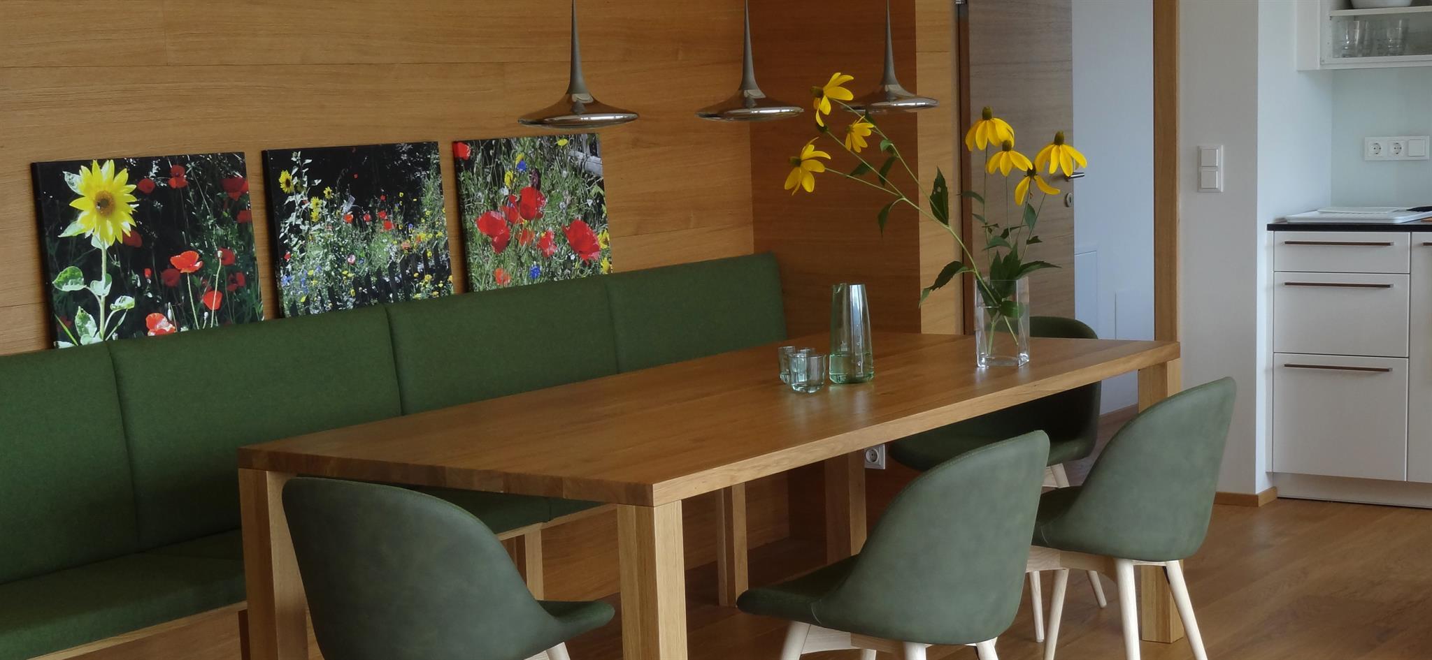 Bei der Einrichtung legen wir großen Wert auf hochwertige Materialien, harmonische Farben und heimische Hölzer wie Fichte und Eiche sowie Zirbe in den Schlafzimmern. Durch diese Raumausstattung und die Massivholzbauweise des gesamten Hauses bieten wir ihnen besonderen gesunden und behaglichen Wohnkomfort. Damit können wir Ihnen ein spezielles Wohngefühl und die nötige Entspannung in Ihrem Urlaub ermöglichen.