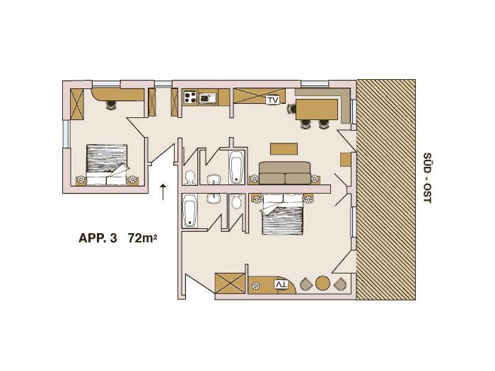 Appartement „Mohnenfluh“ (Nr. 3), im Chalet Rüfikopf, 72 m². Komfort-Appartement mit 2 Schlafzimmern (jeweils mit Doppelbett). Zwei Bäder mit Wanne oder Duschmöglichkeit, sowie zwei seperate WCs. Wohnzimer mit ausziehbarer Couch, Esstisch und großer Südost-Terasse. Küche mit E-Herd (ohne Backofen), Geschirrspüler, Toaster, Filterkaffe, Mikrowelle. Geeignet für vier Erwachsene (und zwei Kleinkinder bis 6 Jahre).