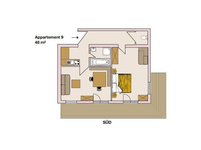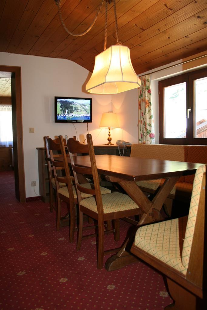 Appartement „Roggalspitze“ (Nr 9), im Chalet Rüfikopf, 48 m². Geräumige Wohnung für eine Familie, bestehend aus einem Doppelschlafzimmer, einem Wohnzimmer mit Ausziehcouch für eine weitere Person, schöner Esstisch und Küche mit E-Herd (ohne Backofen), Geschirrspüler Toaster, Filterkaffekanne etc. Badezimmer mit Bad und Dusche sowie ein seperates WC. Großer Süd-Balkon. Geeignet für zwei Erwachsene (und zwei Kleinkinder bis 6 Jahre).