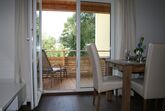 Die Ferienwohnung 2 befindet sich im Erdgeschoss, hat ein Schlafzimmer mit Doppelbett und einer Relaxliege, eine Küche (ohne Geschirrspüler) mit Esstisch und ein Bad. Hier hat man einen geräumigen Balkon mit Sonnenliege und Essplatz.