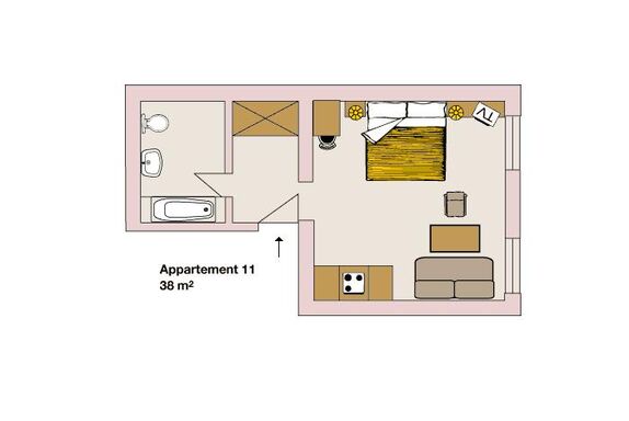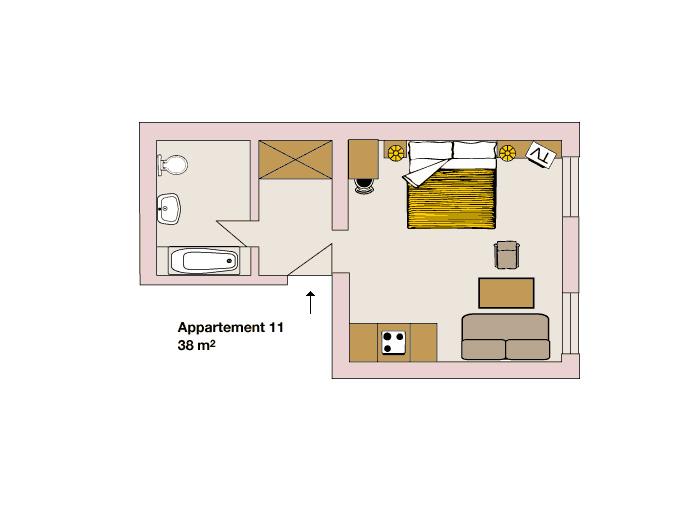 Gemütliches Appartement für 2 Personen, bestehend aus einem großen Wohn-Schlafraum mit Doppelbett, Sitzecke mit Esstisch und Couch. Integrierte Küchenzeilze (E-Herd ohne Backofen, Filterkaffekanne, Toaster, usw.); Badezimmer mit großer Dusche und WC.