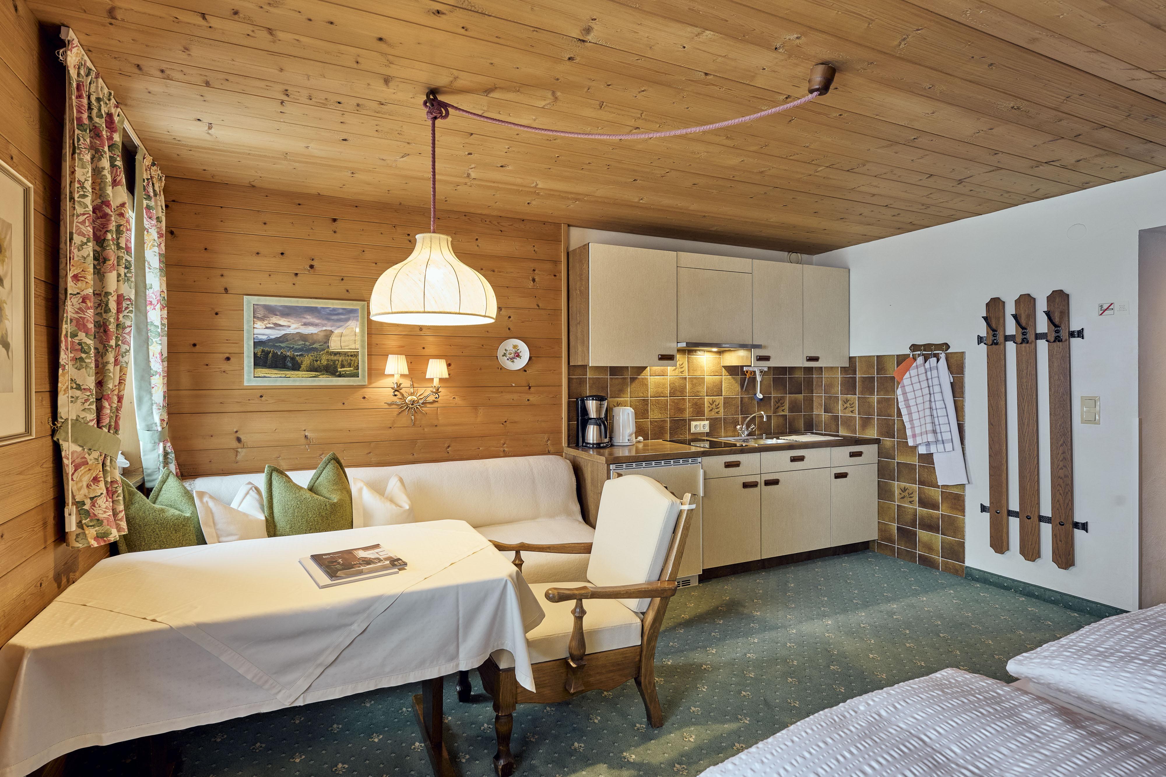 Wir bieten komfortable NICHTRAUCHER-Appartements an- alle bis auf eines mit Balkon zur Süd-und Westseite, mit Service - tägliches Saubermachen (2-3mal pro Woche im Sommer), Brötchenservice, Sauna, Dampfbad, Kinderbetten und Stühle, Schlitten, Schuhheizung. Im Sommer auch Fahrräder für Groß und Klein, Tischtennis, Gartengrill.