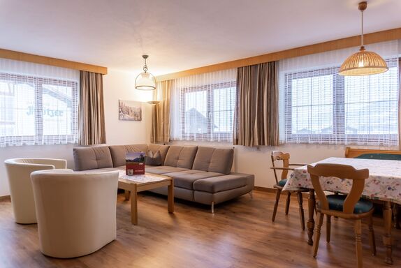 Wohnzimmer mit separatem Essplatz und großer Wohn-Schlafcouch, SAT-TV,