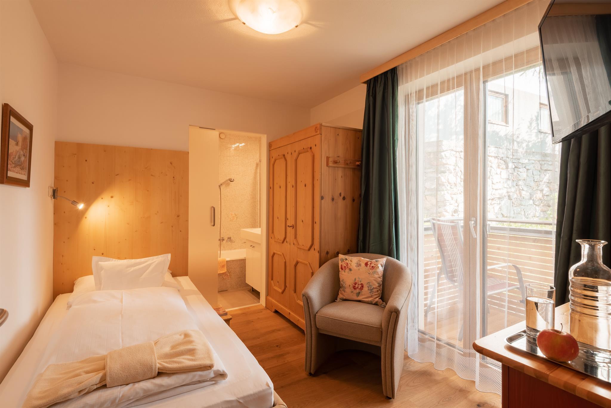 20m², für 1 Person, auch als Doppelzimmer möglich (für Frischverliebte). Überdachter Balkon, kuscheliges Giebel-Zimmer mit Gaupe und Blick auf den Lecher Kirchturm, Bett 160cm breit, mit Dusche, Waschbecken, WC. WLAN, TV, Telefon, Partykühlschrank, Safe, Bademantel & Badepantoffel.