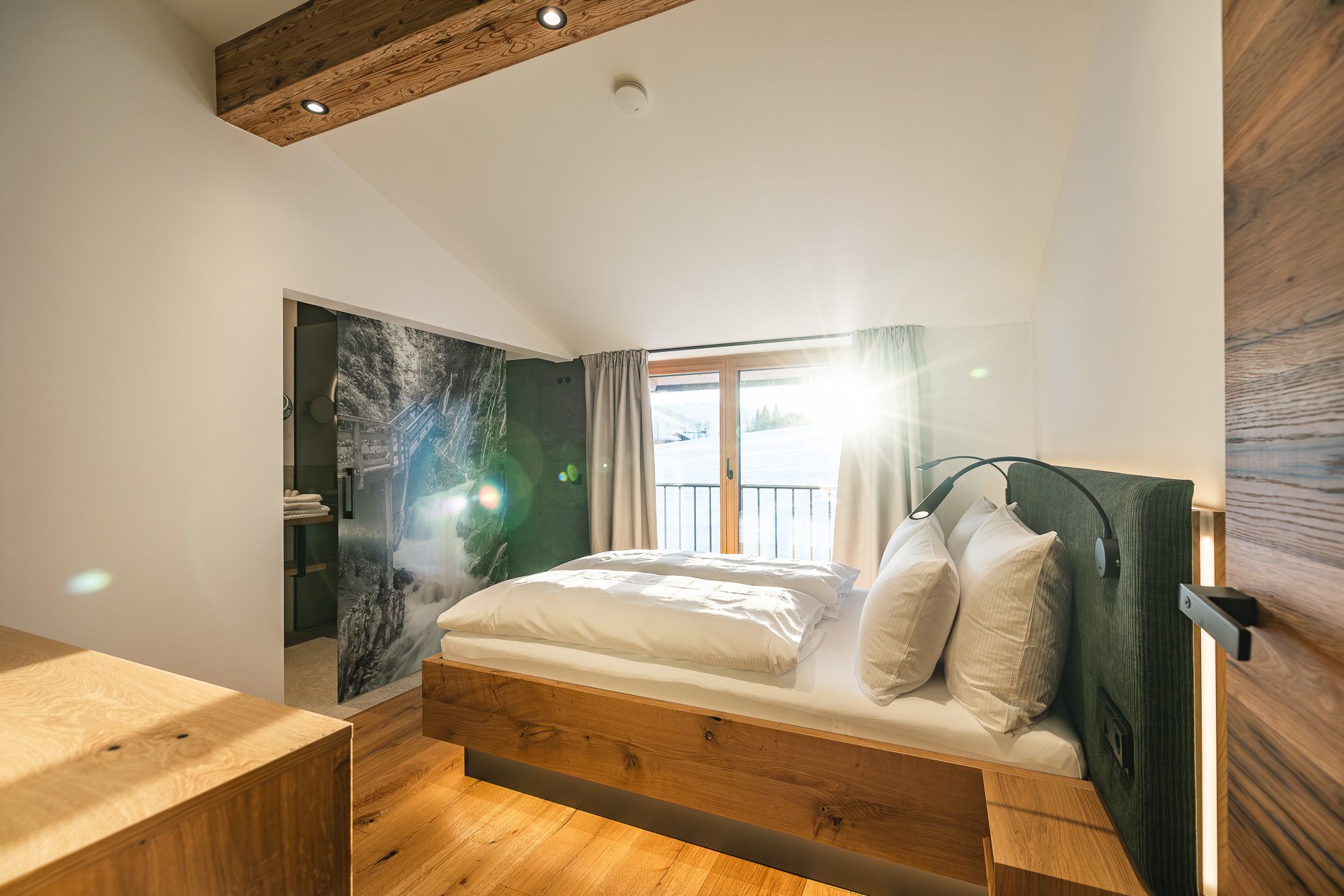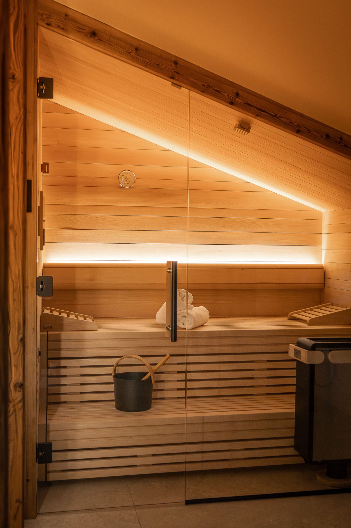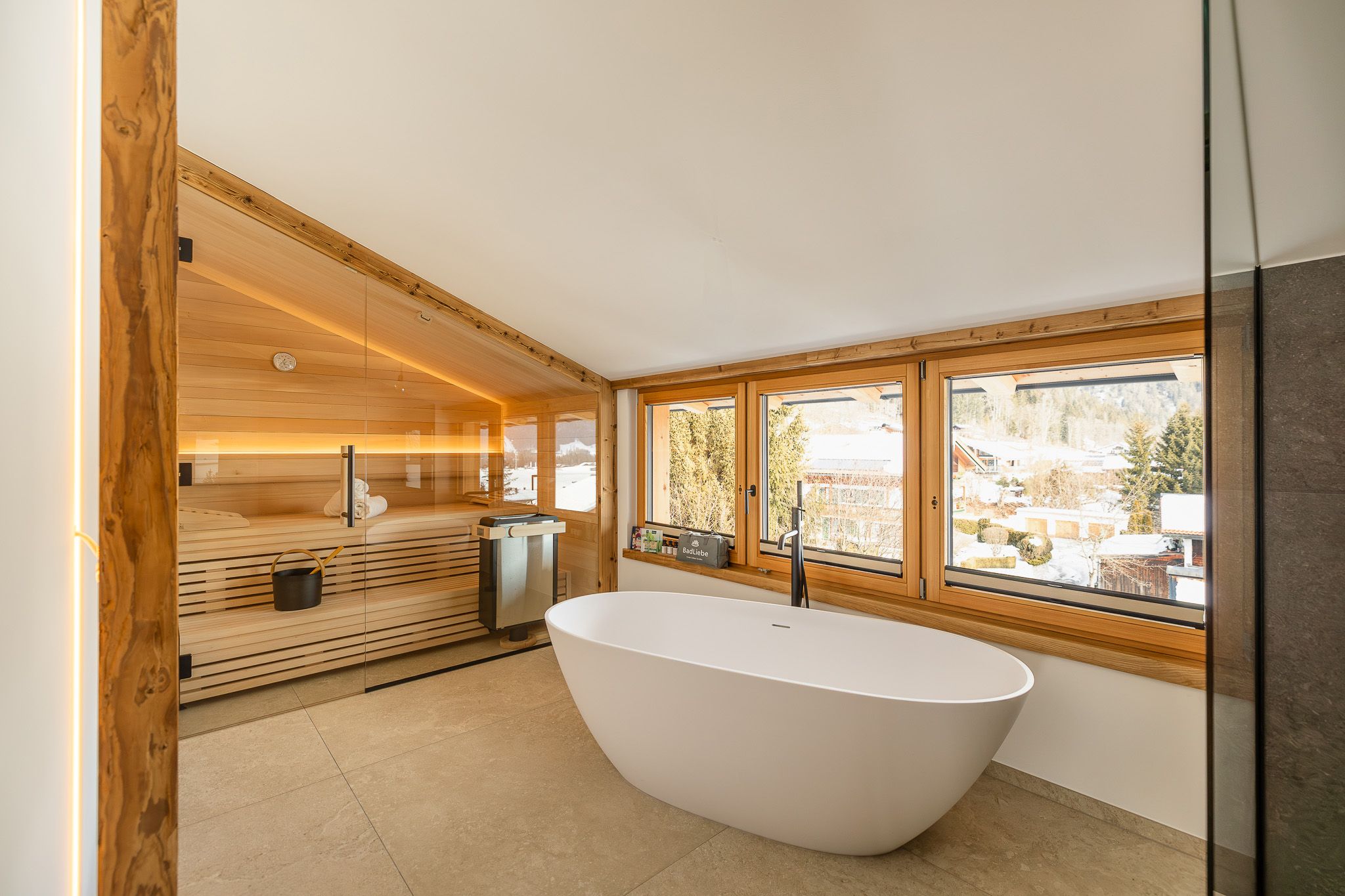 Für weitere Entspannung, bietet der Wellnessraum mit einer traditionellen finnischen Sauna, freistehender Badewanne & angenehmer Beleuchtung die perfekte Voraussetzung zum Abschalten.