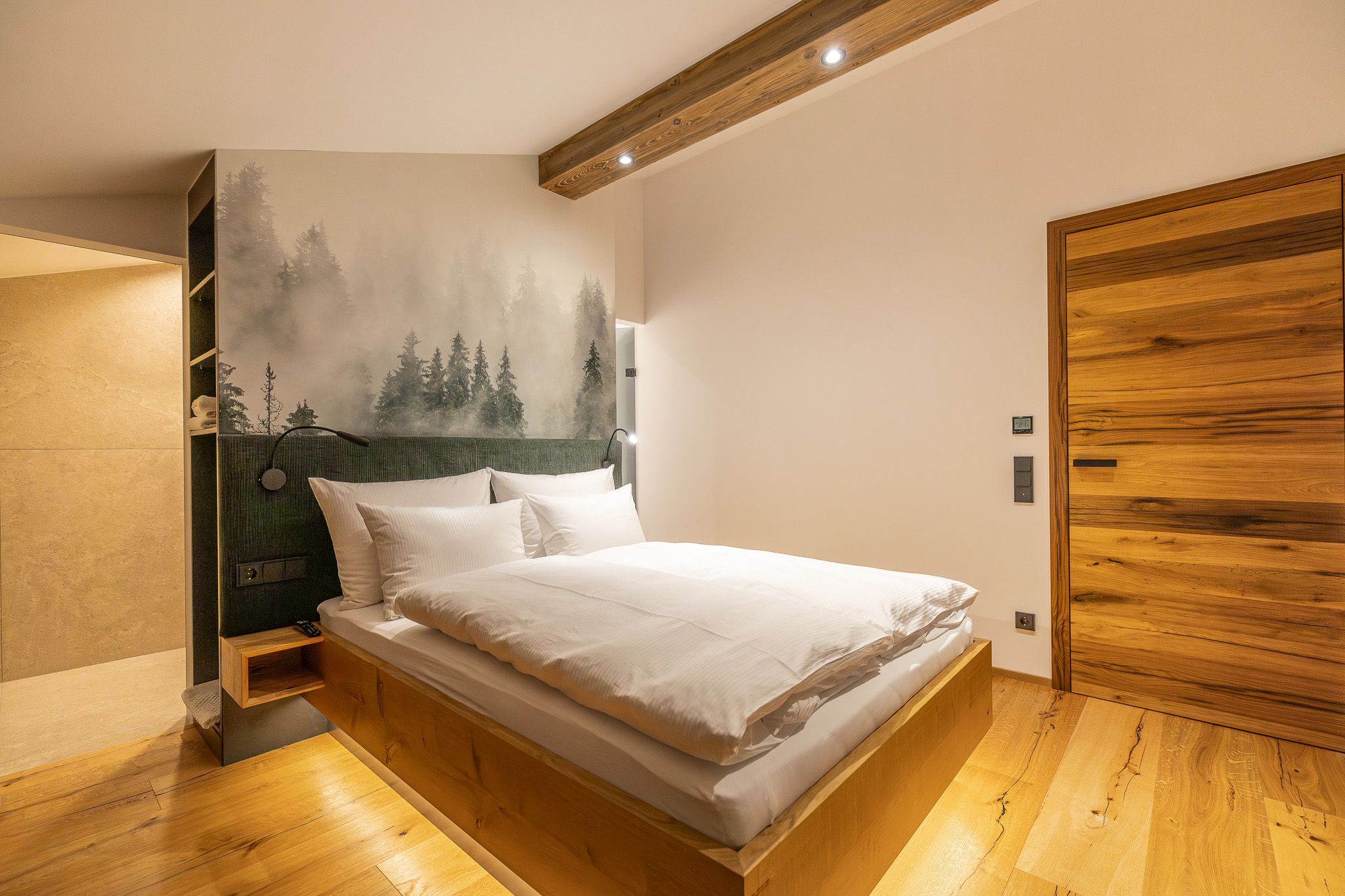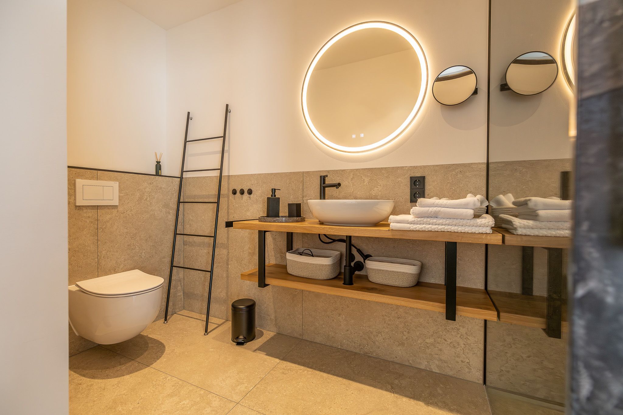 Um dem gehobenen Komfort gerecht zu werden, gibt es pro Schlafeinheit ein seperates Badezimmer. Ebenerdige Duschen, Waschtische, WC´s, 3-Stufen einstellbare LED Spiegel, Kosmetikspiegel, Fön & sonstiges Zubehör sorgen fürs Wohlbefinden.
