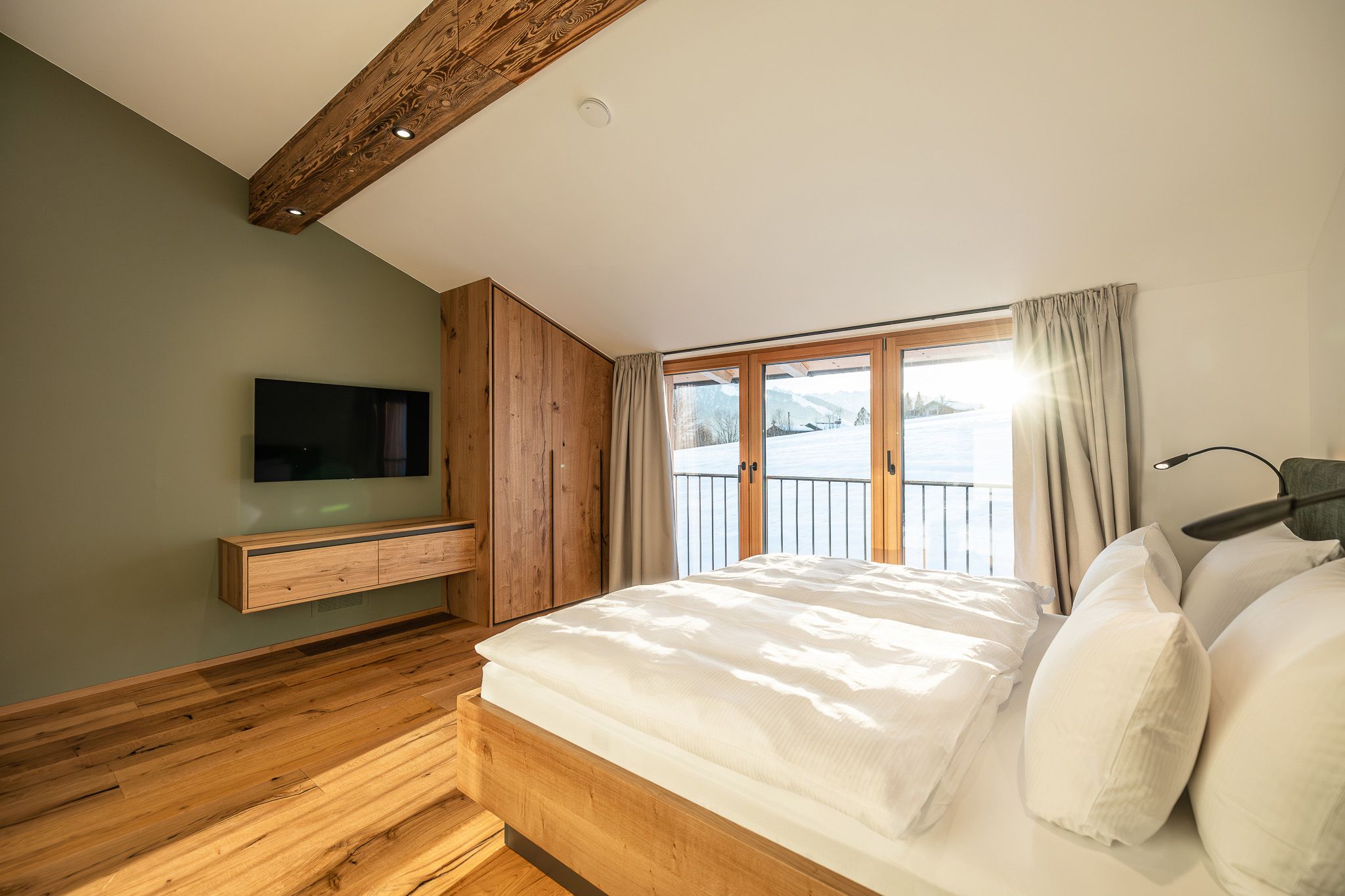 Jedes Schlafzimmer besitzt eine hochwertige Ausstattung sowohl schlaftechnisch als auch funktional. Um eine angenehme Atmosphäre zu schaffen, sind die Betten indirekt beleuchtet und verfügen über gut einstellbare Leselampen sowie auch Steckdosen mit integrierten USB und USB-C Anschlüssen. Zwei der Schlafzimmer besitzen einen modernen Smart-TV inklusive einem großen Streamingangebot (Magenta TV). Es sind in jedem Schlafraum Einbauschränke für die Kleidung vorhanden.