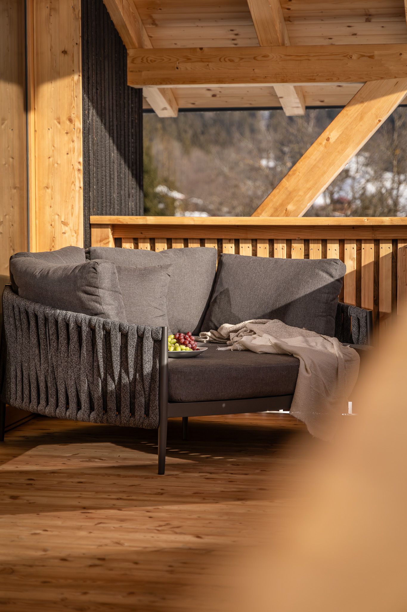 Direkt am Wohnzimmer anbindend, befindet sich der großzüge Balkon mit 20 Quadratmetern. Dabei gibt es ganzjährig eine Entspannungs & Liegelounge. Bis auf den Winter haben Sie die Möglichkeit bei der Sitzloungecke Platz zu finden, um bei dem ein oder anderen Getränk die Aussicht zu genießen.