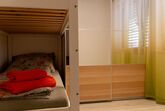 Waschbecken. In diesen steht ein Doppelbett, im Dritten ein großes Stockbett. Einen