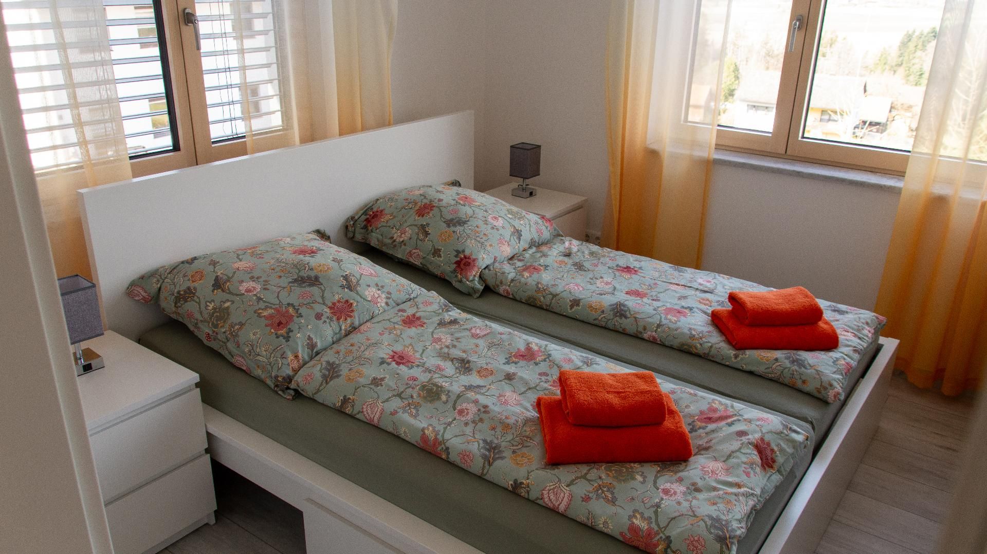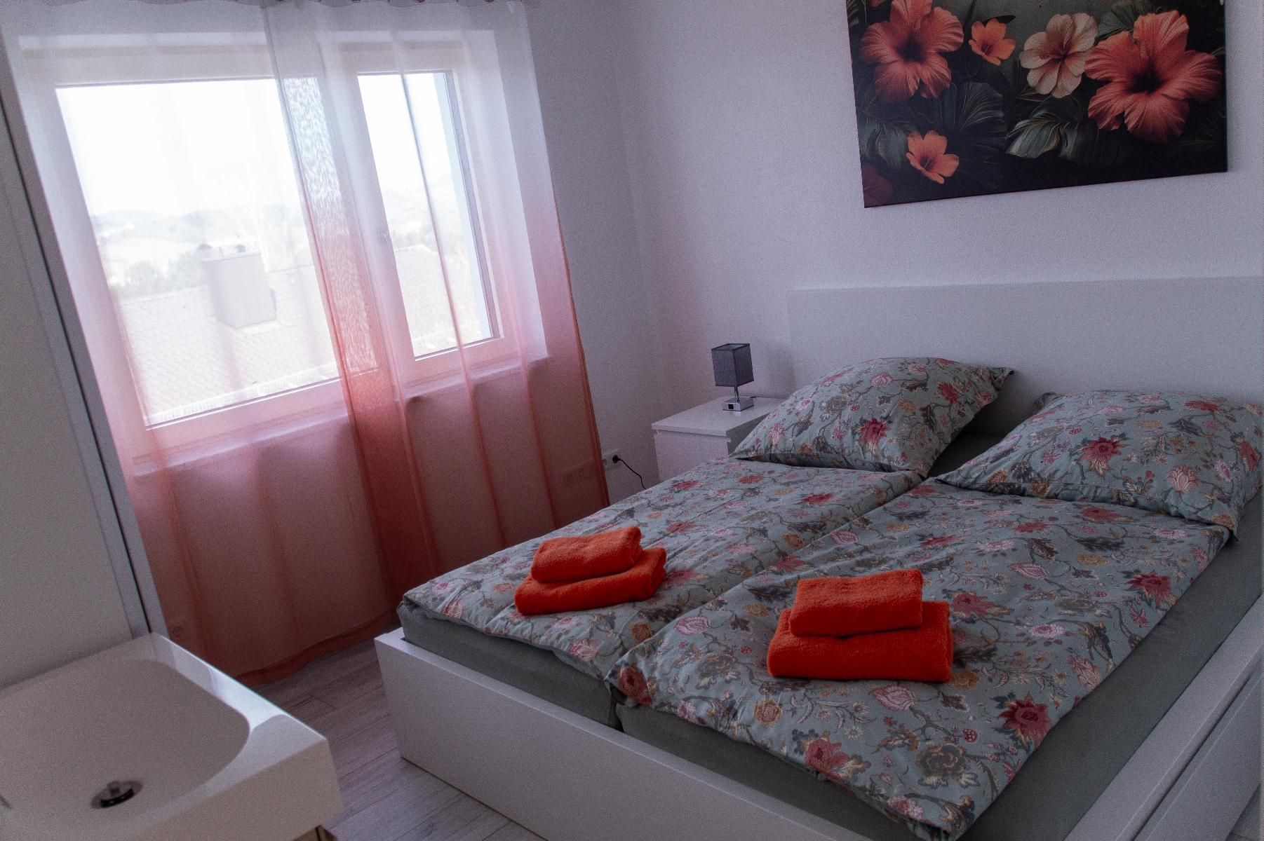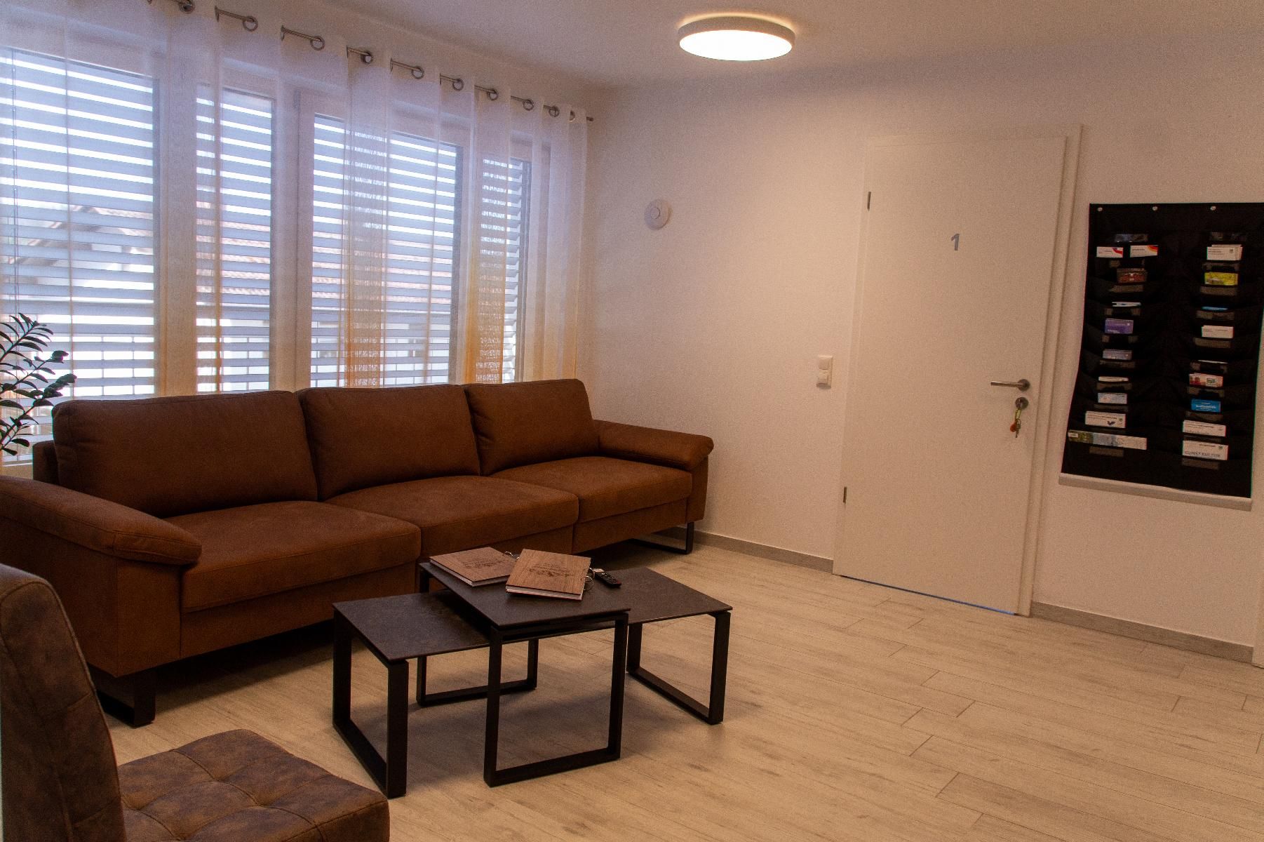 Kleiderschrank mit Spiegel finden Sie in jedem Zimmer. Somit können bis zu 6 Personen bei uns übernachten. Im Wohnzimmer befindet sich eine großzügige Couch und ein großer TV mit WAIPU TV. Ebenfalls gibt es ein hochmodernes Bad mit Dusche,