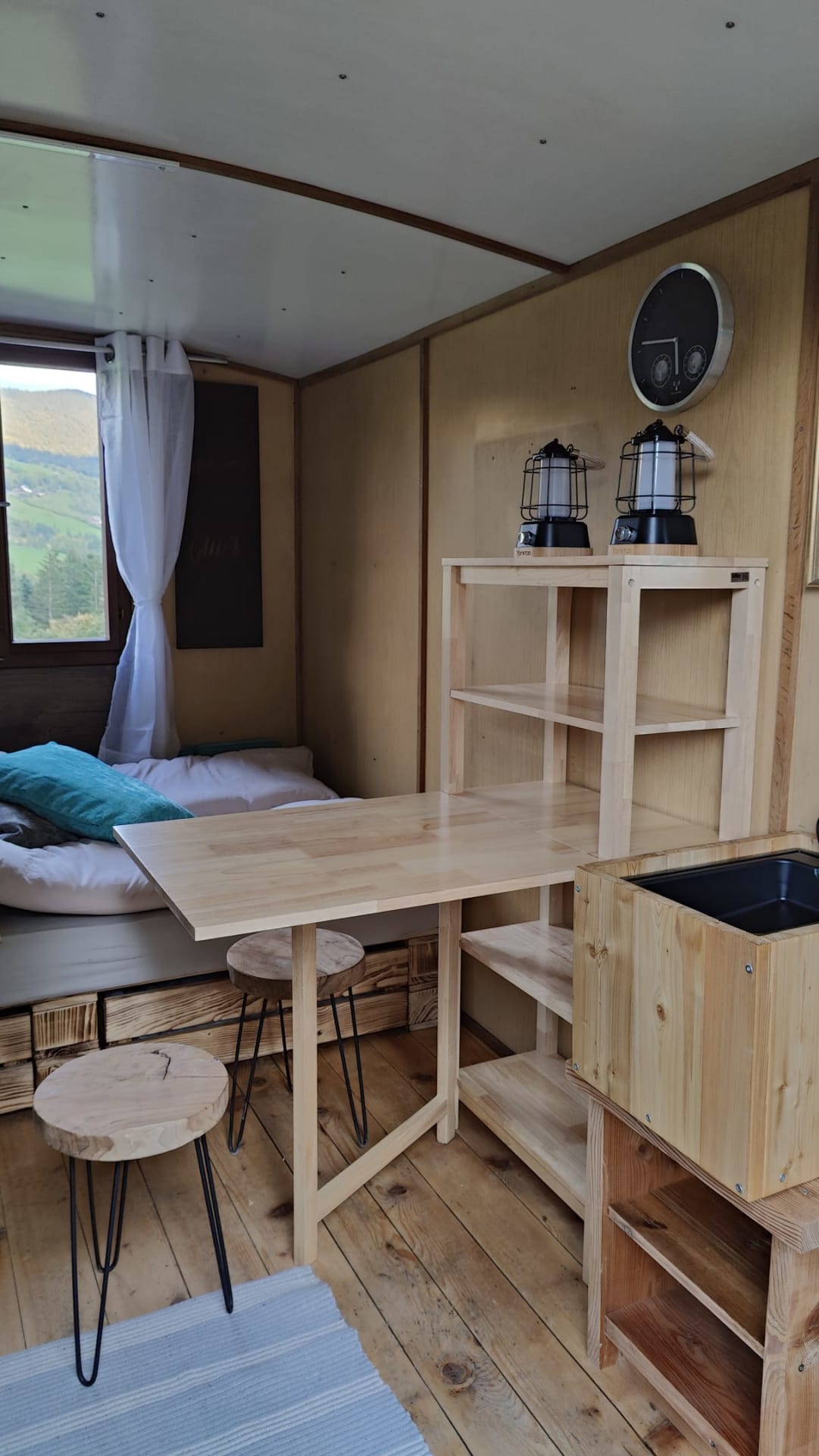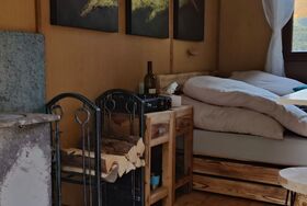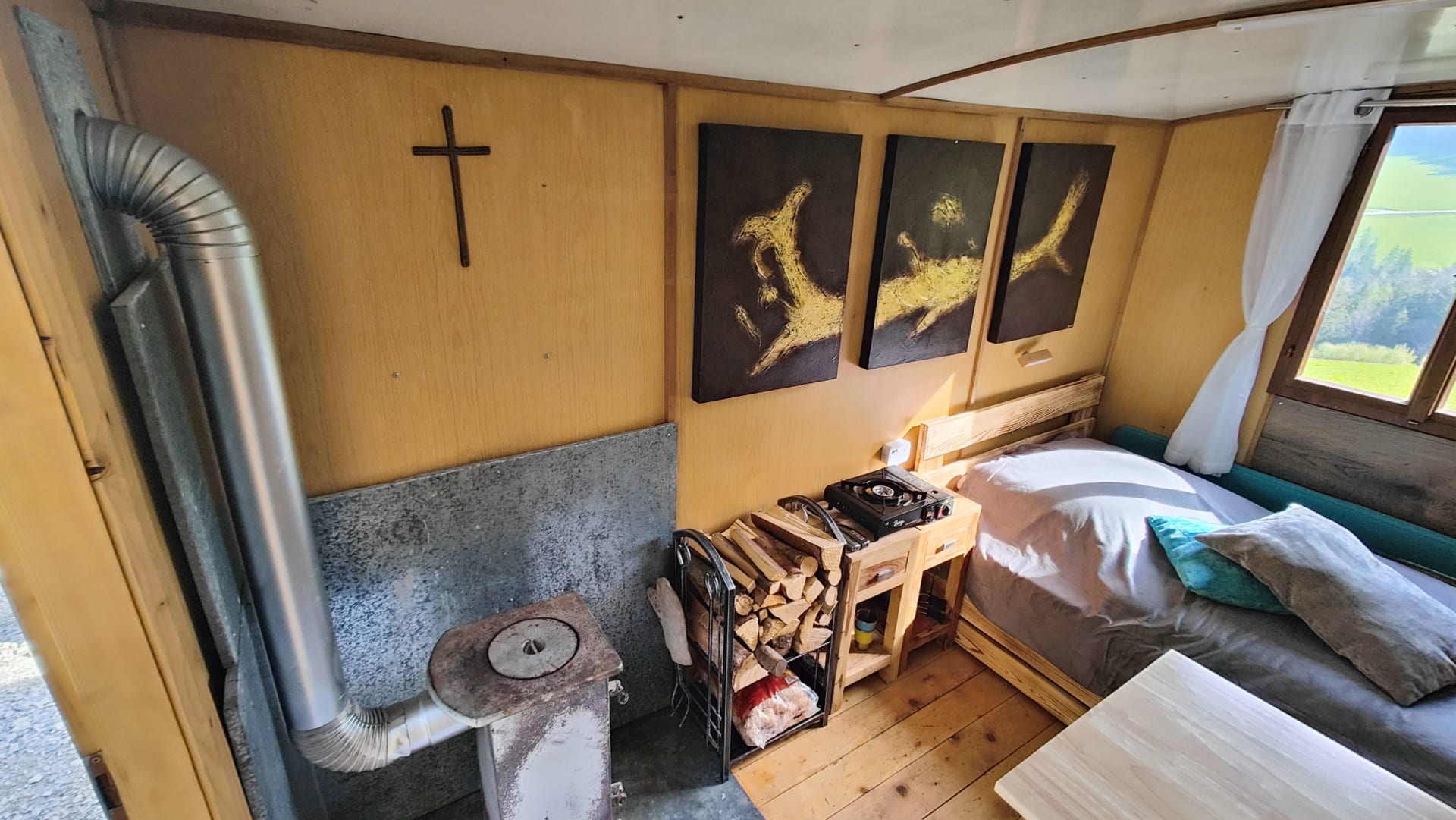 Der Wohn-Schlafraum verfügt über ein kleines Campingwaschbecken, eine kleine Küchenecke mit einem Gaskocher und Campinggeschirr, einem Doppelbett und auch einem sehr gemütlichen Holzofen.
