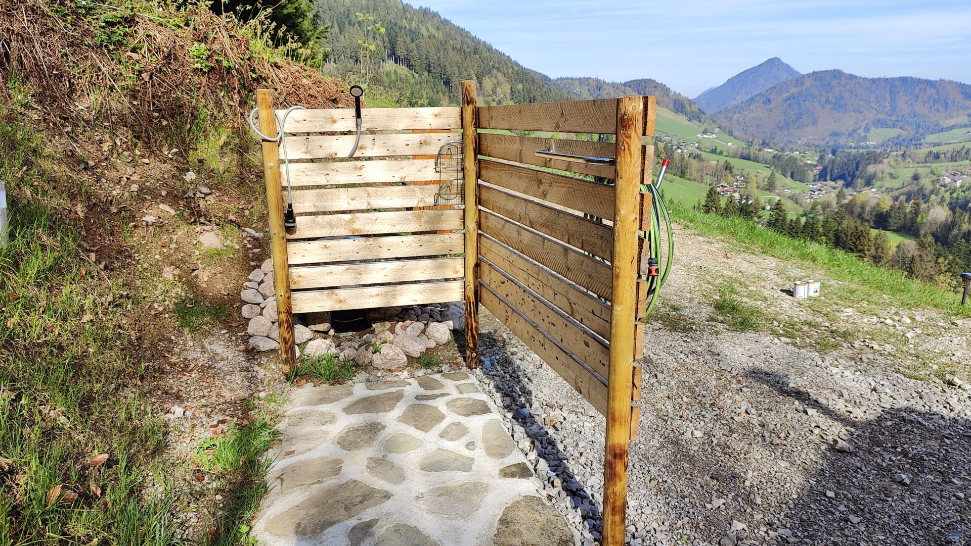 Besonders charmant: Zum Duschen habt ihr die Wahl zwischen einer Open-Air-Dusche unter freiem Himmel oder einem Duschzelt, in das auch die Trockentrenntoilette gestellt werden kann – Naturfeeling pur.