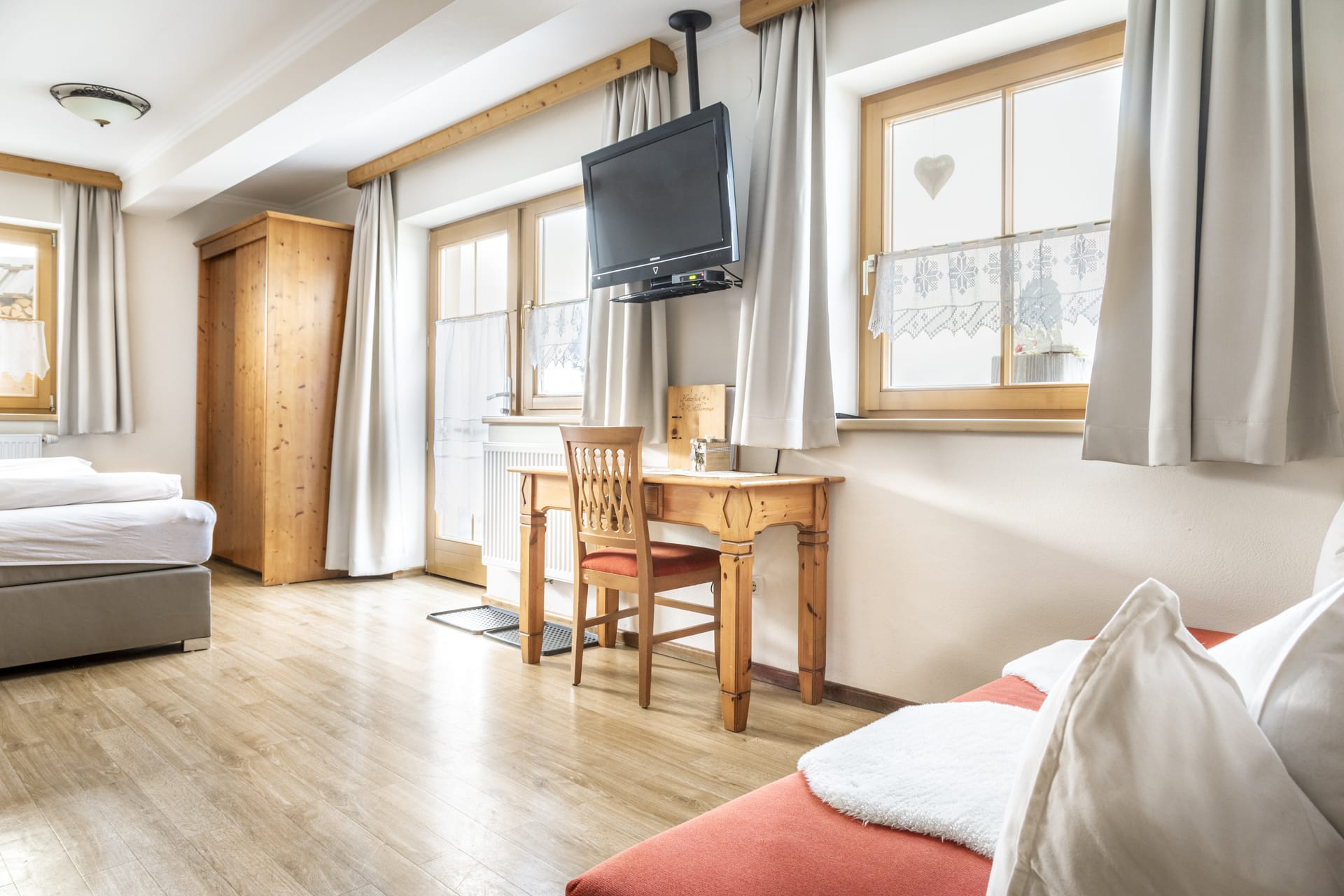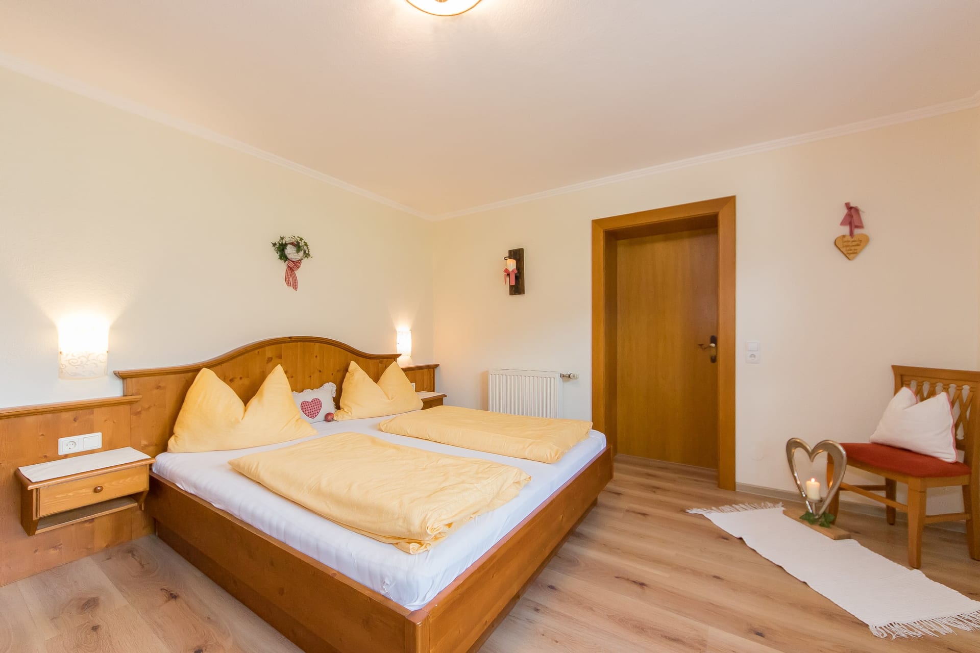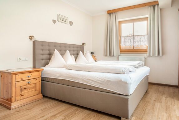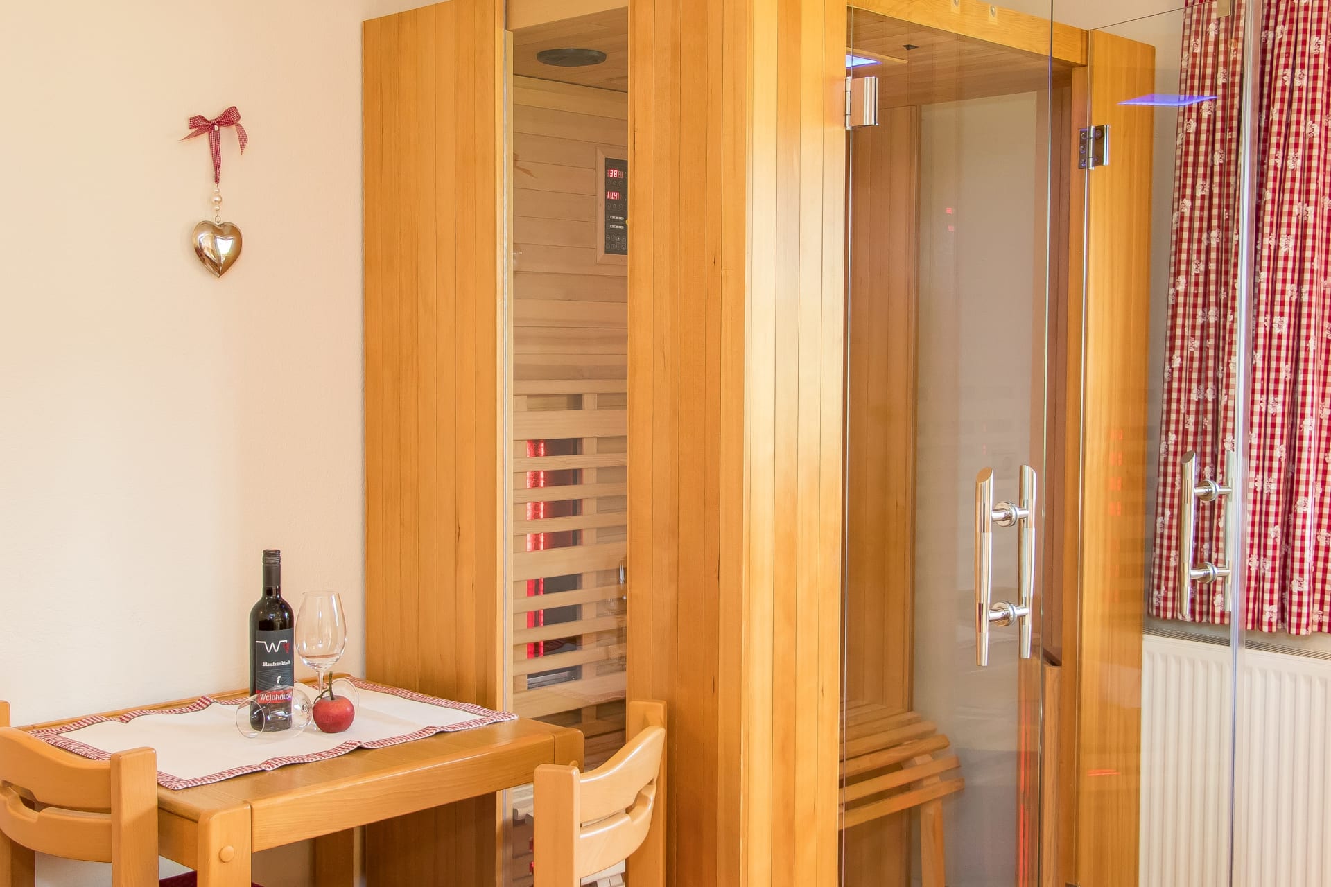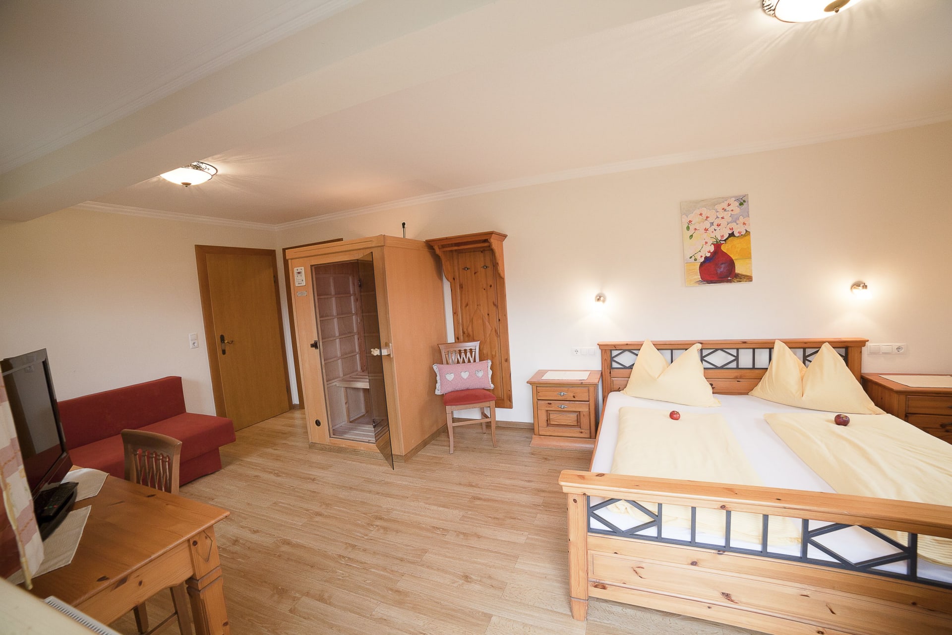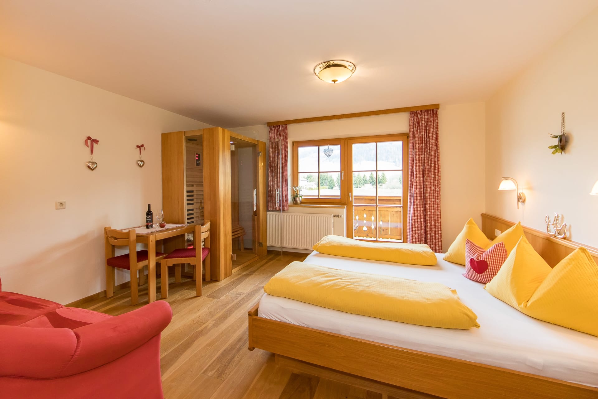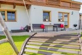 Das Erdgeschoßzimmer verfügt über eine Infrarotlichtkabine sowie eine eigene Terasse mit Sitzgelegenheit und Liegestuhl. Das Zimmer ist gemütlich mit Boxspringbett und Stockbett im Landhausstil ausgestattet.