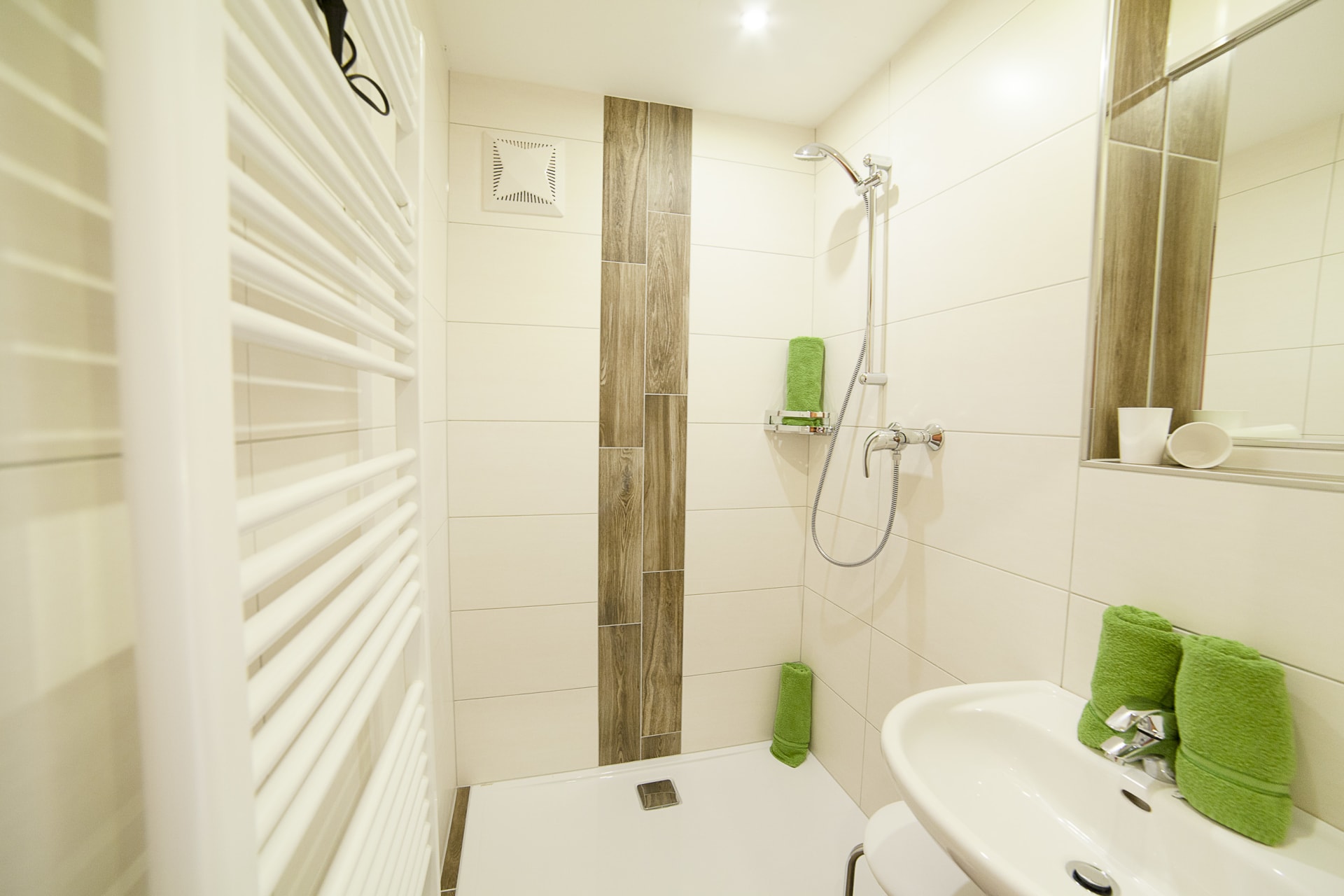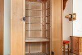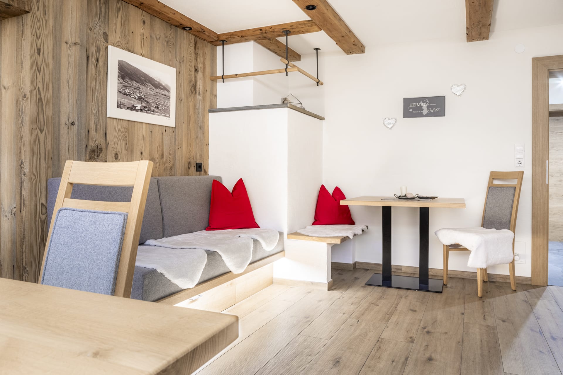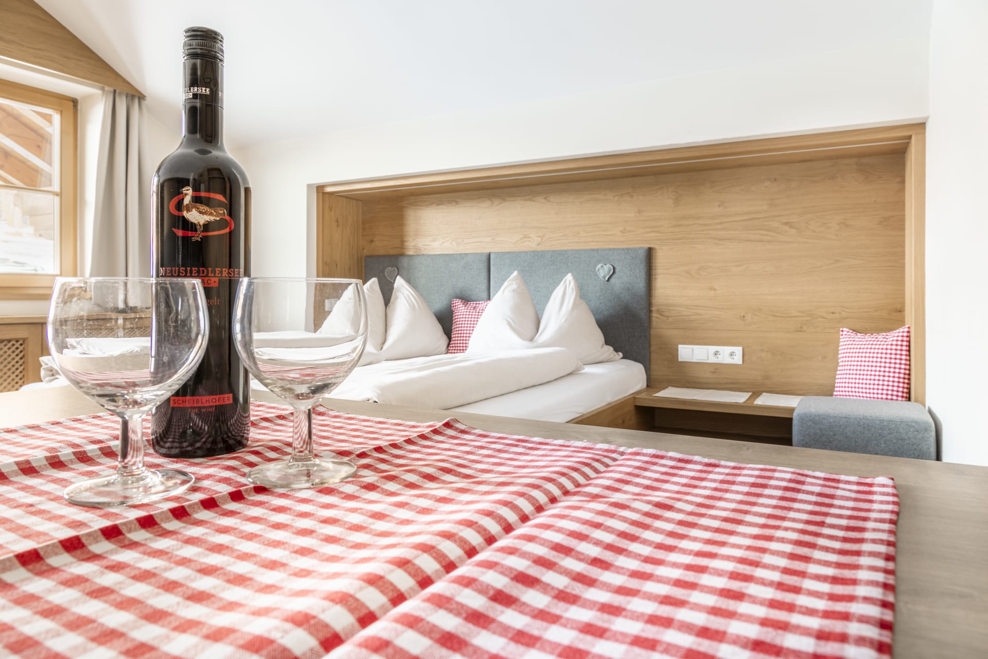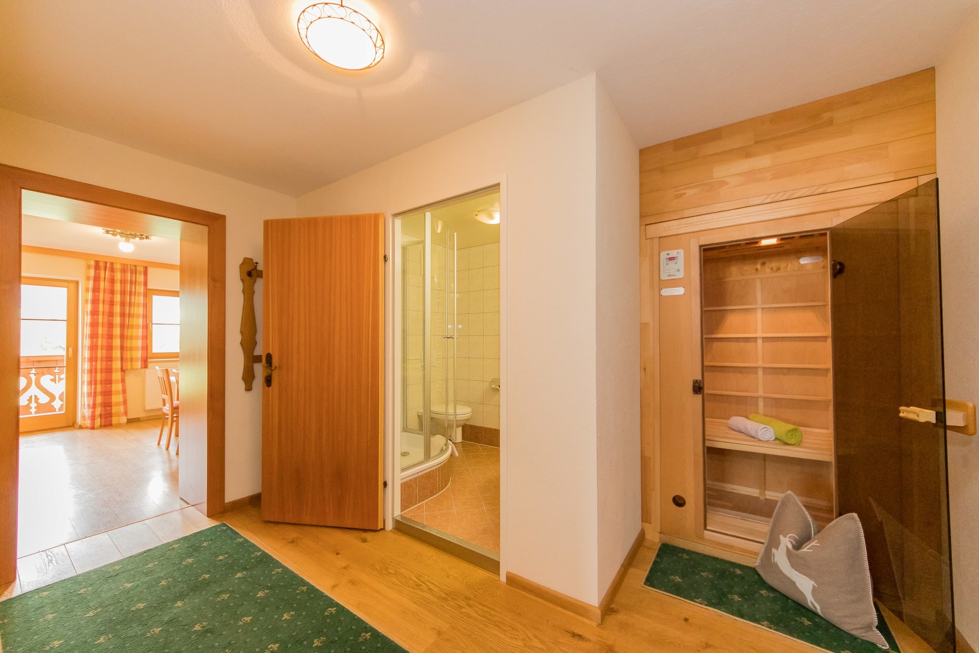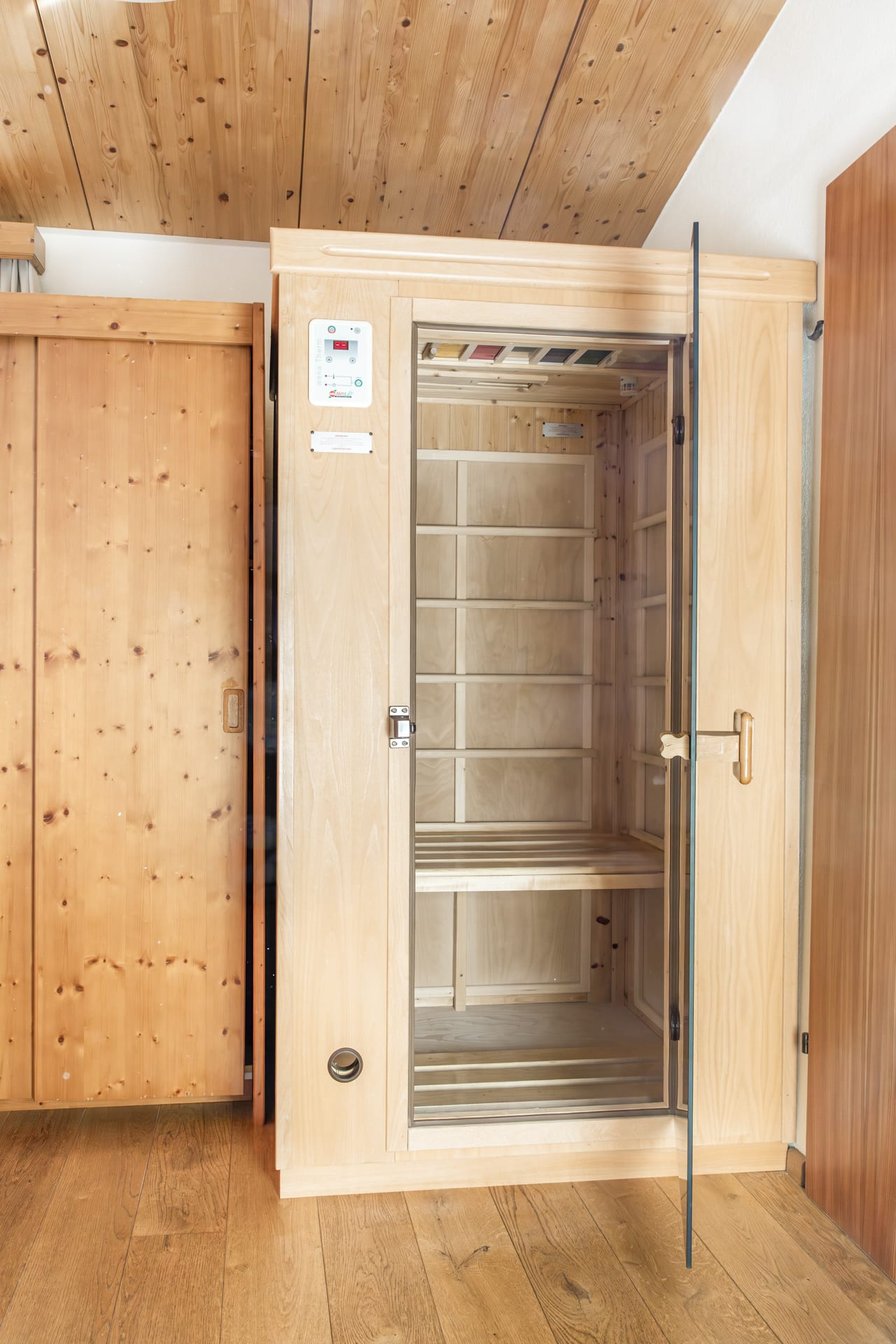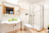 Das Erdgeschoßzimmer verfügt über eine Infrarotlichtkabine sowie eine eigene Terasse mit Sitzgelegenheit und Liegestuhl. Das Zimmer ist gemütlich mit Boxspringbett und Stockbett im Landhausstil ausgestattet.