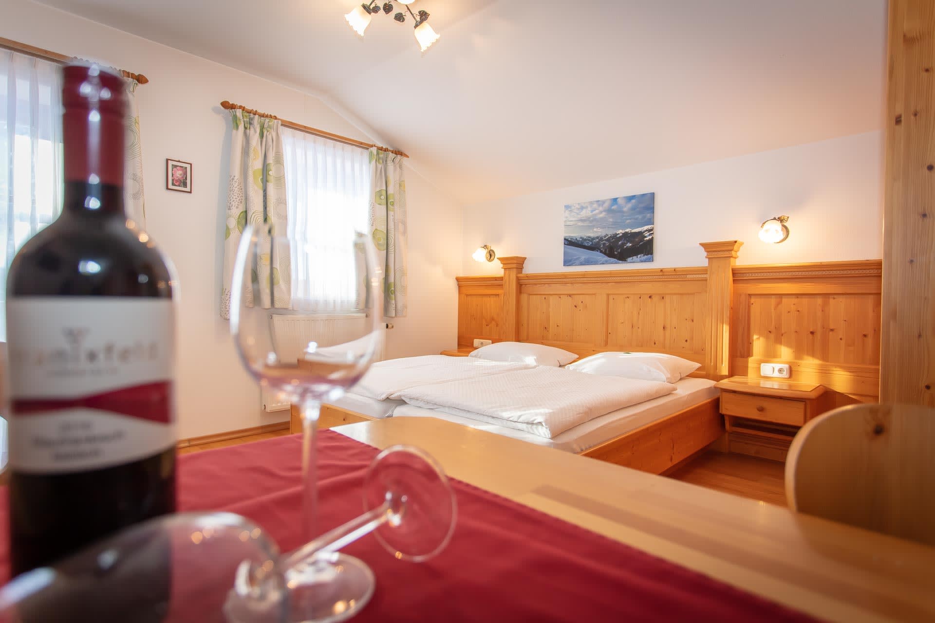 Ihre Urlaubsstimmung können Sie in unseren großzügigen und komfortablen Zimmern und Ferienwohnungen genießen. Die Ferienwohnungen sind alle mit 2 Schlafzimmern, einen gemütlichen Wohnraum (20m²), Vorraum, Bad mit Doppelwaschbecken und WC exra ausgeführt. Die Einrichtungen wurden alle aus heimischen Fichtenholz gefertigt. Von den breiten Balkonen aus können Sie die herrliche Aussicht bis zum Gletscher genießen. Im gemütlichen Aufenthaltsraum mit Videorecorder, Sat-TV, haben wir unsere Familienchronik aufliegen, in der Sie sehr gerne schmökern können. Für unsere Appartementgäste können wir täglich einen Brötchenservice anbieten. Für die Verpflegung können Sie Produkte wie Milch, Brot, Marmelade von uns bekommen. Somit steht einem wohlverdienten, erholsamen Urlaub nichts mehr im Wege.