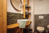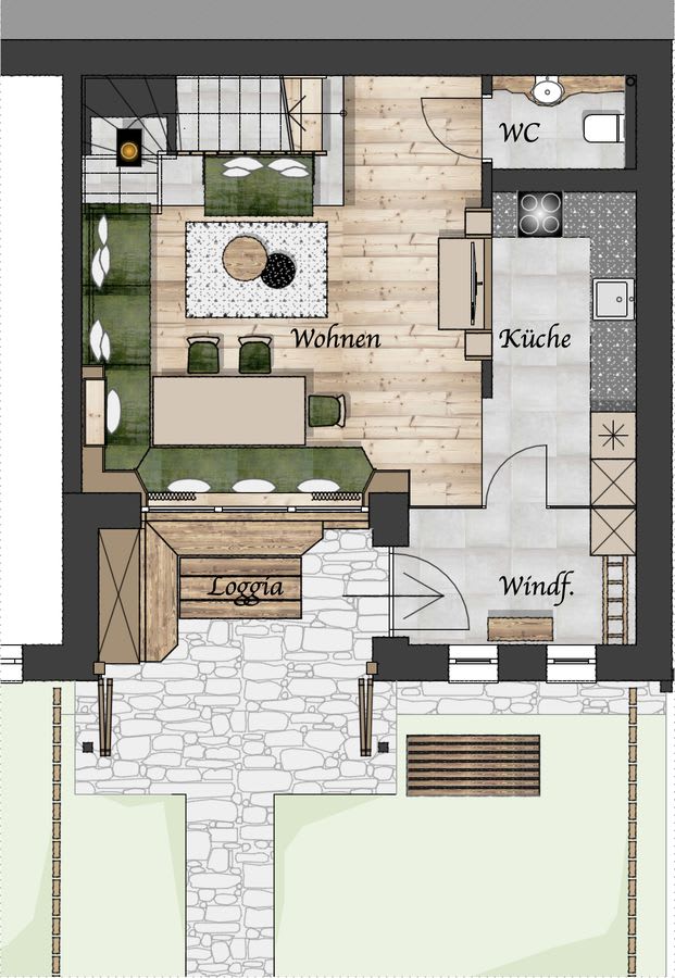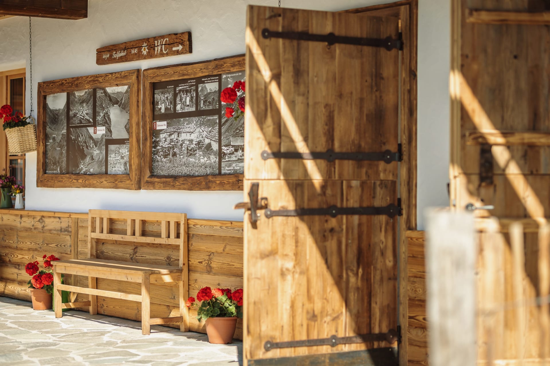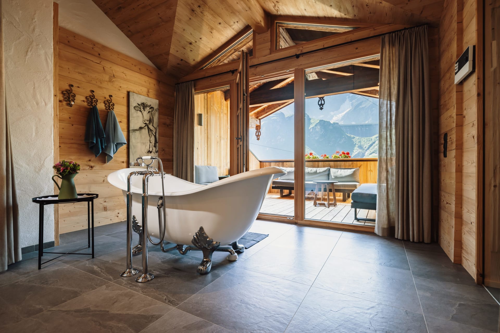 Neben dem Eingang lädt die Loggia zum Verweilen ein und im Obergeschoss eine kuschelige, versteckte Terrasse, wo man das Gefühl hat, direkt in den Bergen zu schweben.