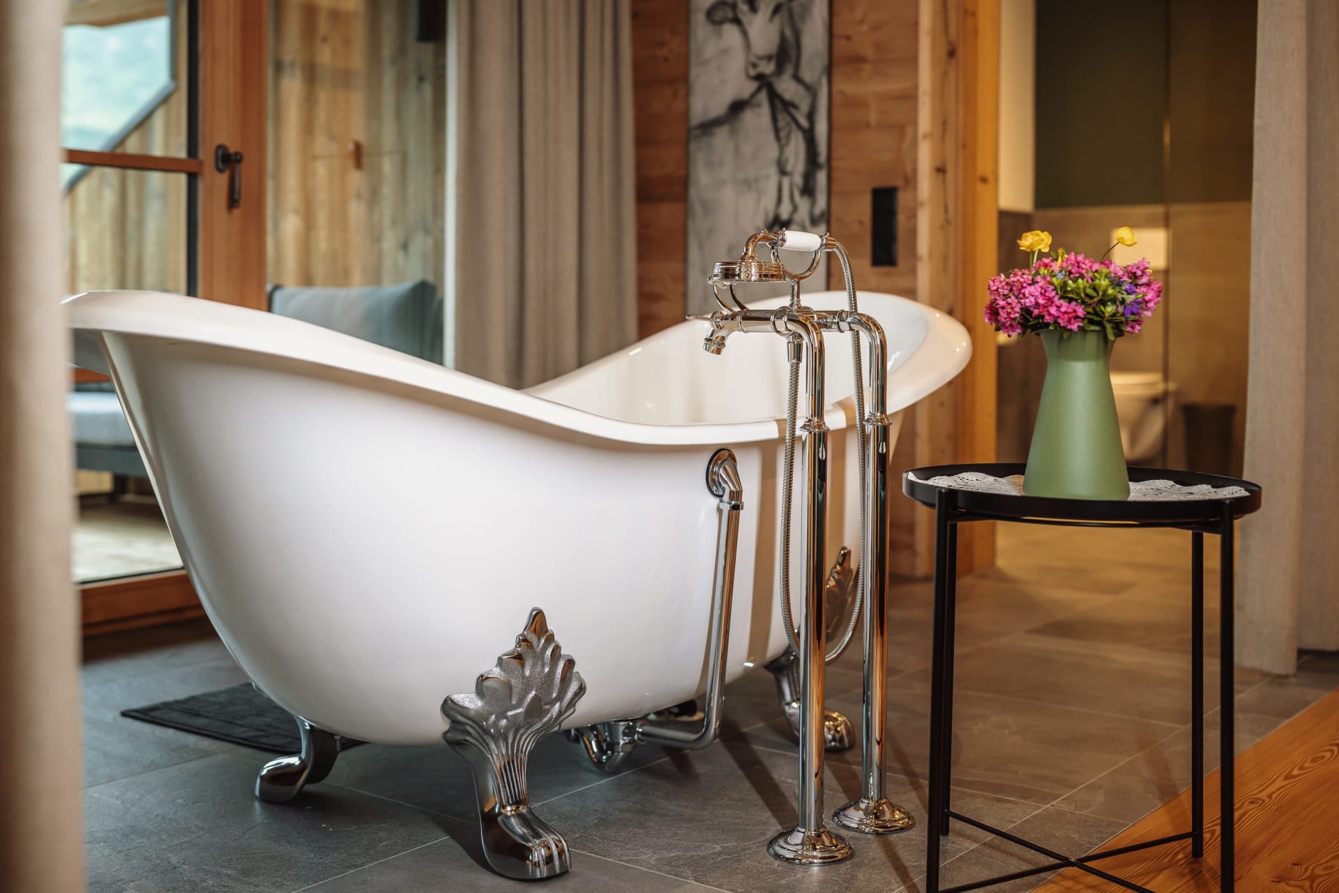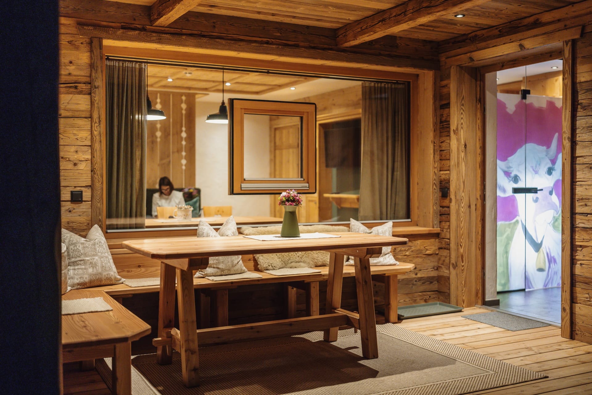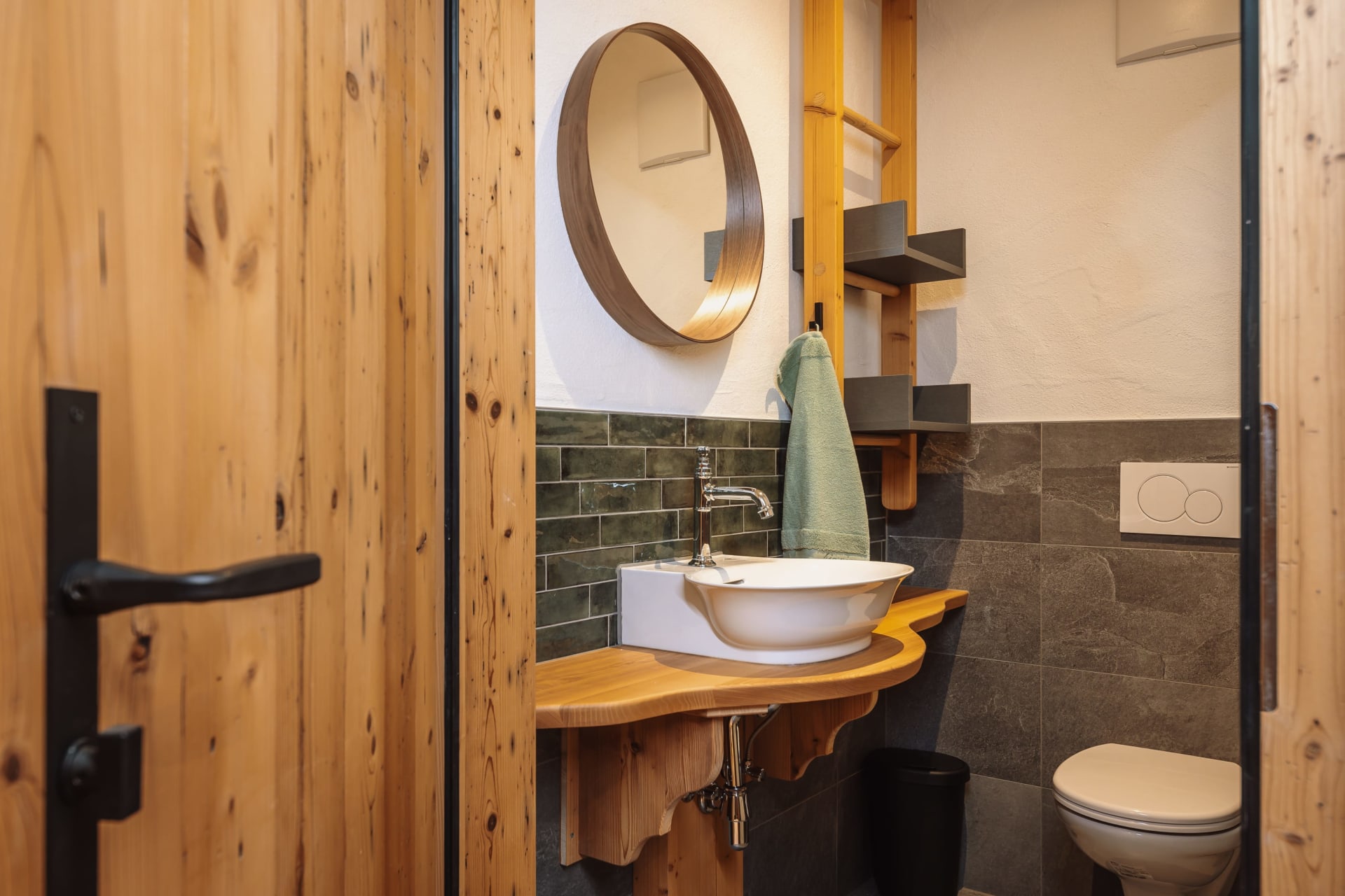 Neben dem Eingang lädt die Loggia zum Verweilen ein und im Obergeschoss eine kuschelige, versteckte Terrasse, wo man das Gefühl hat, direkt in den Bergen zu schweben.