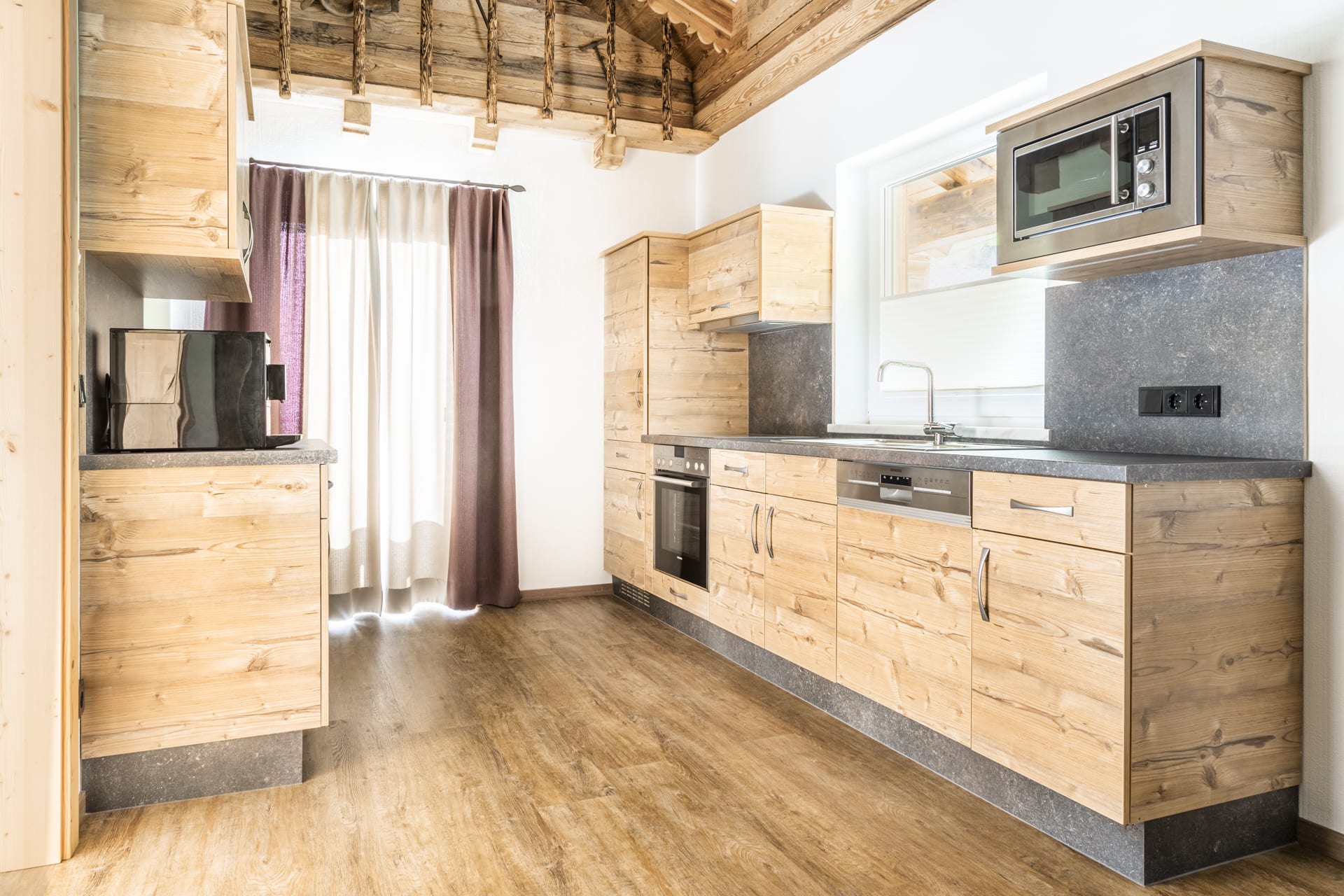 • Küche mit 4–Platten Ceranfeld inkl. Backrohr, Geschirrspüler, Kühlschrank inkl. Gefrierfach, Kaffeemaschine, Mikrowelle und Wasserkocher