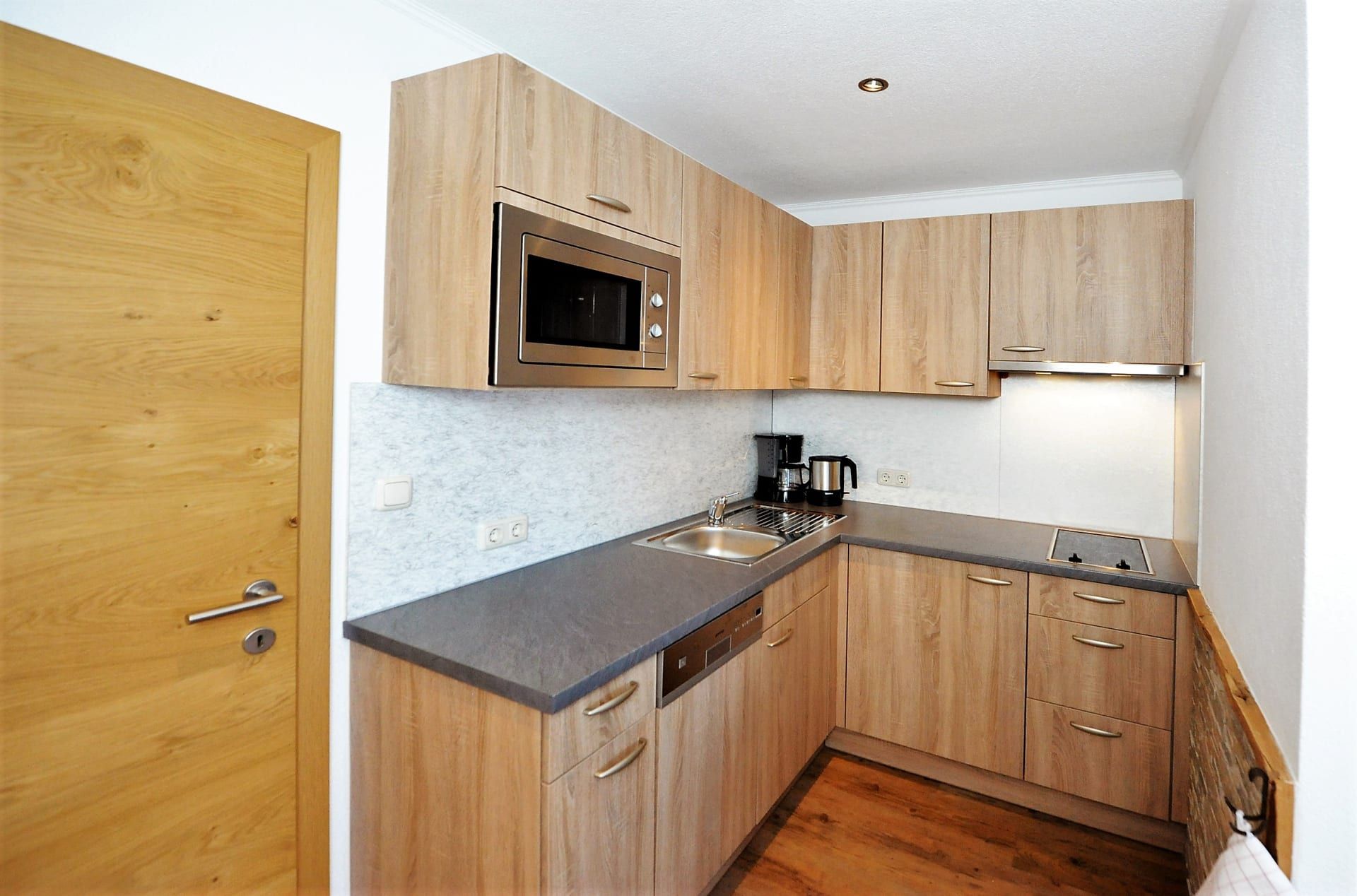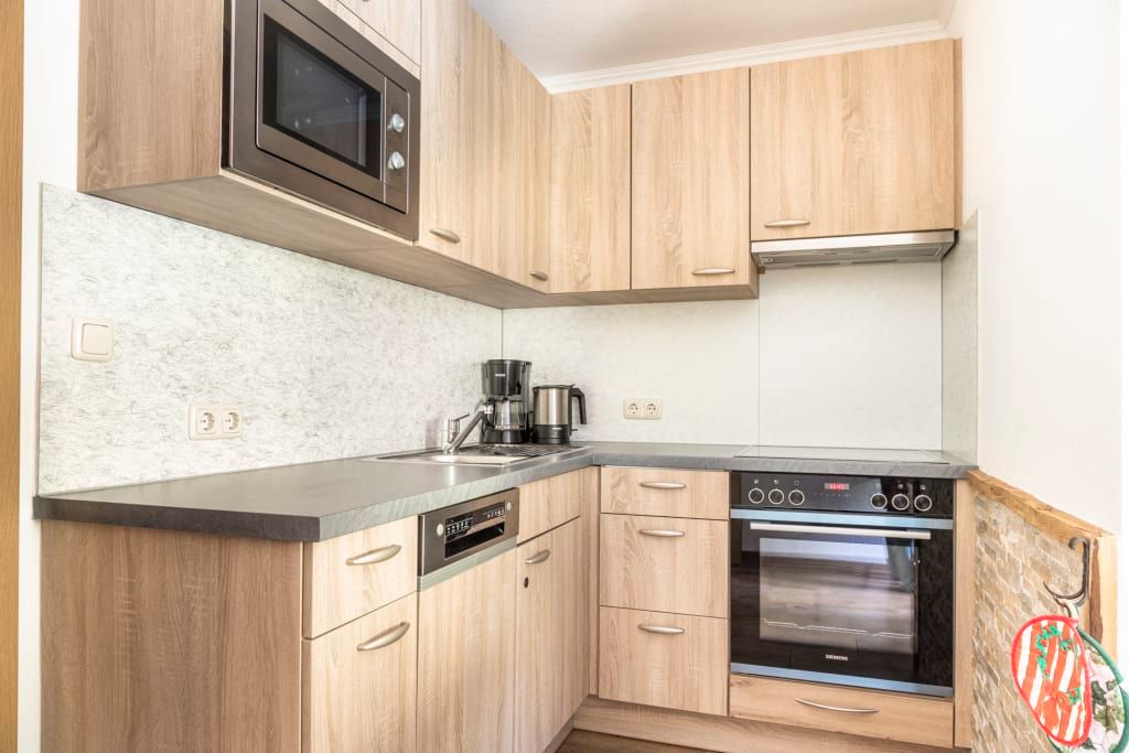 • Küche mit 2–Platten Ceranfeld, Geschirrspüler, Kühlschrank inkl. Gefrierfach, Kaffeemaschine, Mikrowelle und Wasserkocher