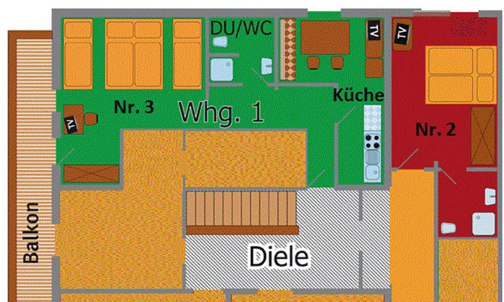 Die gemütliche Ferienwohnung 1 ist geeignet für 2-6 Personen. Neben einer Wohnküche mit Küchenzeile ist die Ferienwohnung außerdem mit einem Geschirrspüler, Mikrowelle, Sitzecke, Dusche und WC, Kabel-TV, Safe, Fön sowie einem Balkon ausgestattet. Die 2 Schlafzimmer befinden sich getrennt nebeneinander (1 Doppelzimmer, 1 Vierbettzimmer).