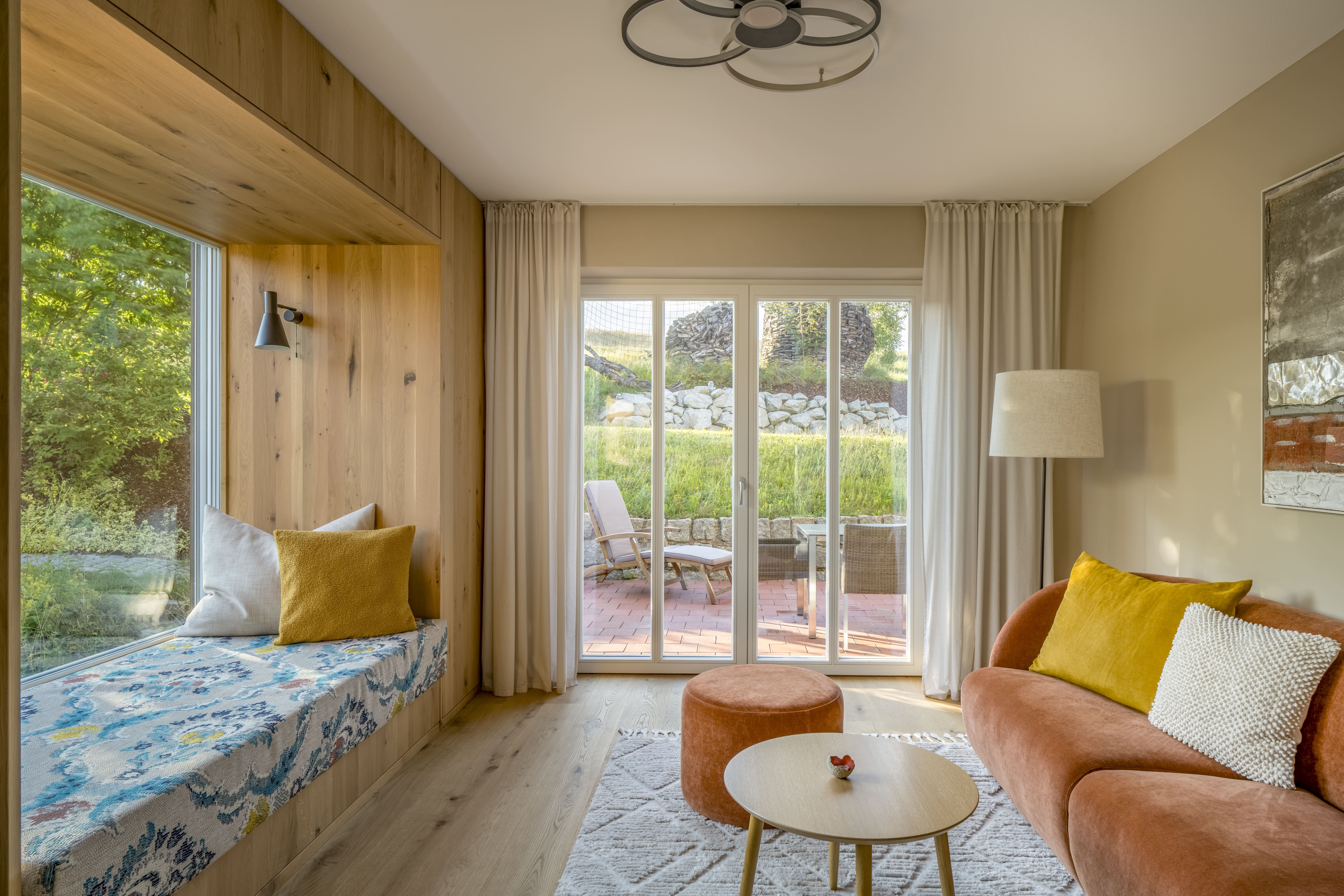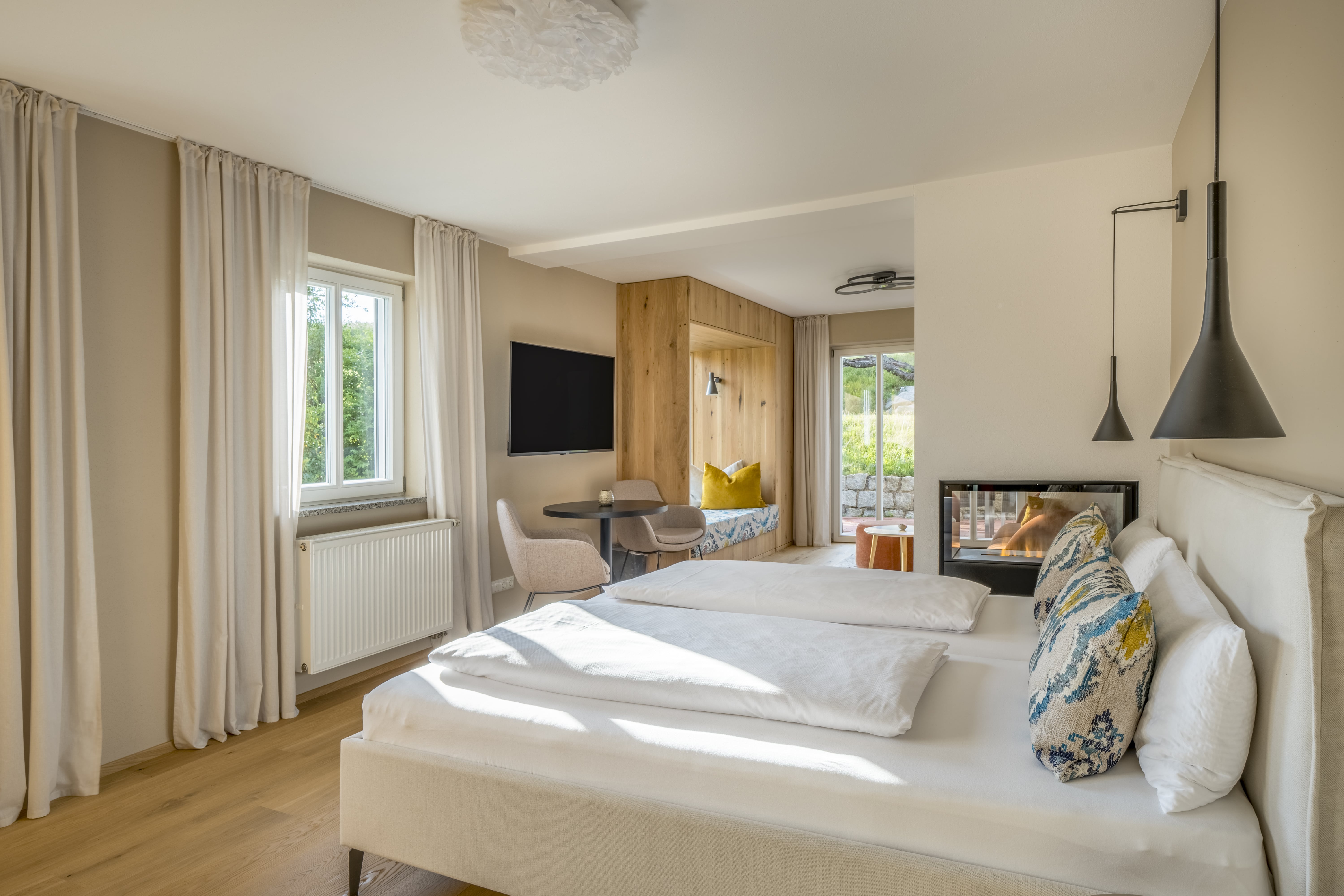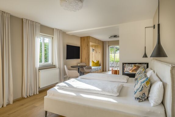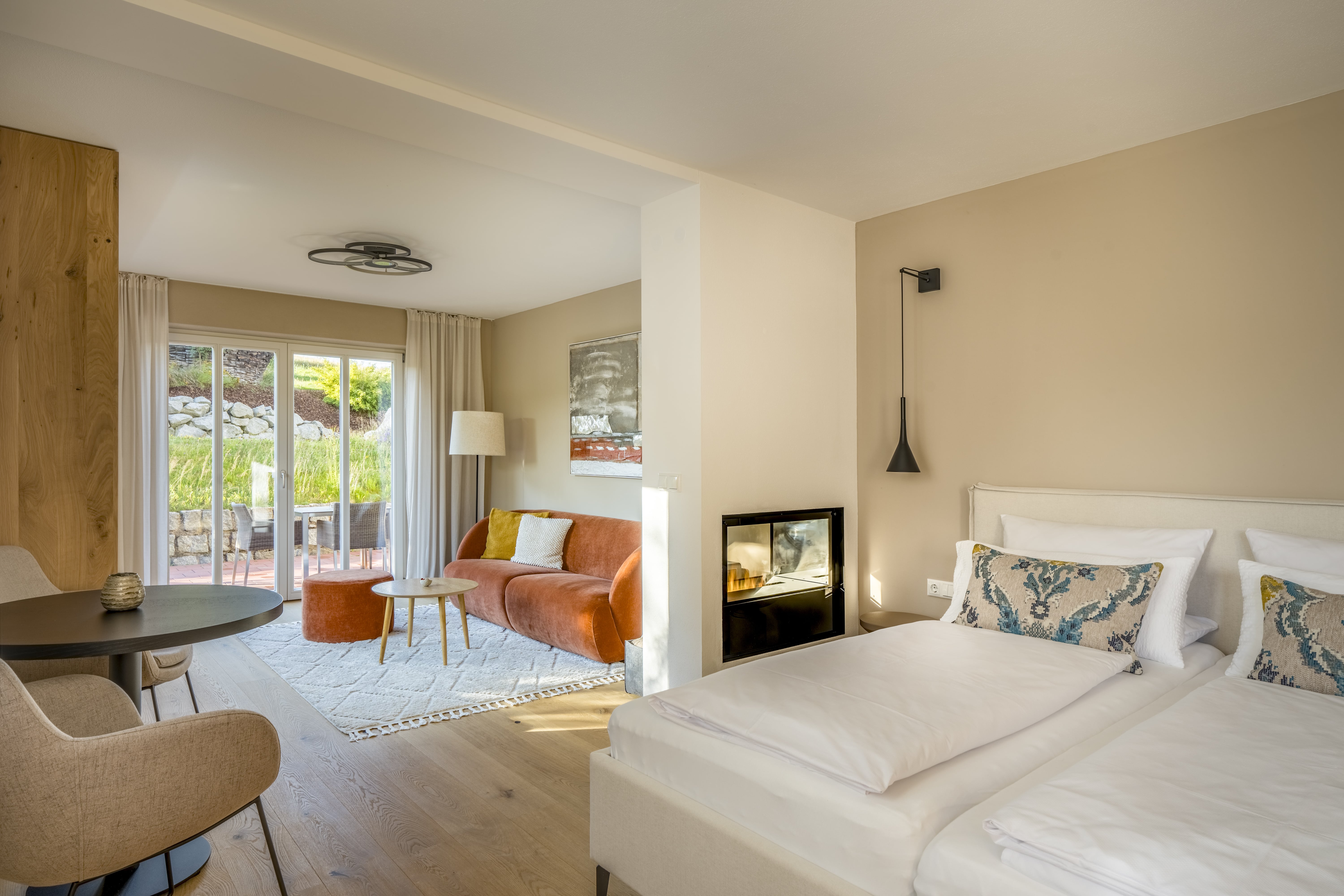 Unsere neu renovierte Gartensuite (45 qm) ist mit einem Vorraum inkl. Garderobe, modernem Bad mit begehbarer Dusche, WC, Haarföhn, Kosmetikspiegel, Wohlfühl-Schlafzimmer mit kuscheliger Couchgruppe, Panoramafenster, Effektfeuer Kamin, Flachbild SAT-TV, Digitalradio mit CD-Player, Wasserkocher, Kühlschrank, Terrasse und kostenlosem WLAN ausgestattet.