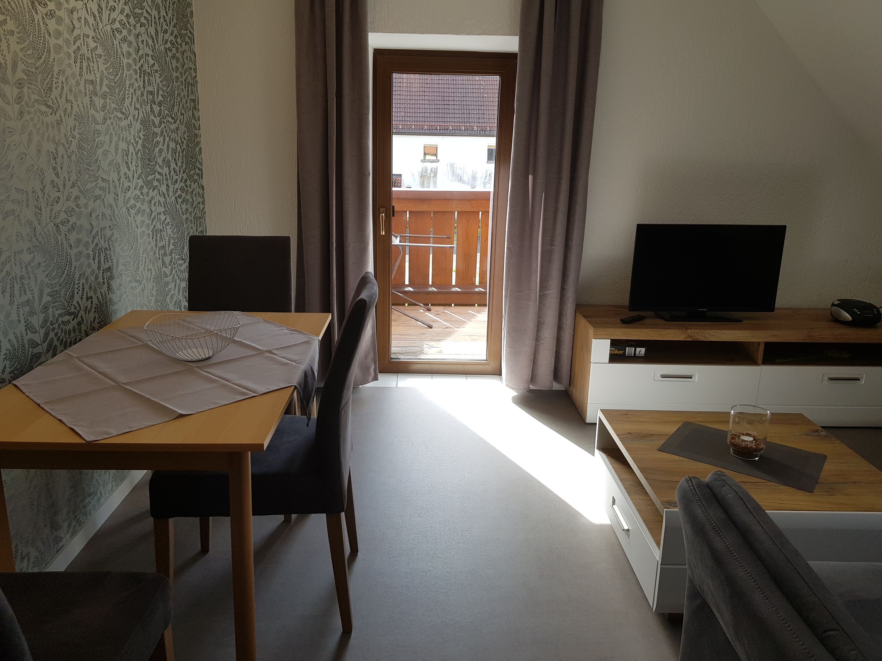 Unsere Ferienwohnung IV ist ca. 40 m² groß und befindet sich im 2. Stock. Sie verfügt über 1 Schlafzimmer mit Doppelbett und Schlafsofa, einer voll ausgestatteten Küche (inkl. Spülmaschine), einem kombinierten Ess- und Wohnzimmer mit Sat/TV und einem Bad mit Dusche/WC. Vom Wohn-/Esszimmer und Schlafzimmer aus gelangt man auf den großen Südbalkon. Wohn- und Esszimmer sowie Küche wurden 2024 neu eingerichtet.