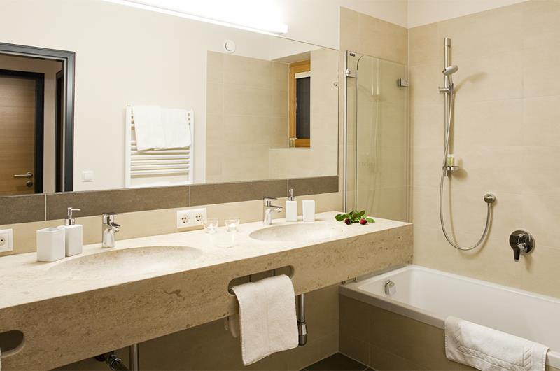 Vorraum mit großem Garderobenelement, gemütlicher Wohnteil mit Schiebetüre abtrennbar, großzügiger Essbereich, Tischlerküche mit Komplettausstattung, Arbeitsplatte, Kühlschrank, Geschirrspüler, Ceran - Kochfeld, Mikrowelle - Kombi, Toaster, Wasserkocher, Kaffeemaschine(Nespresso, Filterkaffeemaschine) etc., 2 gemütliche Schlafzimmer mit ausreichend Platz für Ihre Garderobe , 2 elegante Bäder und Duschen (Handtuchtrockner, Haartrockner, Kosmetikspiegel), WC extra, Sat - TV/ Radio (Programme in D, E, F, I, NL, uvm.), DVD - Player, WLAN Highspeed - Internet, Safe, Kinderbett und Hochstuhl auf Anfrage.
