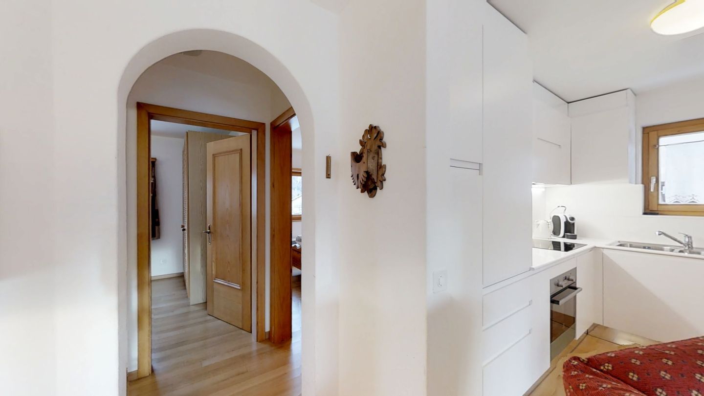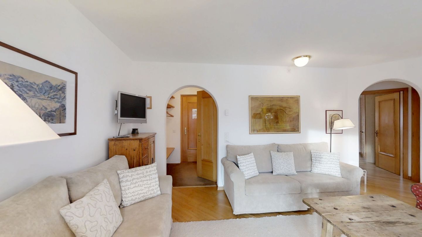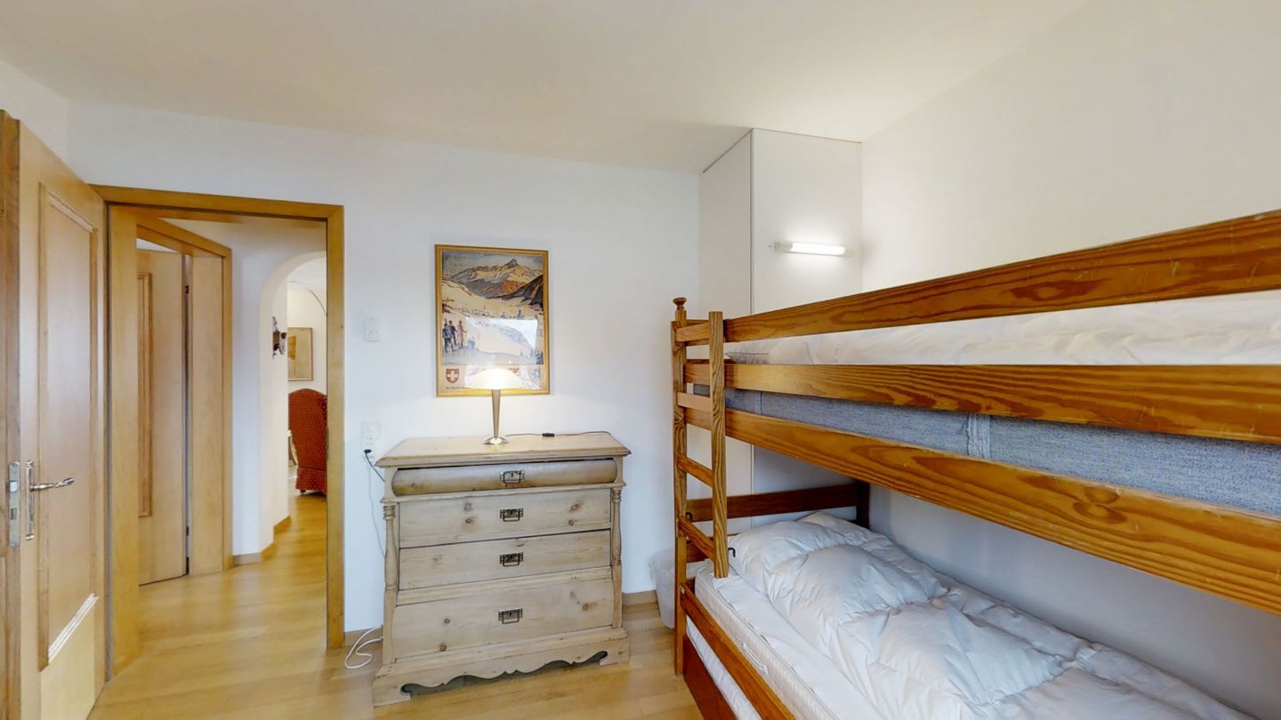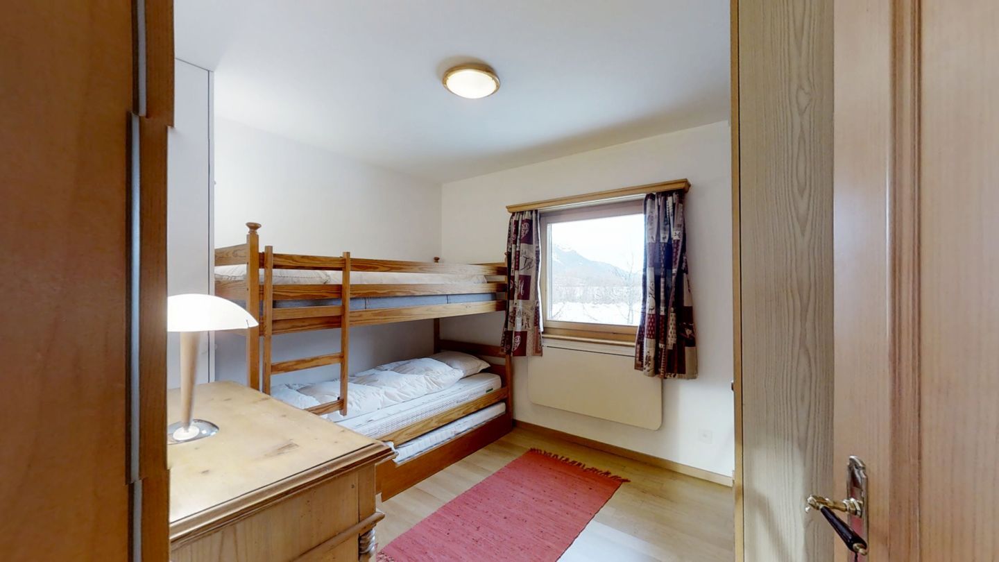 3-Zimmerwohnung im 1. Stock, ca. 77 m2. Entree mit grosser Garderobe. Wohnzimmer mit Essecke. Südwestbalkon mit Bergsicht. Offene Küche mit Backofen, Kaffeemaschine Chicco d'Oro und Geschirrspüler. Ein Doppelzimmer und ein Zimmer mit einem Etagenbett. Badezimmer mit Dusche/WC/Doppellavabo. Separates WC mit Lavabo. Radio, TV und Telefon. Rustikale und sehr komfortable Einrichtung. Garagenplatz. Haustiere sind nicht erlaubt.