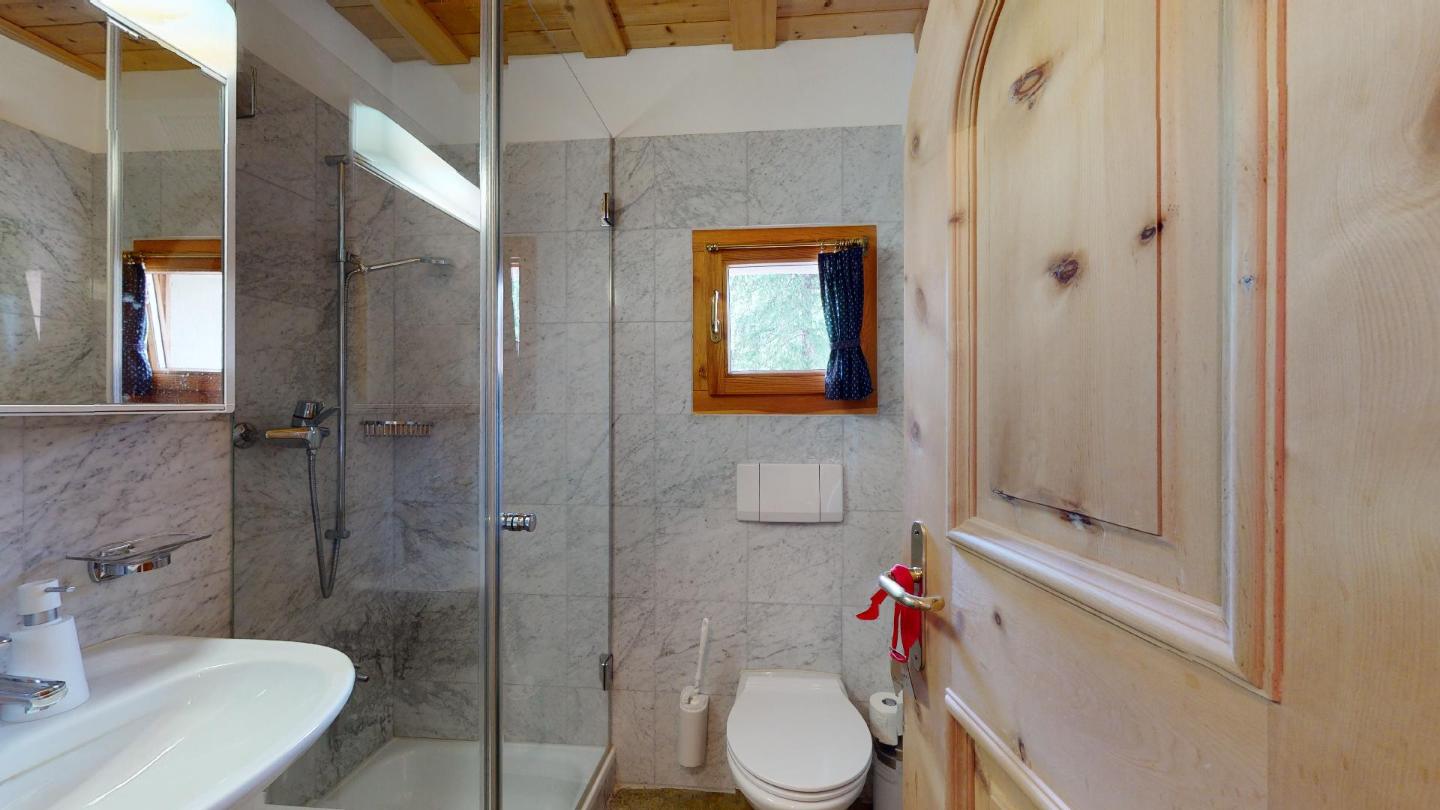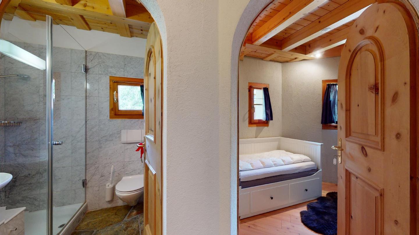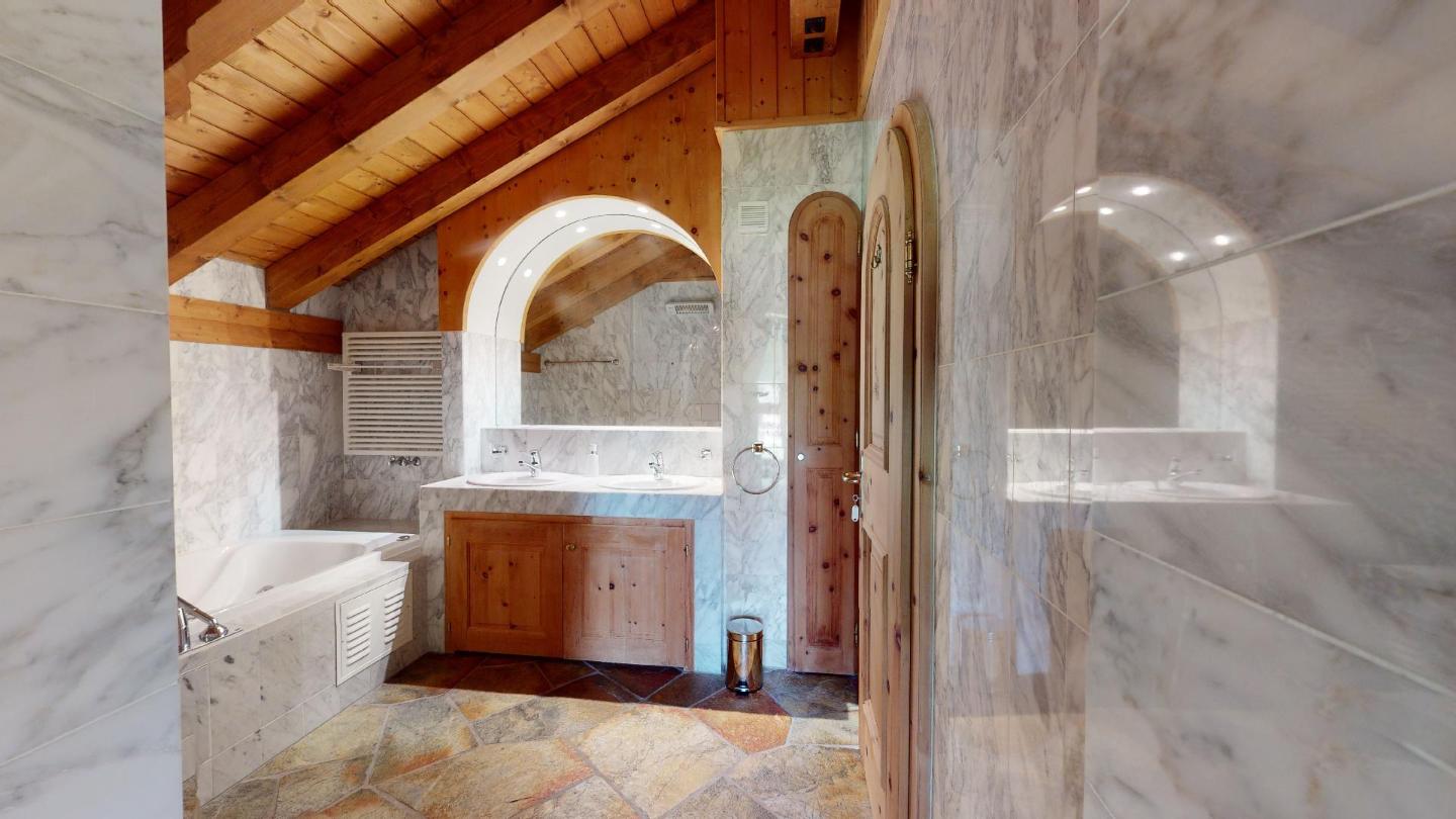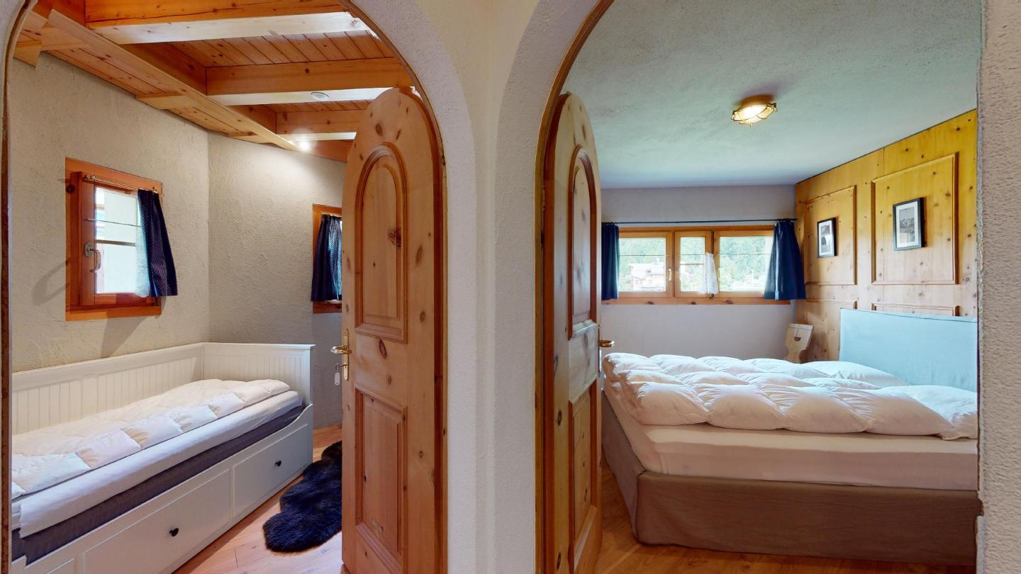 Ebenso separat zugänglich befinden sich im oberen Stockwerk weitere 2 Doppelzimmer (zweites Doppelzimmer nur via dem ersten zugänglich) mit grosszügigen Einbauschränken und einem Badezimmer mit Whirlpool-Badewanne, Doppelwaschbecken und WC/Bidet.