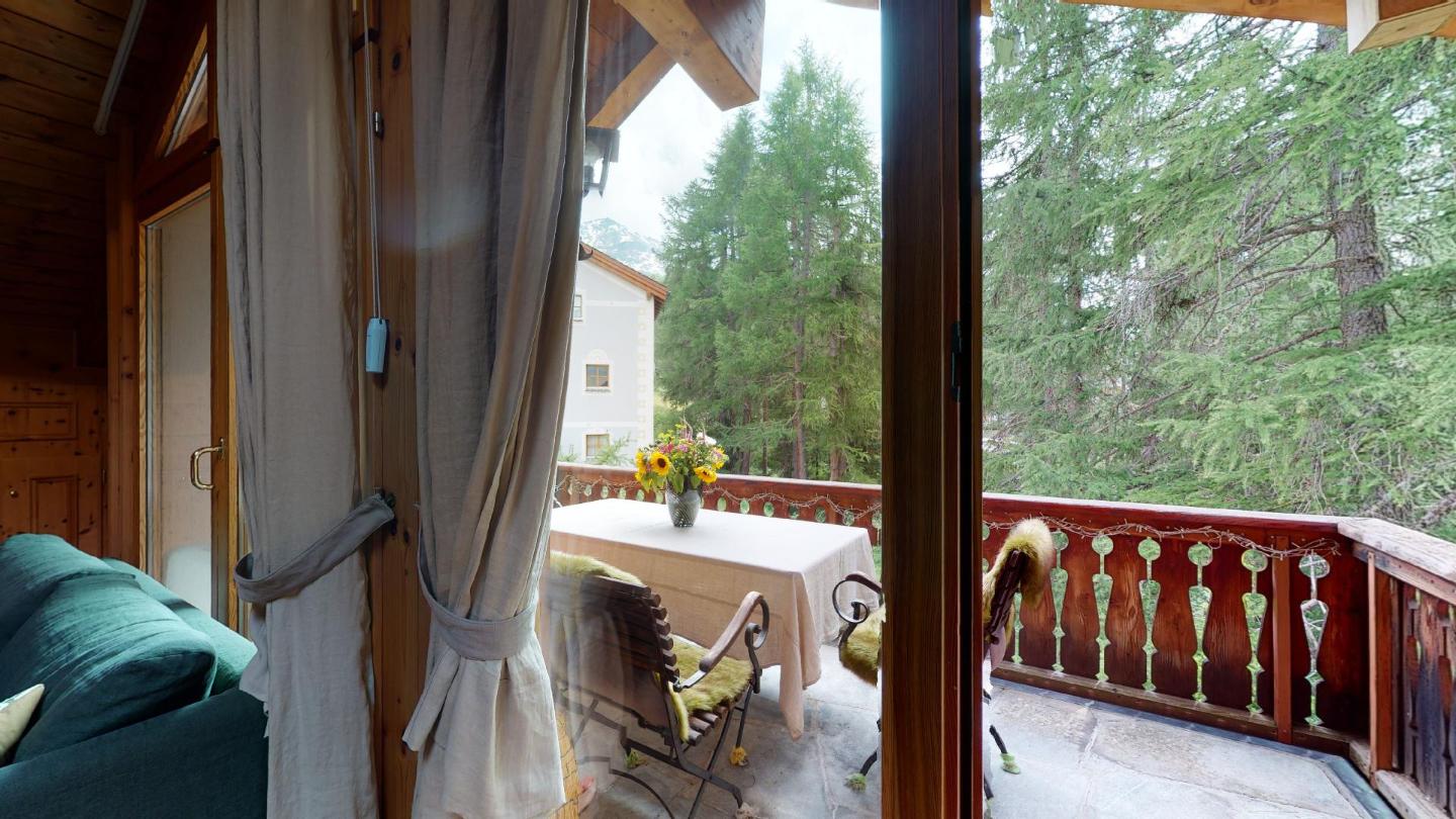 Vom Wohnbereich aus hat man direkten Zugang zum Balkon, von wo aus man das Bachrauschen sowie einen herrlichen Blick auf den Gipfel des Corvatsch geniesst.