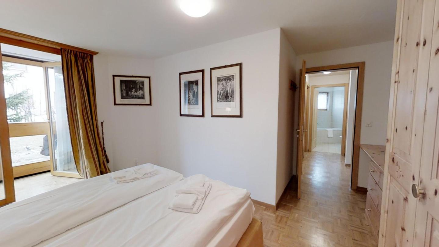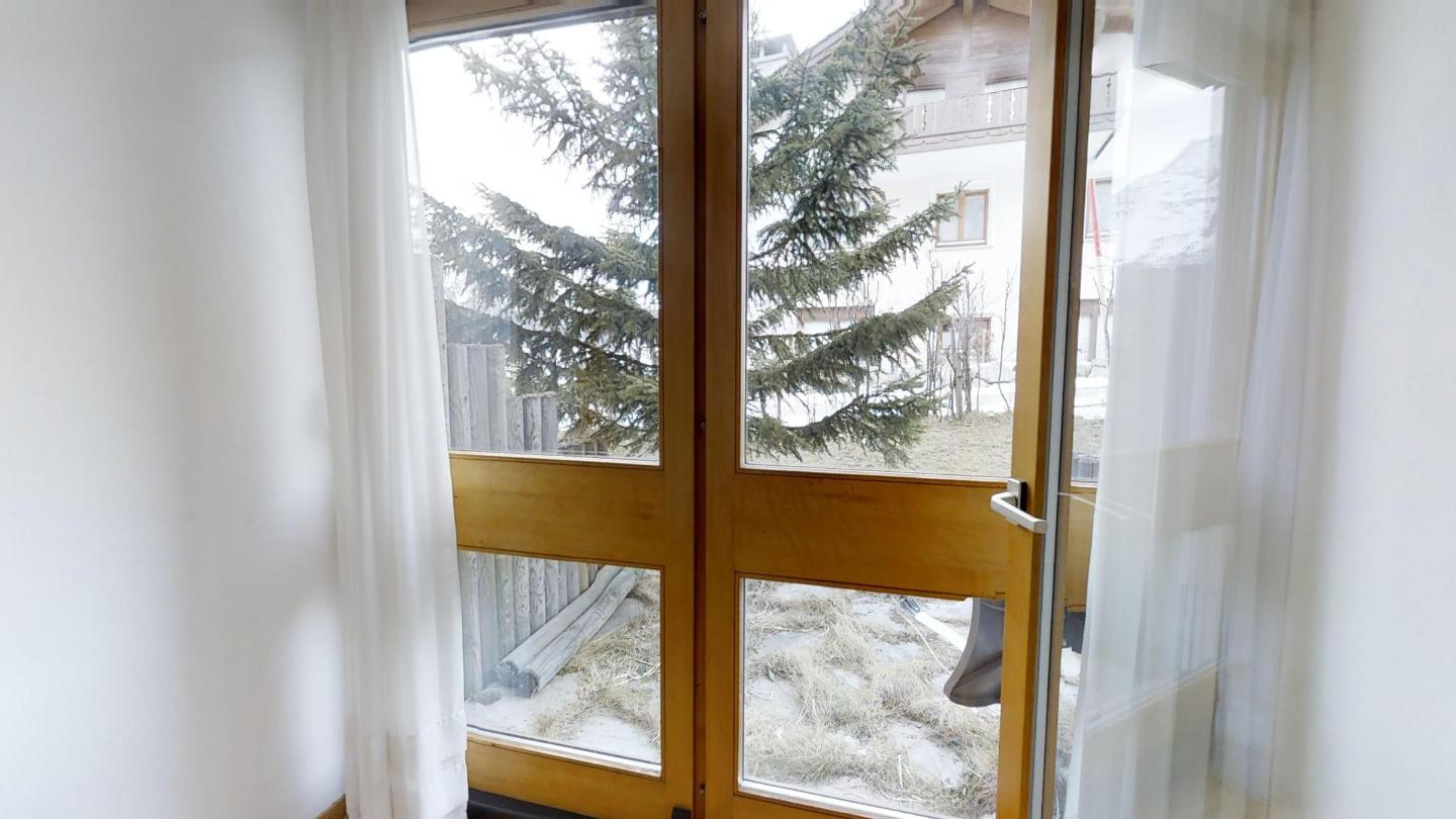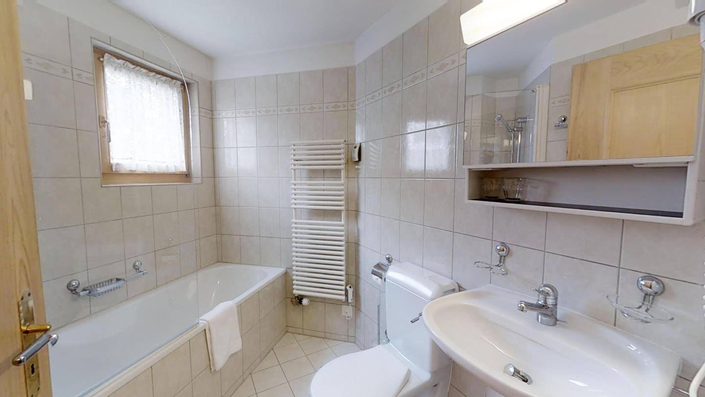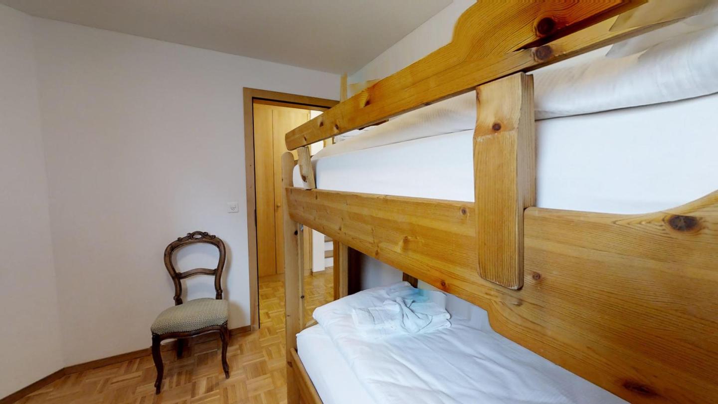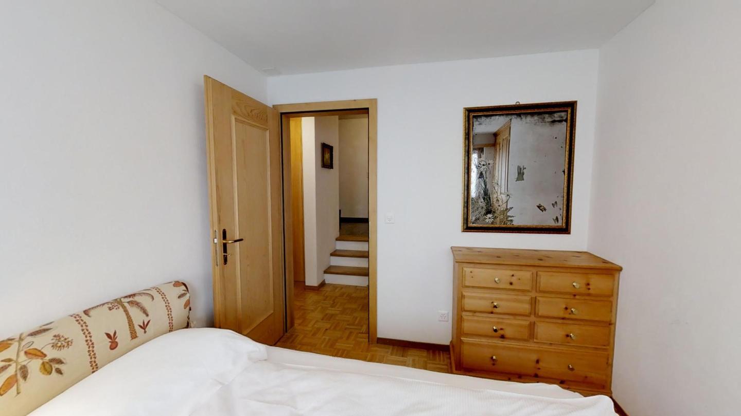 Über eine Marmortreppe gelangt man in den unteren Wohnungsteil mit 3 Schlafzimmern. Davon 1 Doppelbettzimmer und Zutritt über die Veranda in den Vorgarten. 1 Schlafzimmer mit 2 getrennten Einzelbetten und 1 Schlafzimmer mit Etagenbett. Badezimmer mit Badewanne/Lavabo. Separates kleines Gäste-WC. 2 Garagenplätze. Skiraum und Waschküche zur Mitbenützung. Haustiere sind nicht erlaubt.