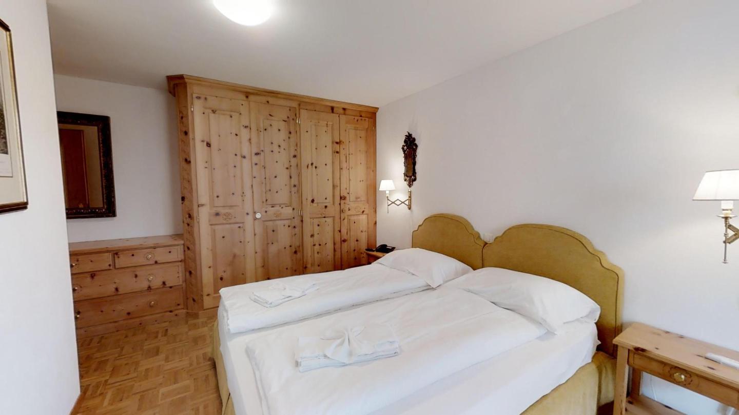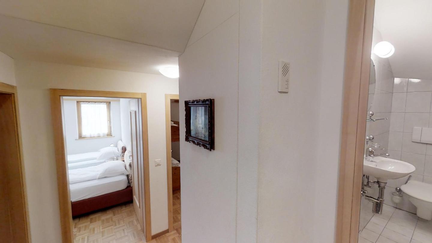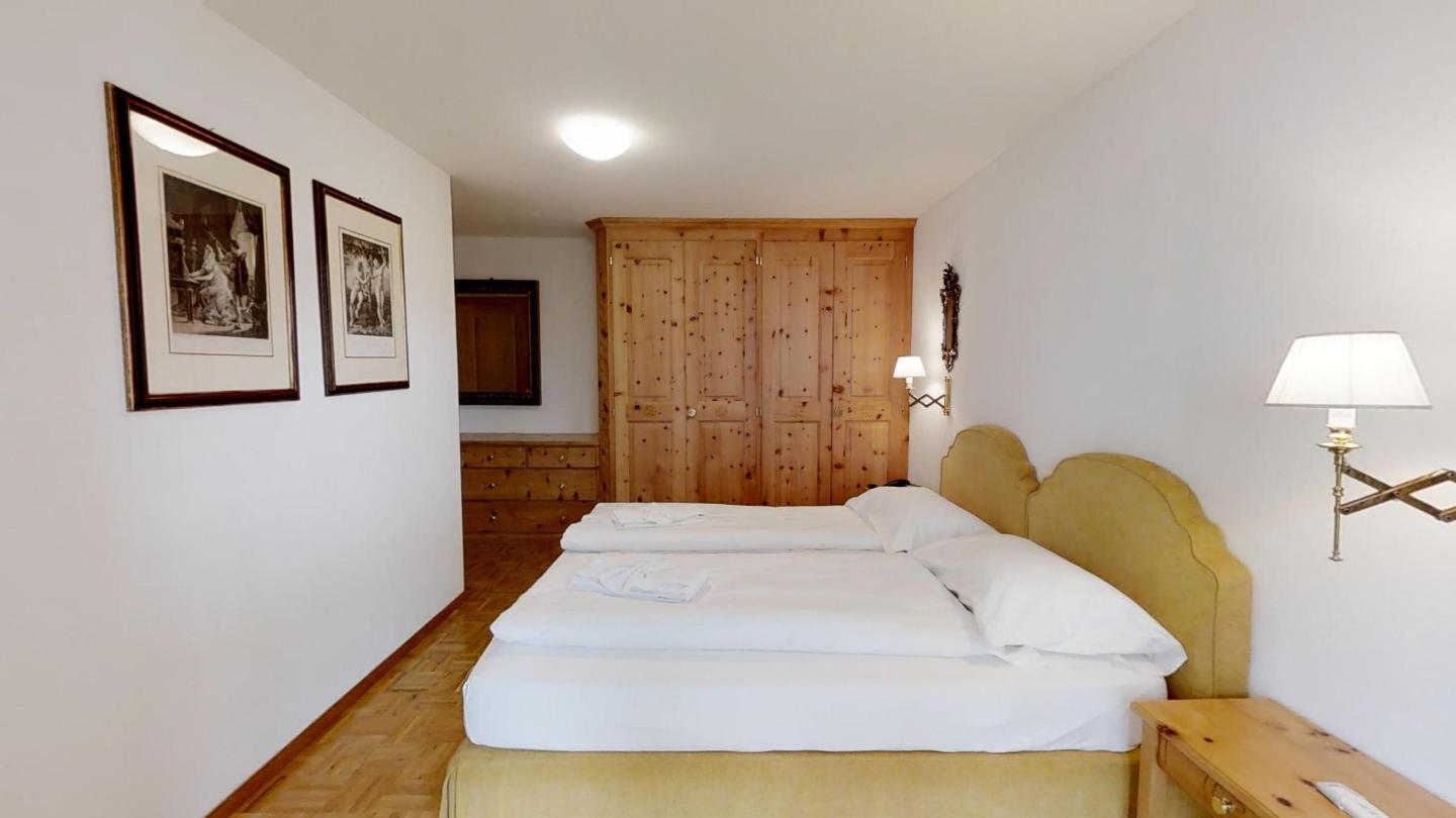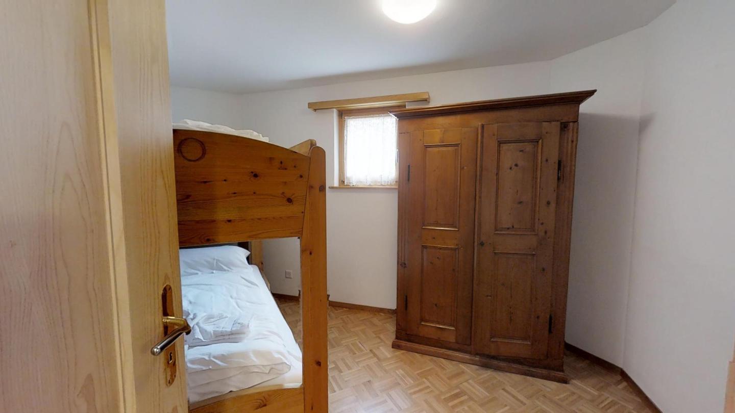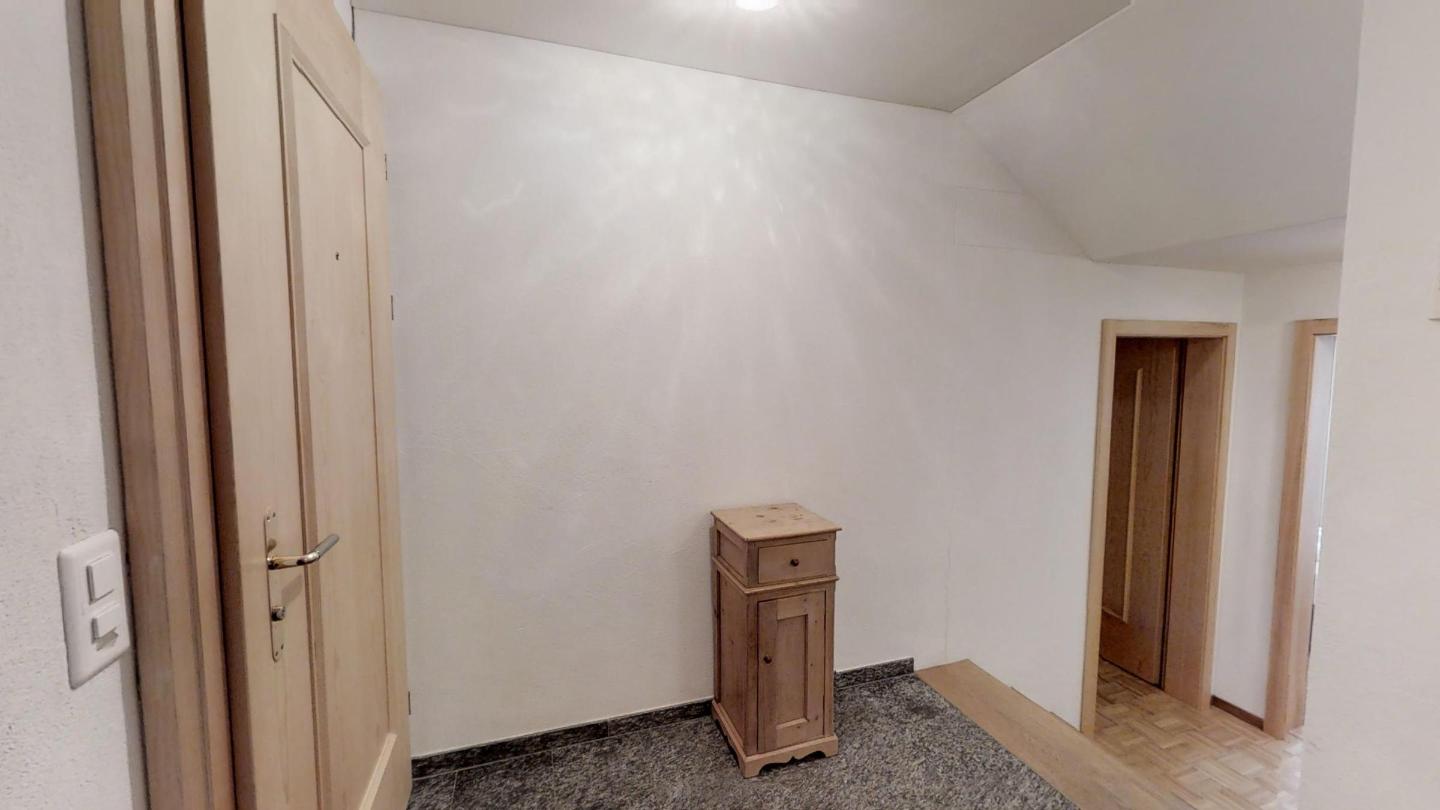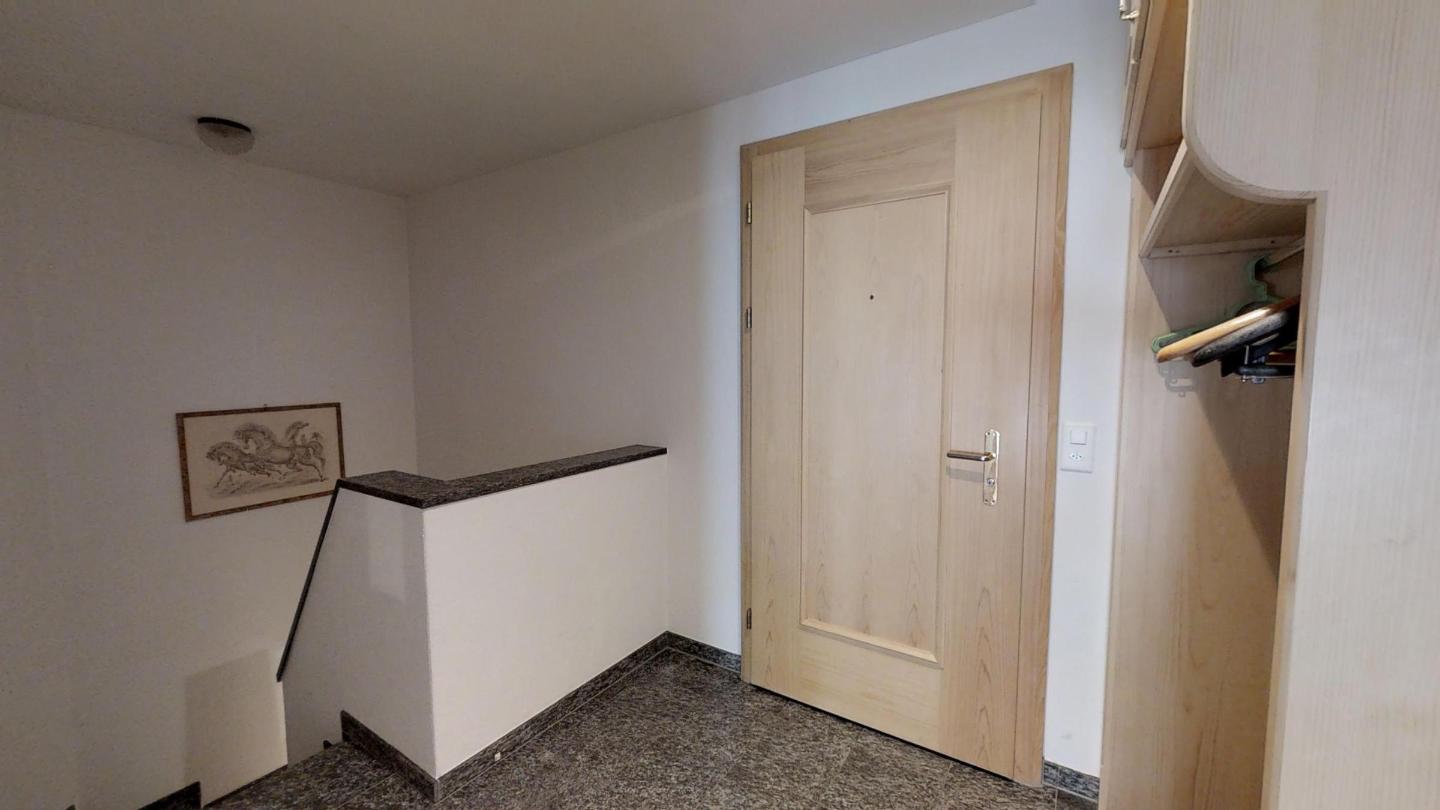 Über eine Marmortreppe gelangt man in den unteren Wohnungsteil mit 3 Schlafzimmern. Davon 1 Doppelbettzimmer und Zutritt über die Veranda in den Vorgarten. 1 Schlafzimmer mit 2 getrennten Einzelbetten und 1 Schlafzimmer mit Etagenbett. Badezimmer mit Badewanne/Lavabo. Separates kleines Gäste-WC. 2 Garagenplätze. Skiraum und Waschküche zur Mitbenützung. Haustiere sind nicht erlaubt.