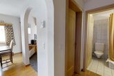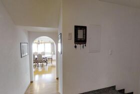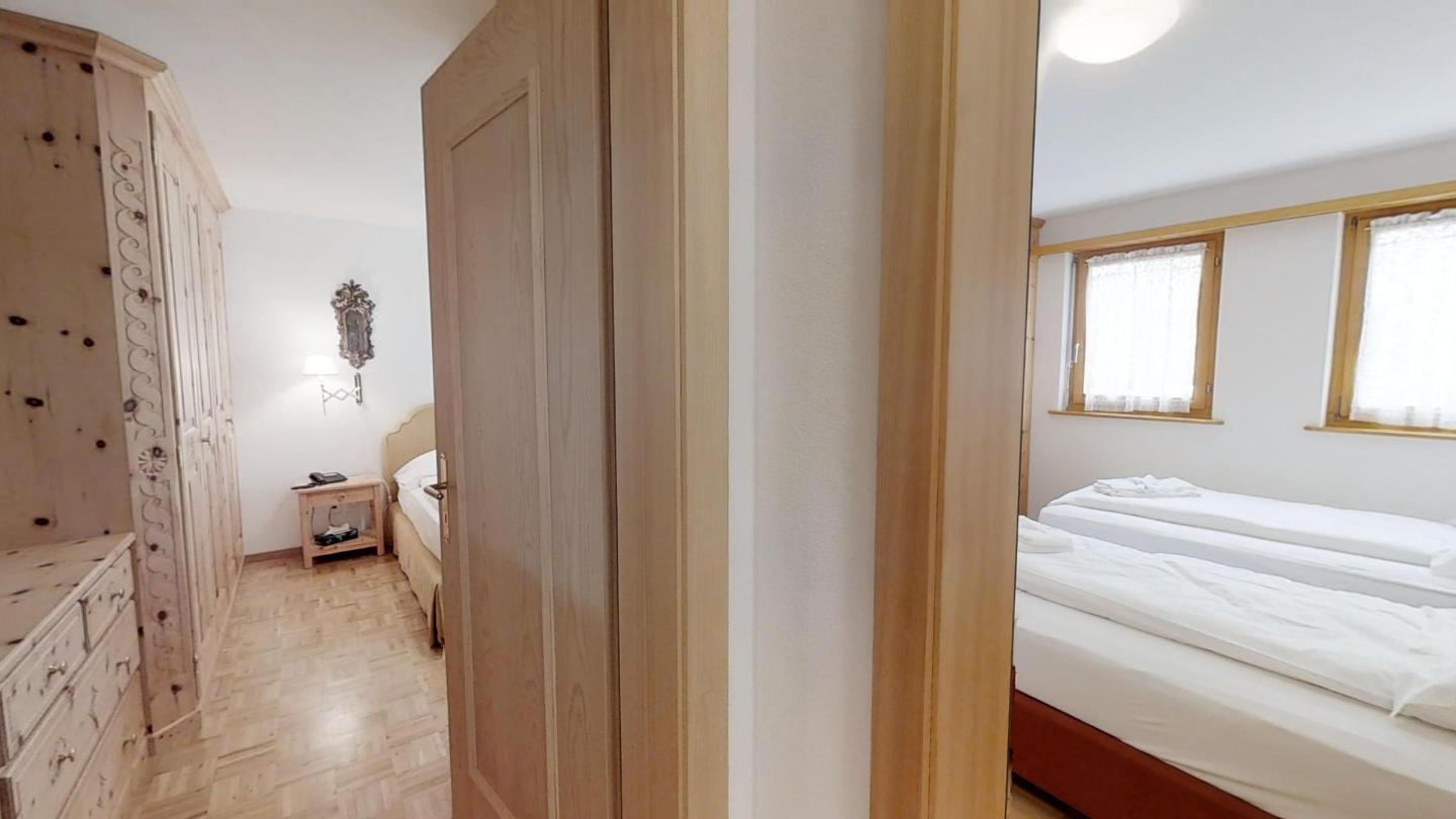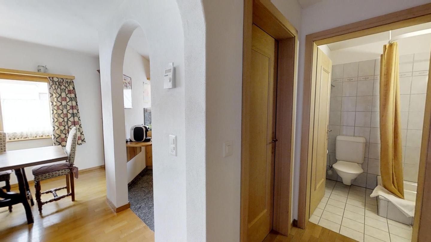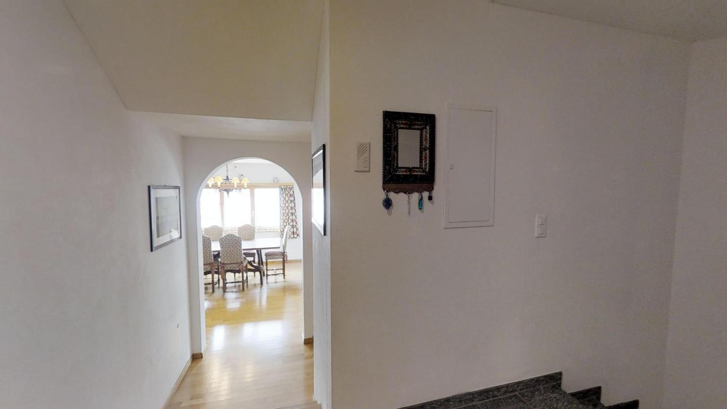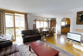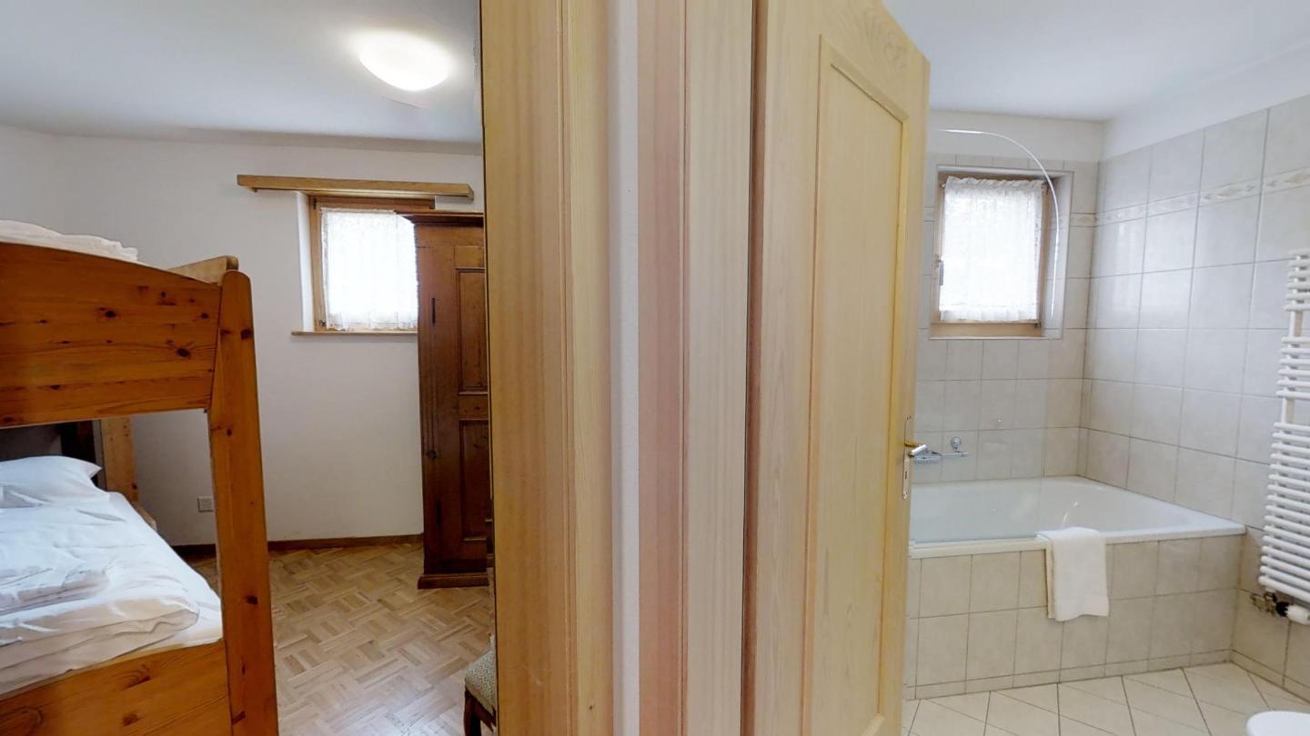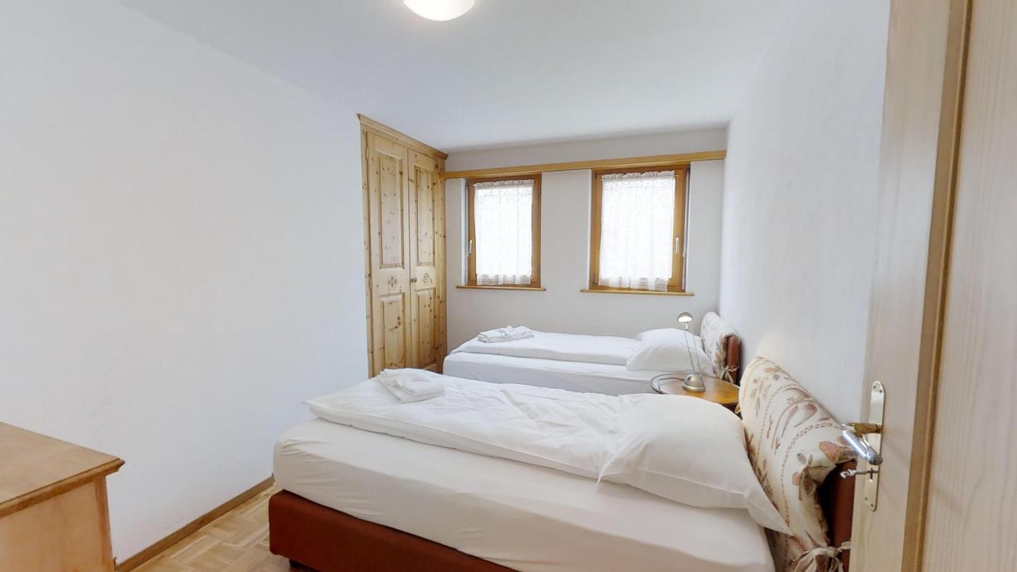 Über eine Marmortreppe gelangt man in den unteren Wohnungsteil mit 3 Schlafzimmern. Davon 1 Doppelbettzimmer und Zutritt über die Veranda in den Vorgarten. 1 Schlafzimmer mit 2 getrennten Einzelbetten und 1 Schlafzimmer mit Etagenbett. Badezimmer mit Badewanne/Lavabo. Separates kleines Gäste-WC. 2 Garagenplätze. Skiraum und Waschküche zur Mitbenützung. Haustiere sind nicht erlaubt.