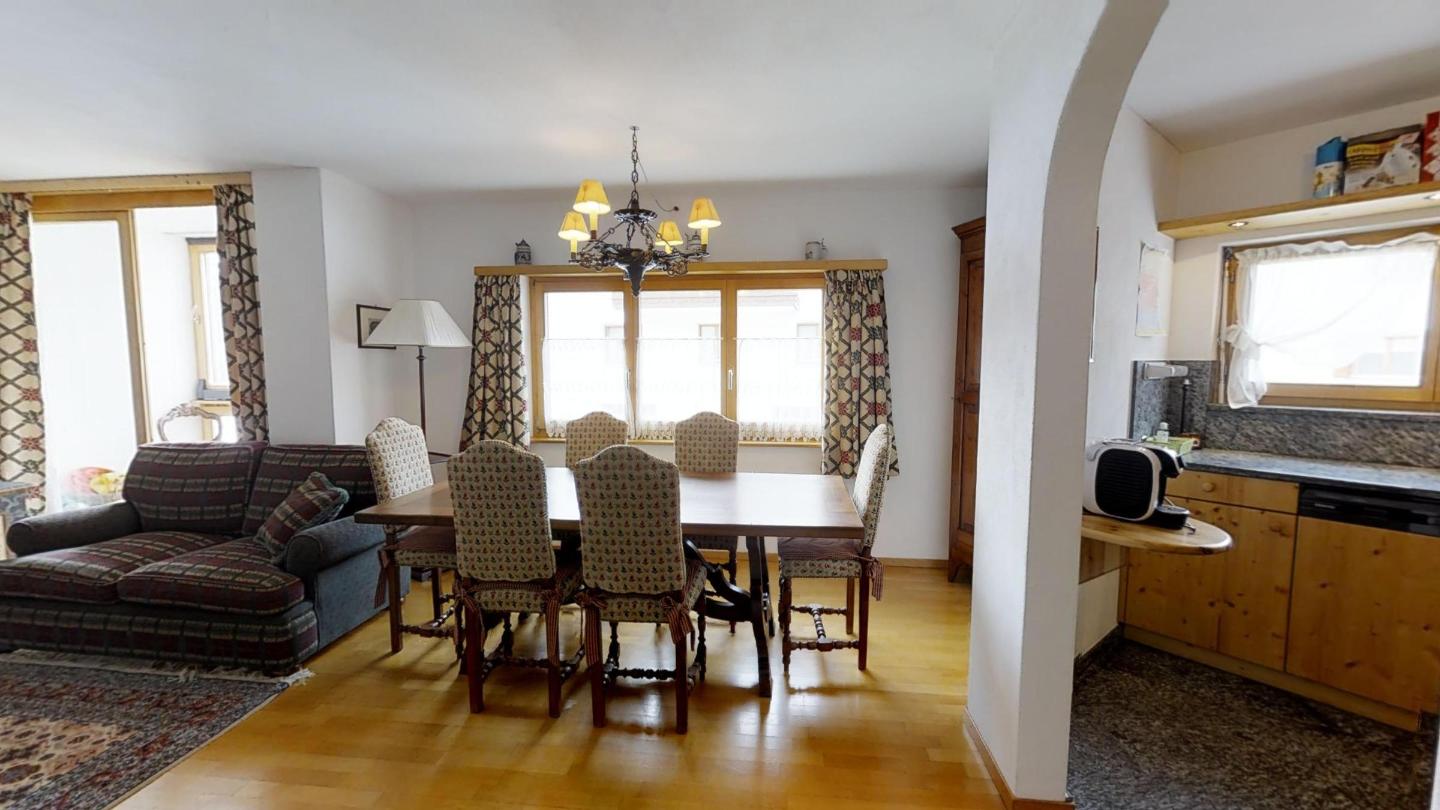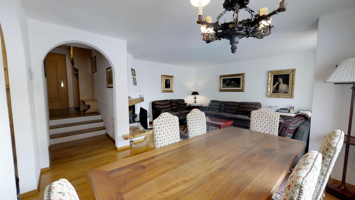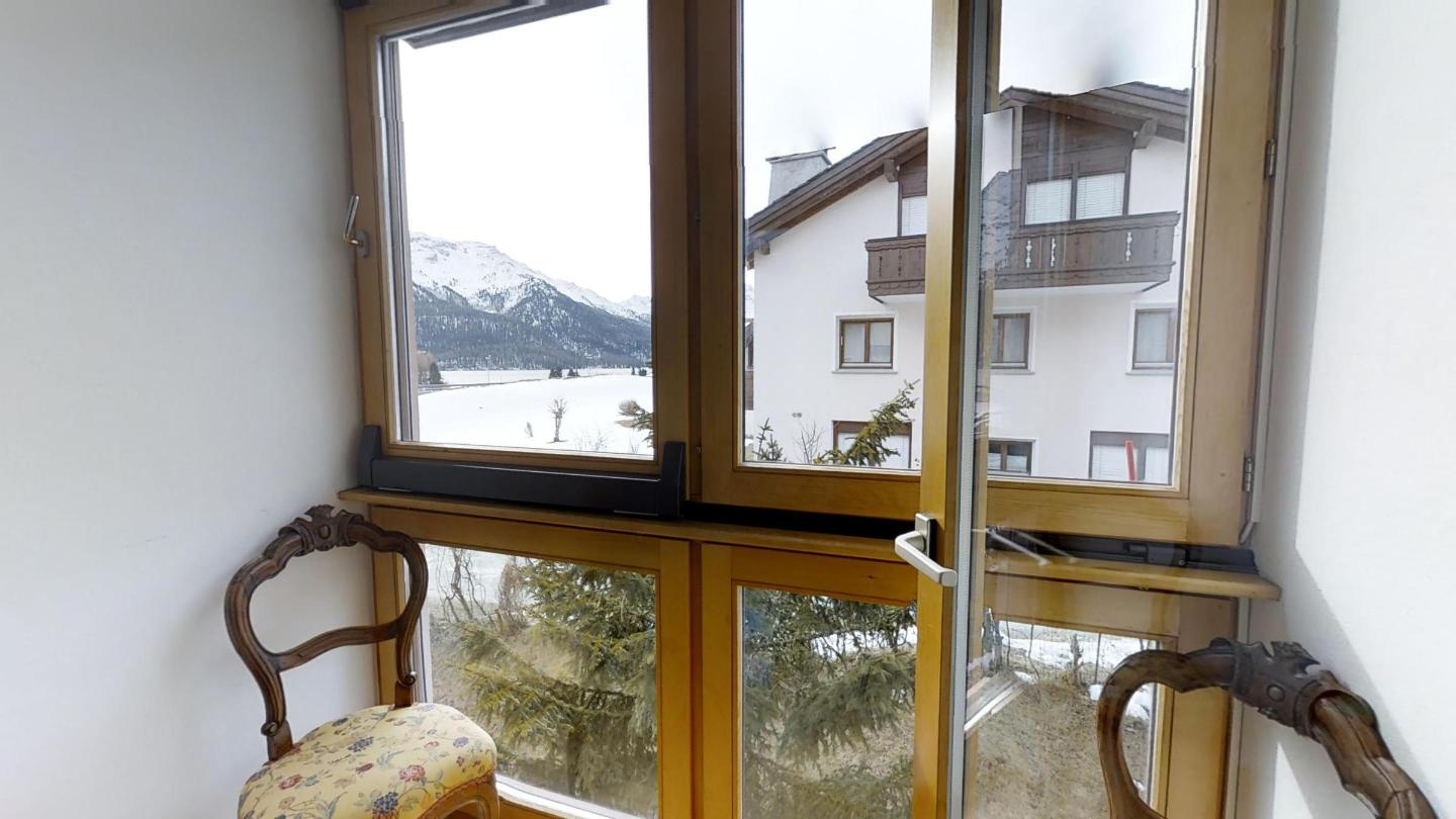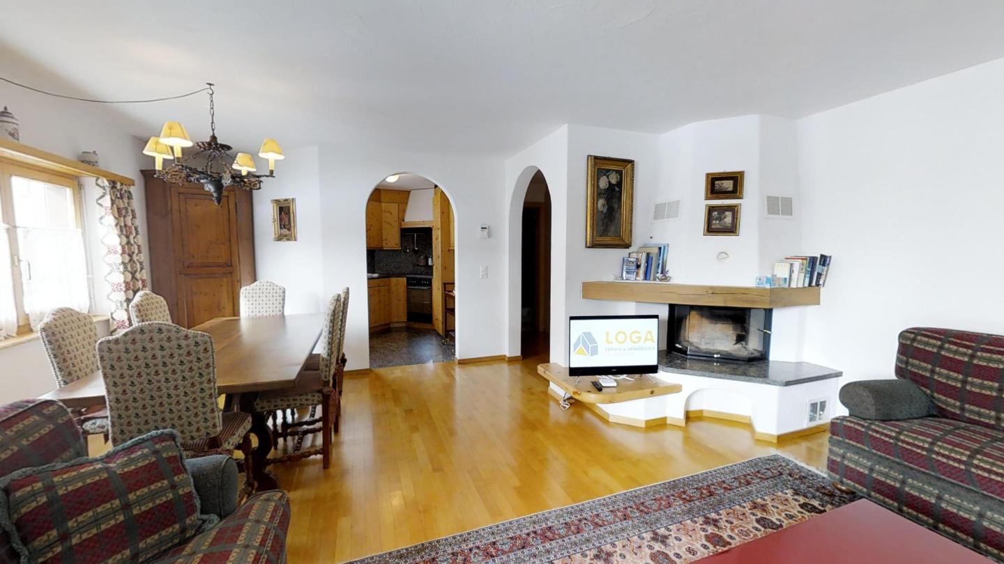 4½-Zimmerwohnung auf 2 Etagen mit circa 120m2. Vom Haupteingang in der 1. Etage kommend: Wohn-/ Esszimmer und abgegrenzter halb-offener Küche. Wohnzimmer mit grossem Kamin und Zugang zum kleinen Wintergarten mit herrlichem Blick auf den Silvaplanersee und den Corvatsch. TV und WLAN-Anschluss. Esstisch für 6 Personen. Küche mit Backofen und Geschirrspüler, grossem Kühlschrank mit Gefrierfach. Chicco d`Oro Kaffeemaschine.