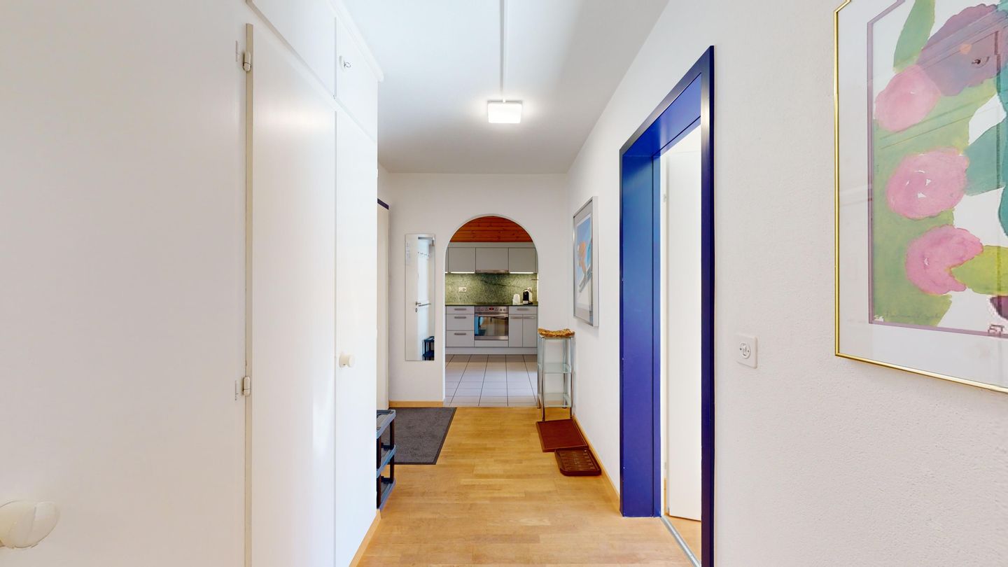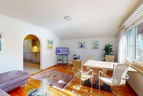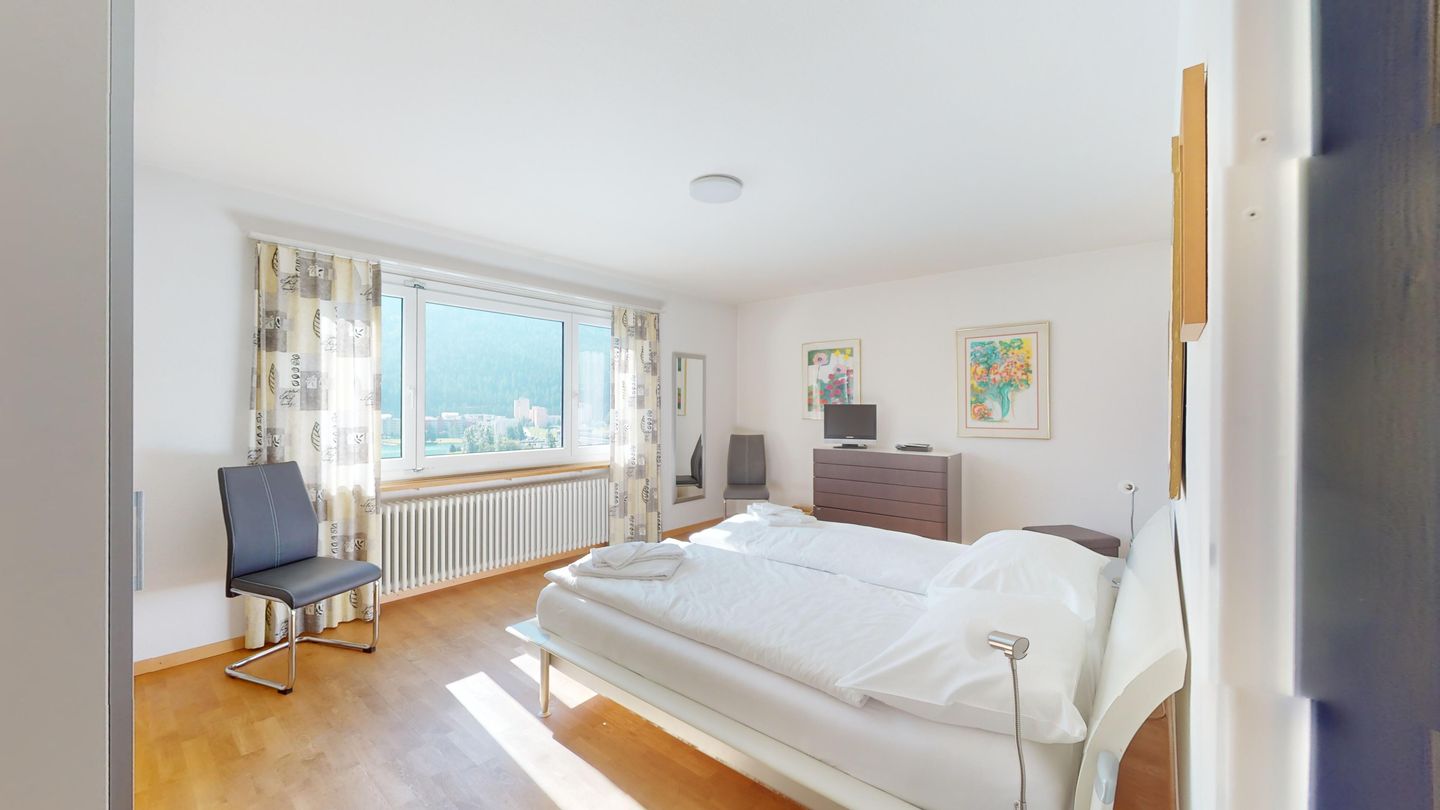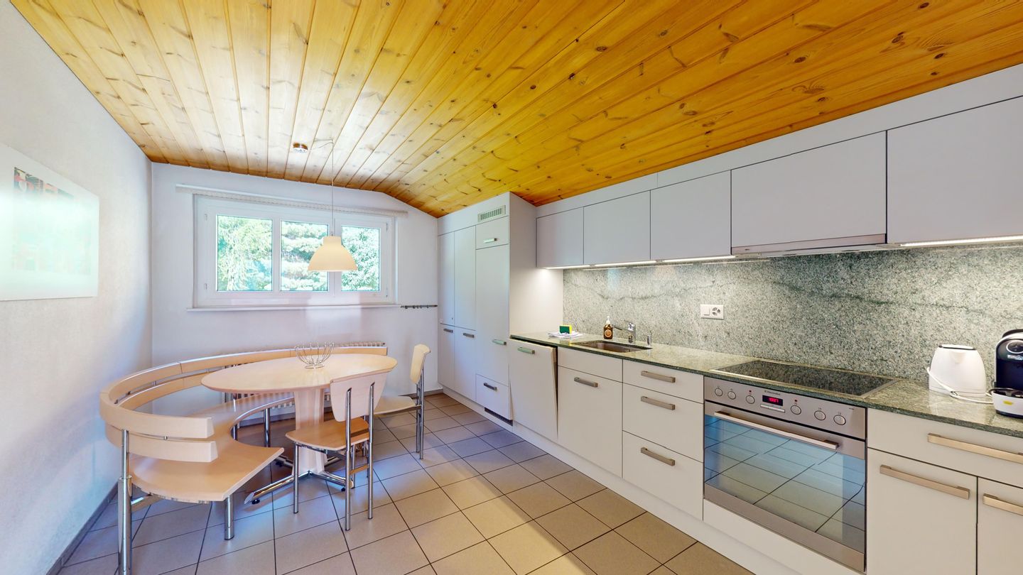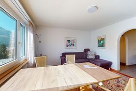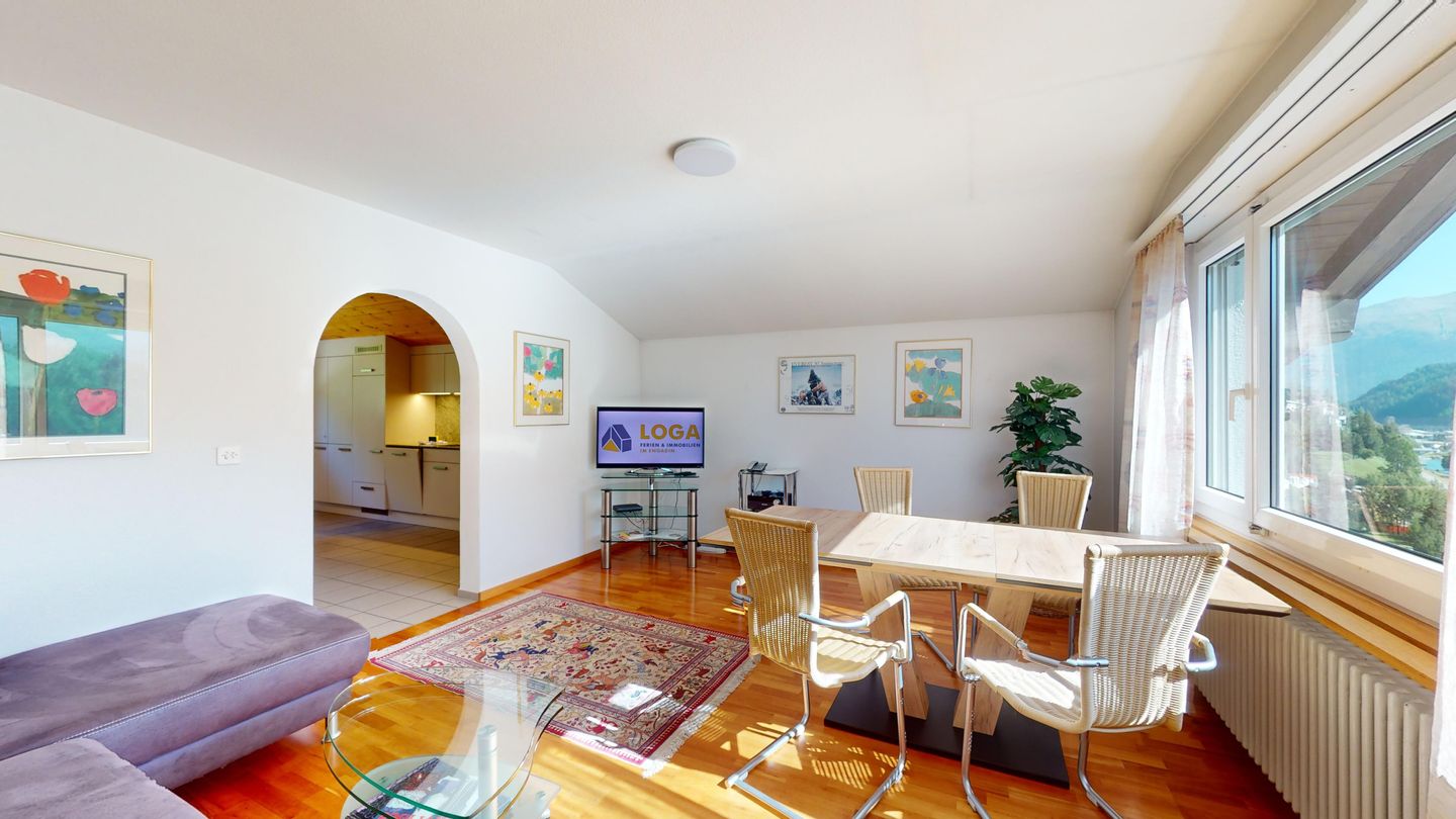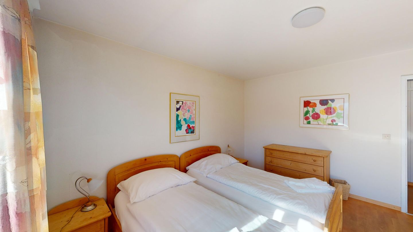 3-Zimmerwohnung im 3. Stock, ca. 97 m2. Entree mit Garderobe. Wohn-/Esszimmer mit herrlichem Seeblick, neue Küche mit Ofen, Kühlschrank, Kaffeemaschine Chicco d'Oro und Abwaschmaschine. Ein grosses Doppelzimmer und ein sehr grosses Doppelzimmer, beide mit Seeblick. Bad/WC/Lavabo. Dusche/WC/Lavabo. Internet, Radio, TV, DVD und Telefon. Neue, komfortable Einrichtung. Gedeckter Aussenparkplatz im Nebenhaus. Skiraum und Waschküche zur gemeinsamen Benützung. Haustiere sind nicht erlaubt.