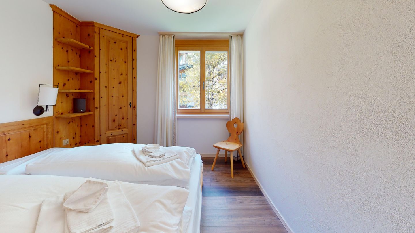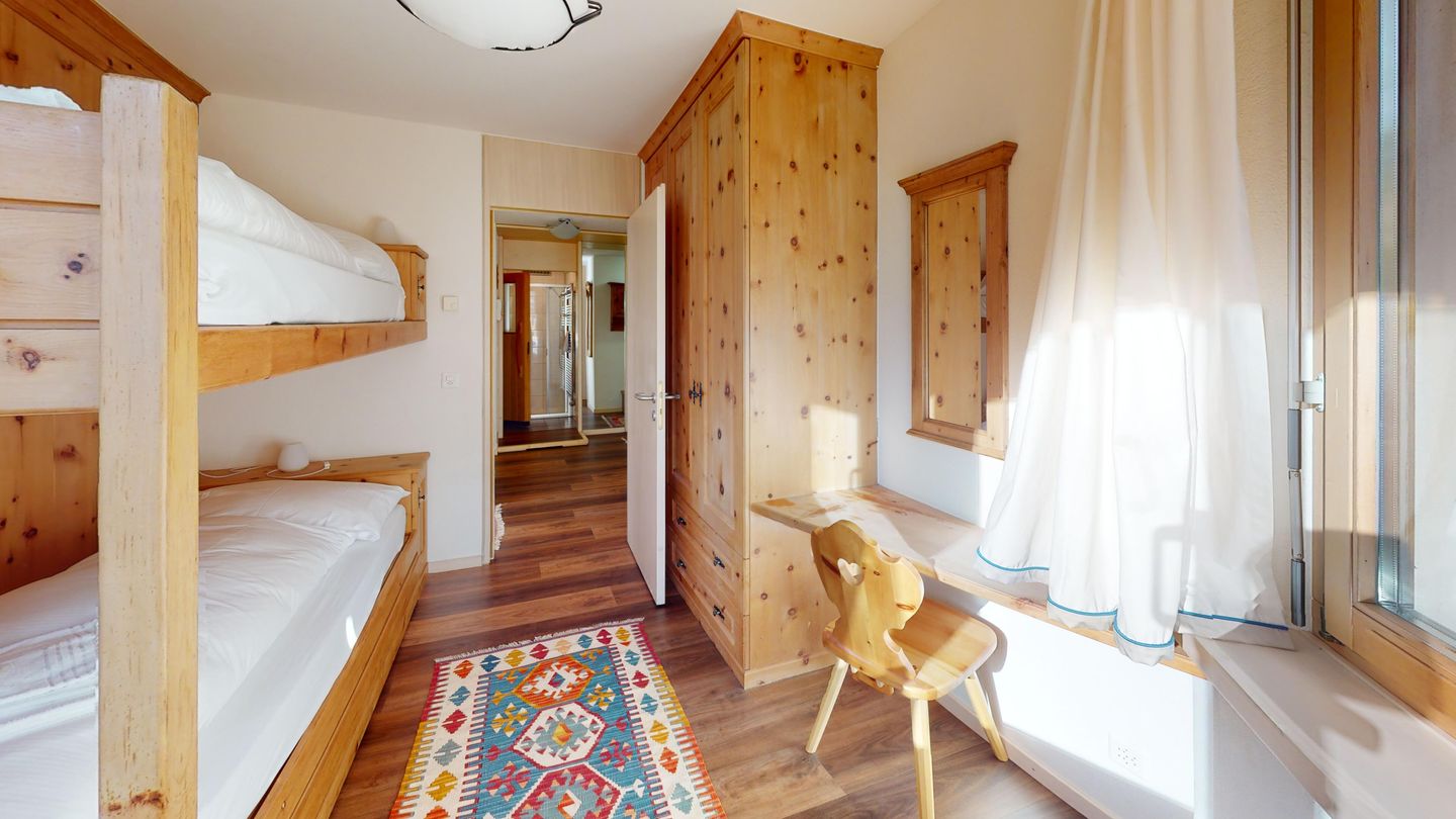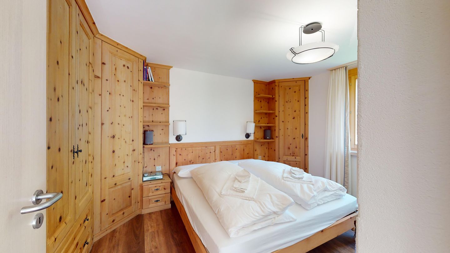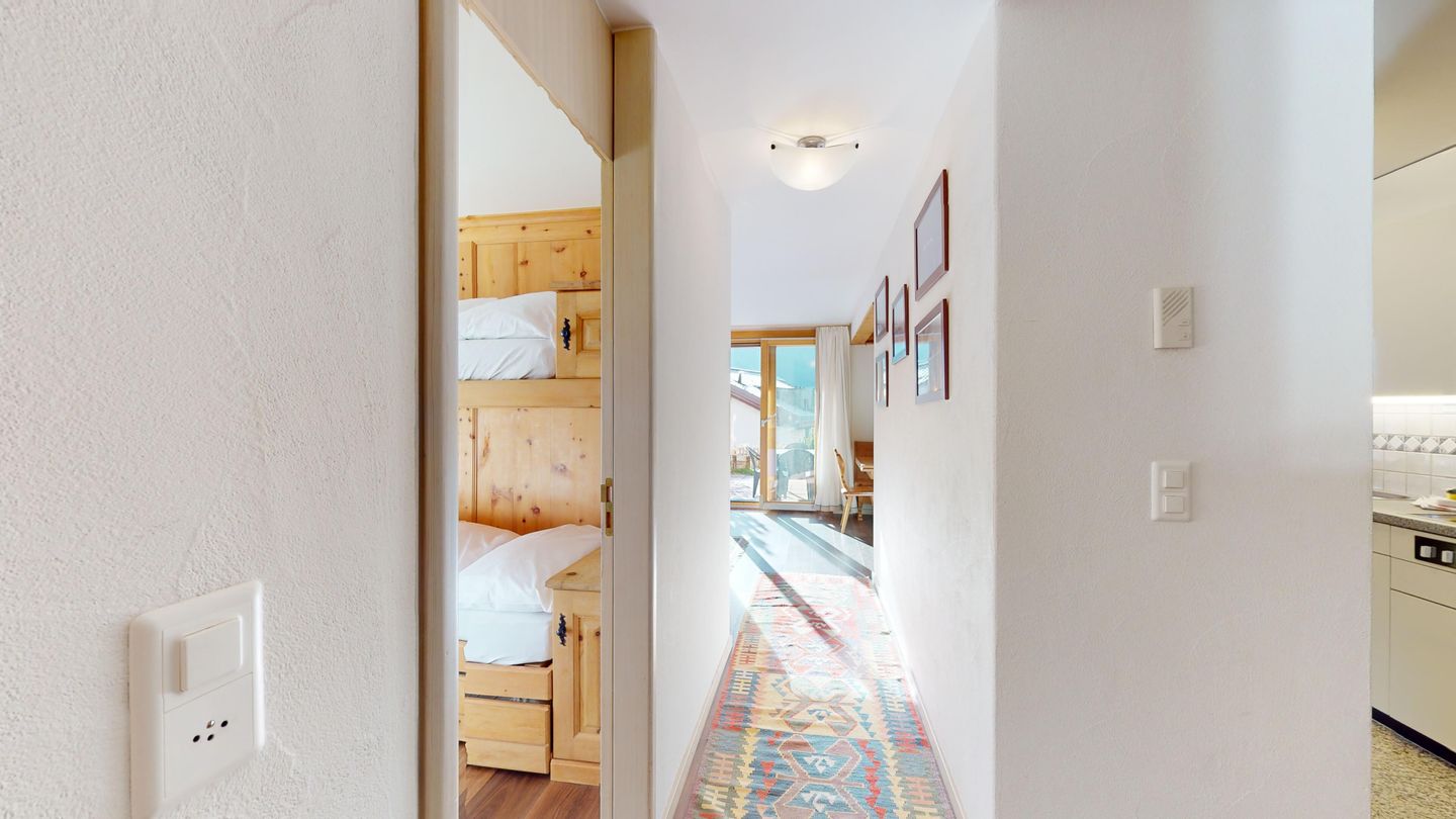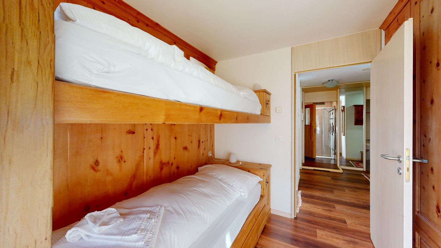 3 ½-Zimmerwohnung mit ca. 80 m2 im Erdgeschoss mit Lift. Eingang mit Garderobe, Wohn- / Essbereich, TV, Ausgang zum Garten, Blick auf die nach Süden ausgerichteten Berge. Offene Küche mit Backofen, Geschirrspüler und Kühlschrank. 1 Zimmer mit Doppelbett. 1 Zimmer mit einem Etagenbett und einem Einzelbett. Badezimmer mit Badewanne, Toilette und Waschbecken. Dusche und Sauna. Garagenplatz (245 cm hoch). Waschmaschine im Kellerabteil.