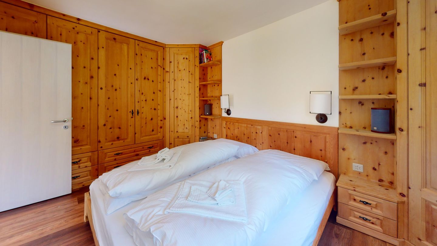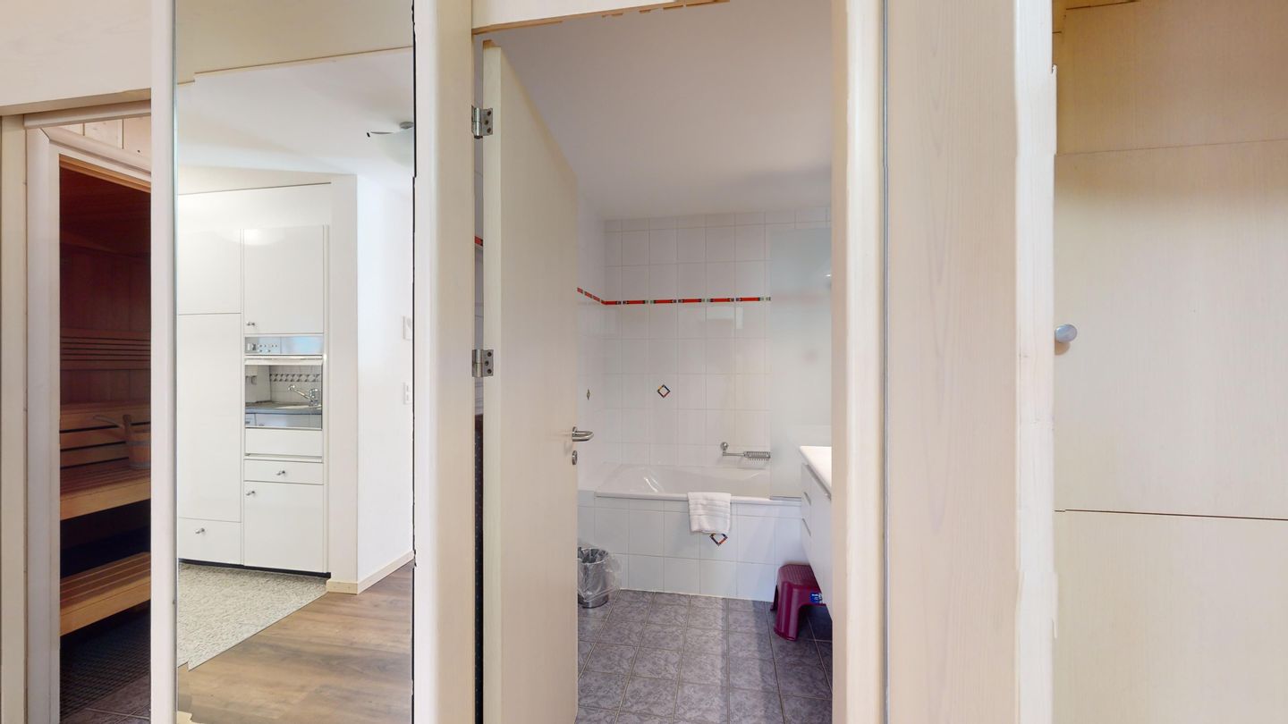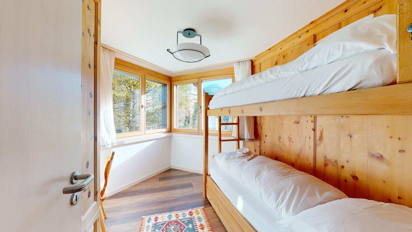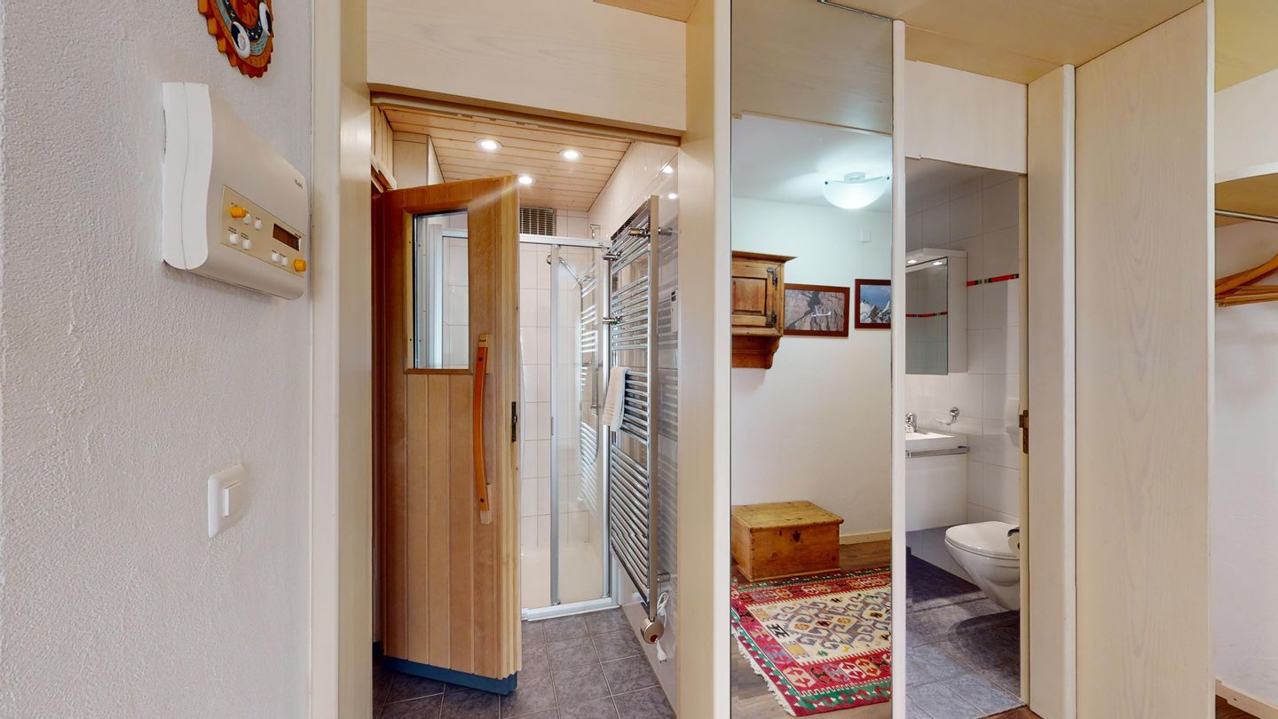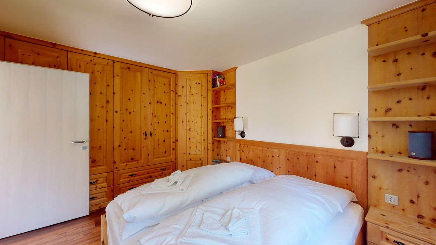 3 ½-Zimmerwohnung mit ca. 80 m2 im Erdgeschoss mit Lift. Eingang mit Garderobe, Wohn- / Essbereich, TV, Ausgang zum Garten, Blick auf die nach Süden ausgerichteten Berge. Offene Küche mit Backofen, Geschirrspüler und Kühlschrank. 1 Zimmer mit Doppelbett. 1 Zimmer mit einem Etagenbett und einem Einzelbett. Badezimmer mit Badewanne, Toilette und Waschbecken. Dusche und Sauna. Garagenplatz (245 cm hoch). Waschmaschine im Kellerabteil.