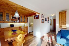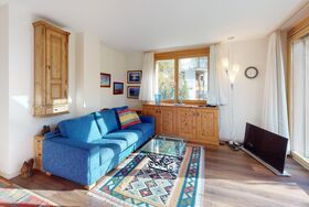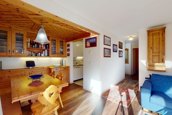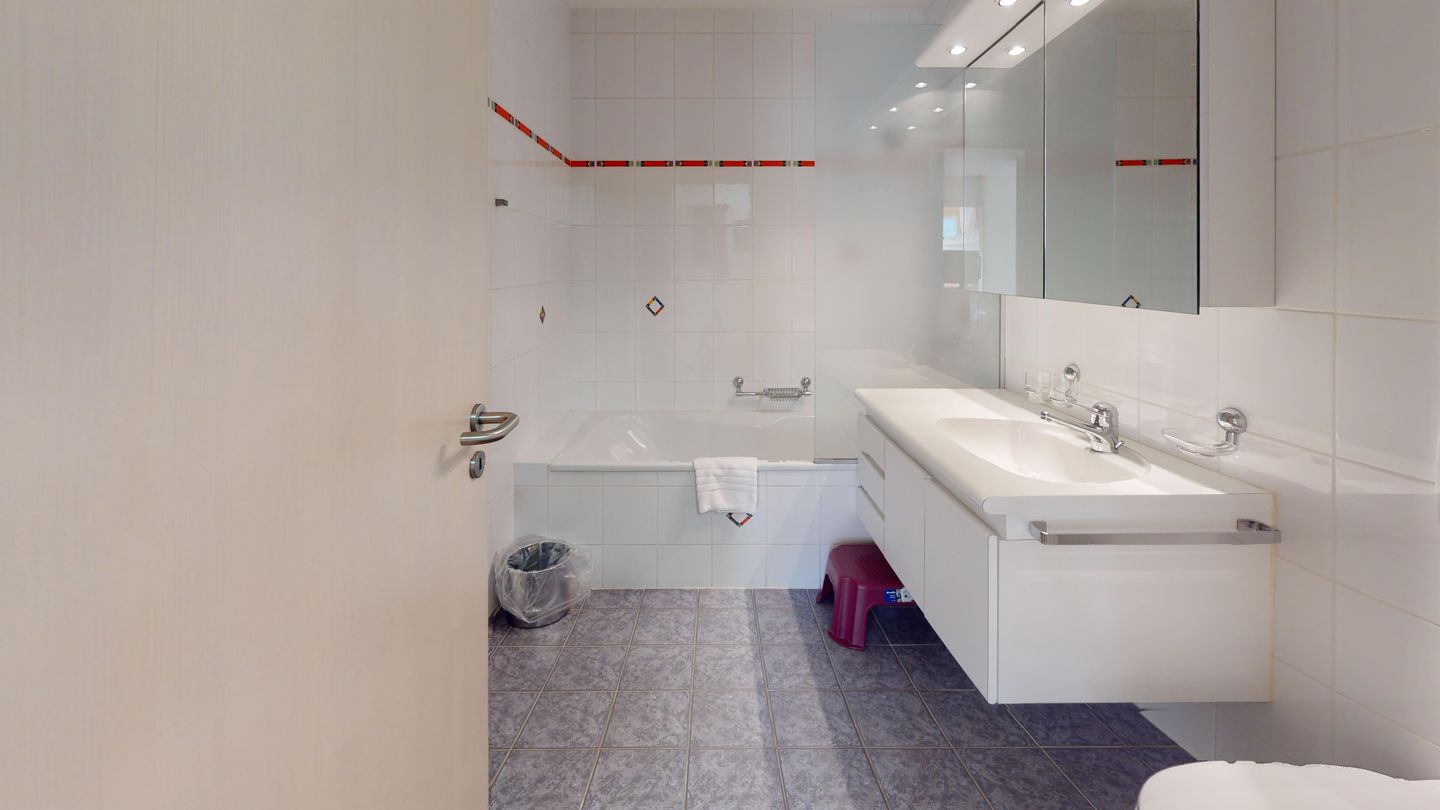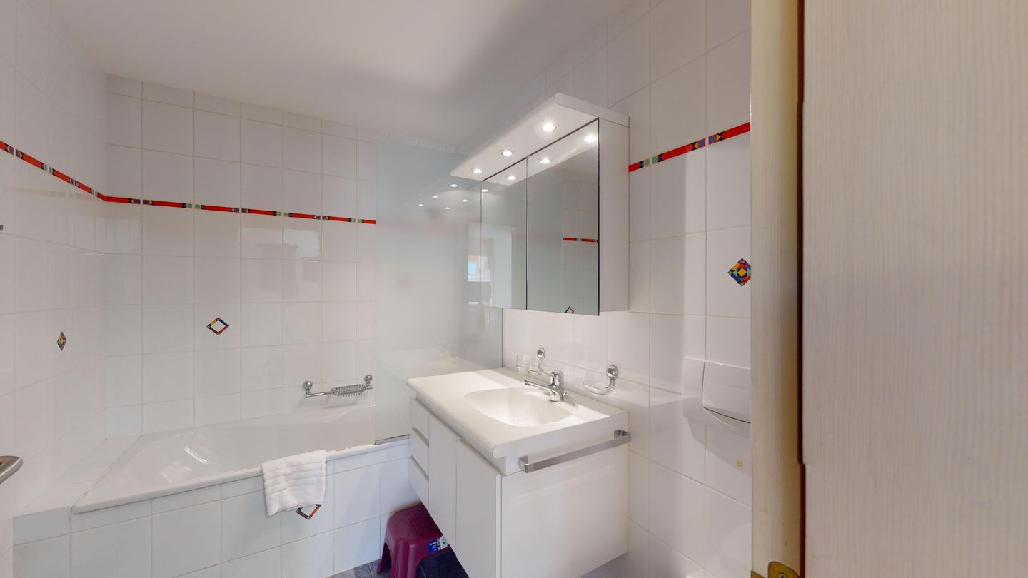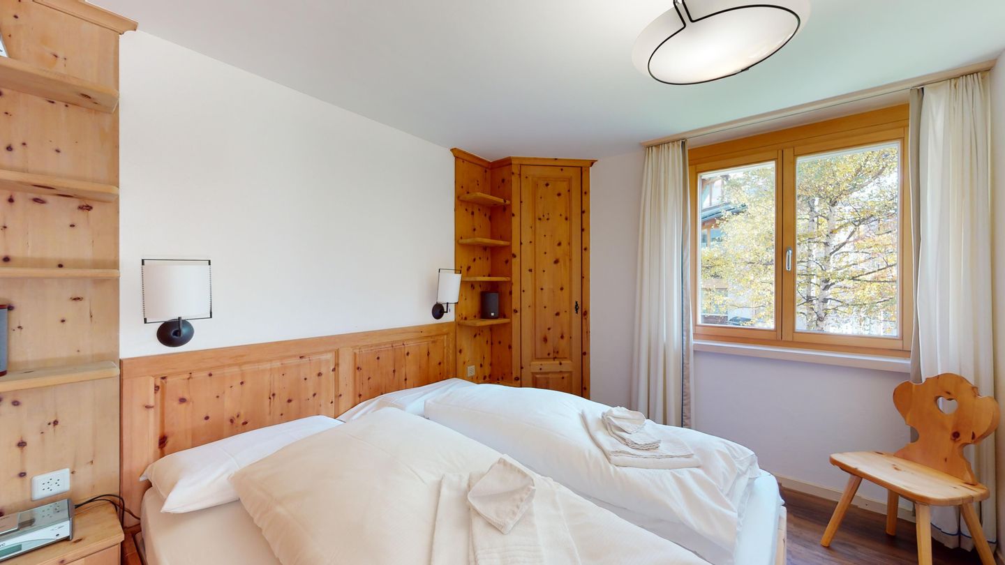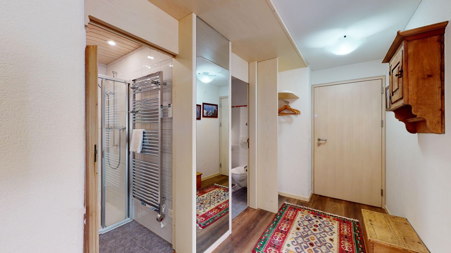 3 ½-Zimmerwohnung mit ca. 80 m2 im Erdgeschoss mit Lift. Eingang mit Garderobe, Wohn- / Essbereich, TV, Ausgang zum Garten, Blick auf die nach Süden ausgerichteten Berge. Offene Küche mit Backofen, Geschirrspüler und Kühlschrank. 1 Zimmer mit Doppelbett. 1 Zimmer mit einem Etagenbett und einem Einzelbett. Badezimmer mit Badewanne, Toilette und Waschbecken. Dusche und Sauna. Garagenplatz (245 cm hoch). Waschmaschine im Kellerabteil.