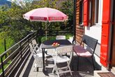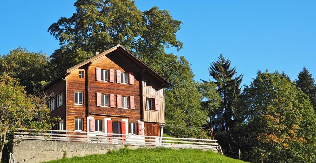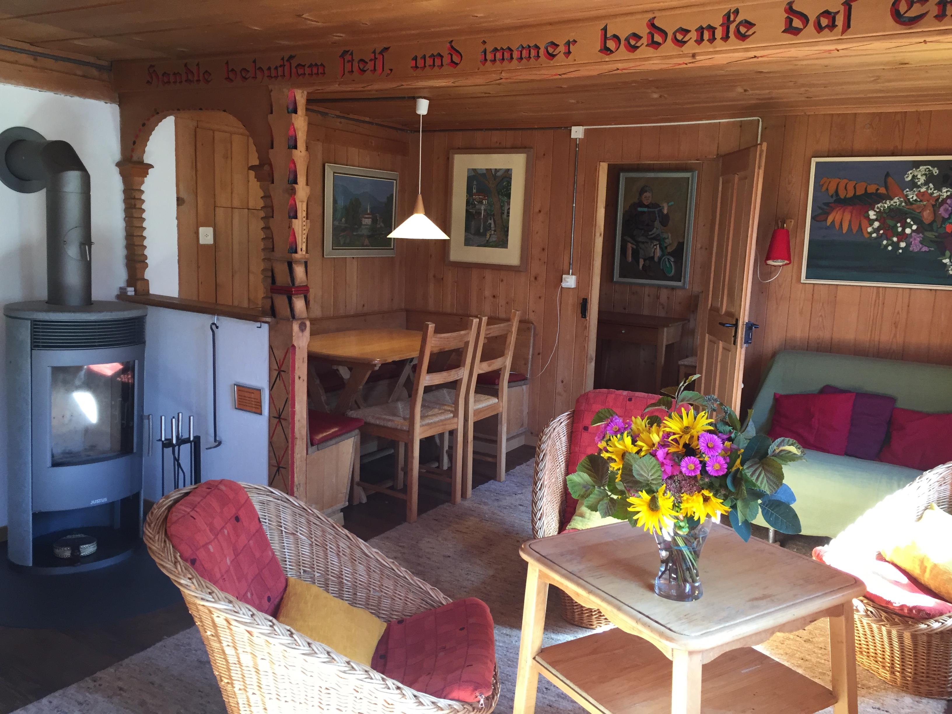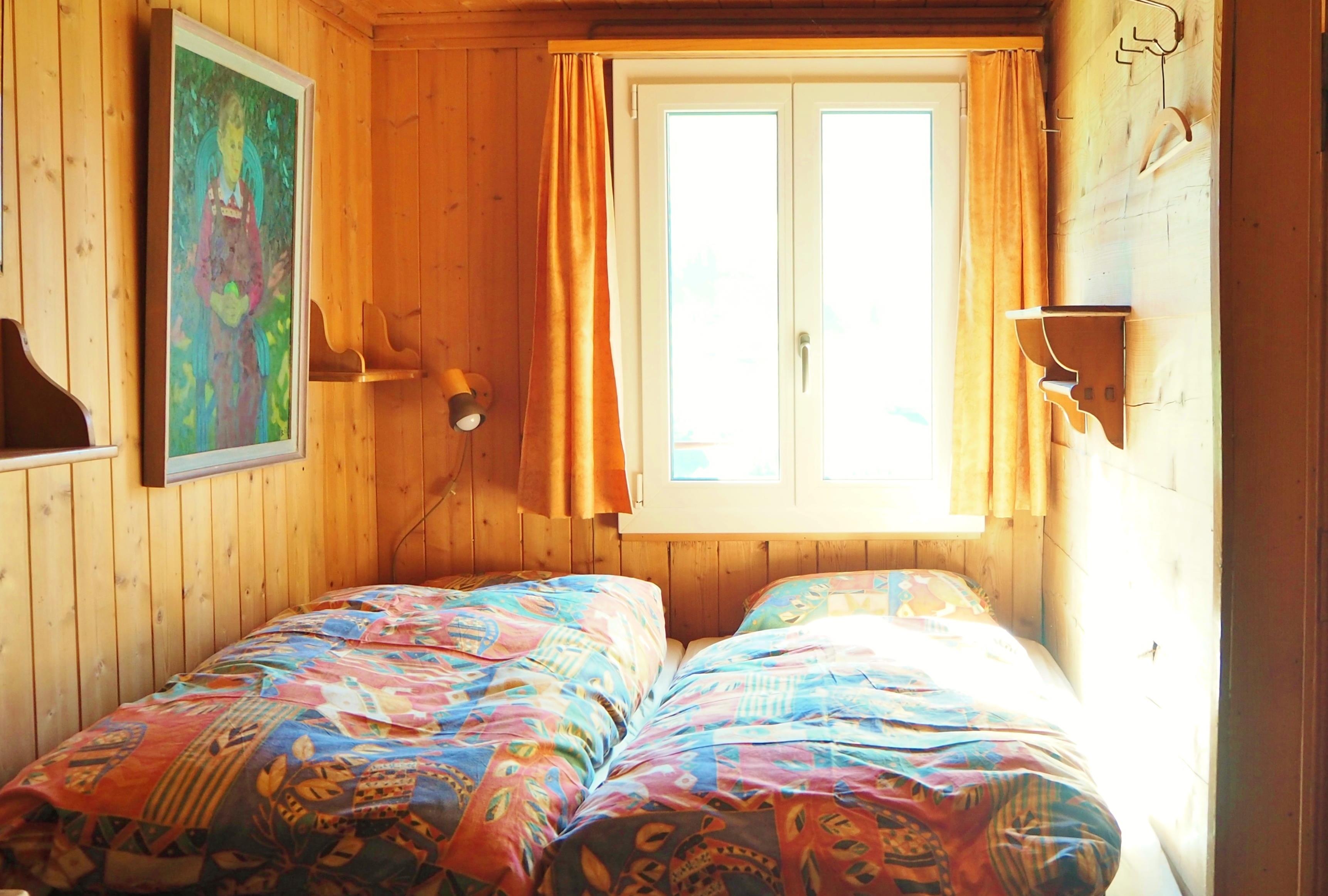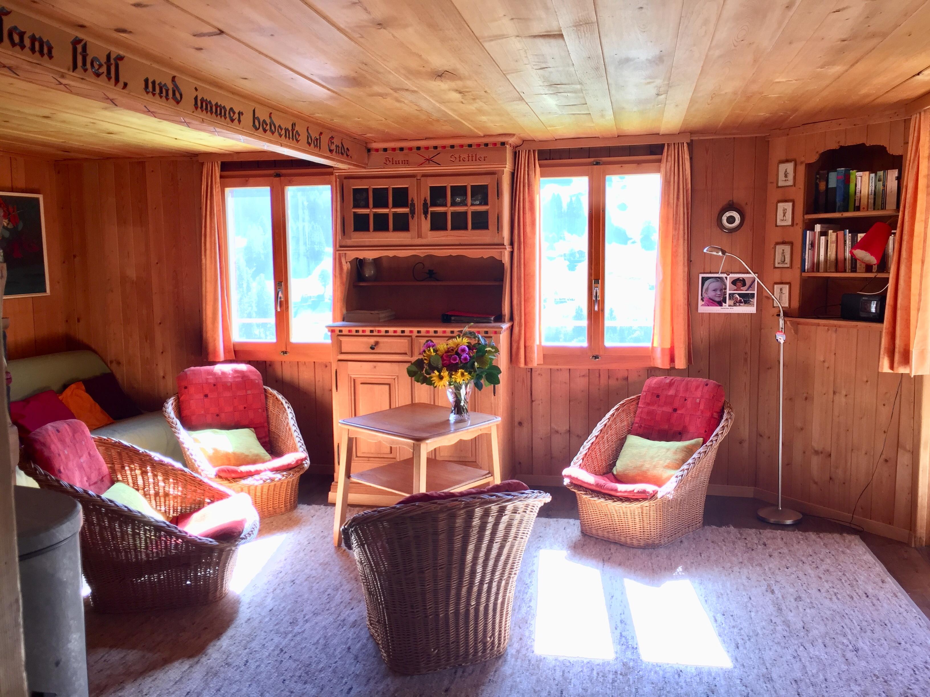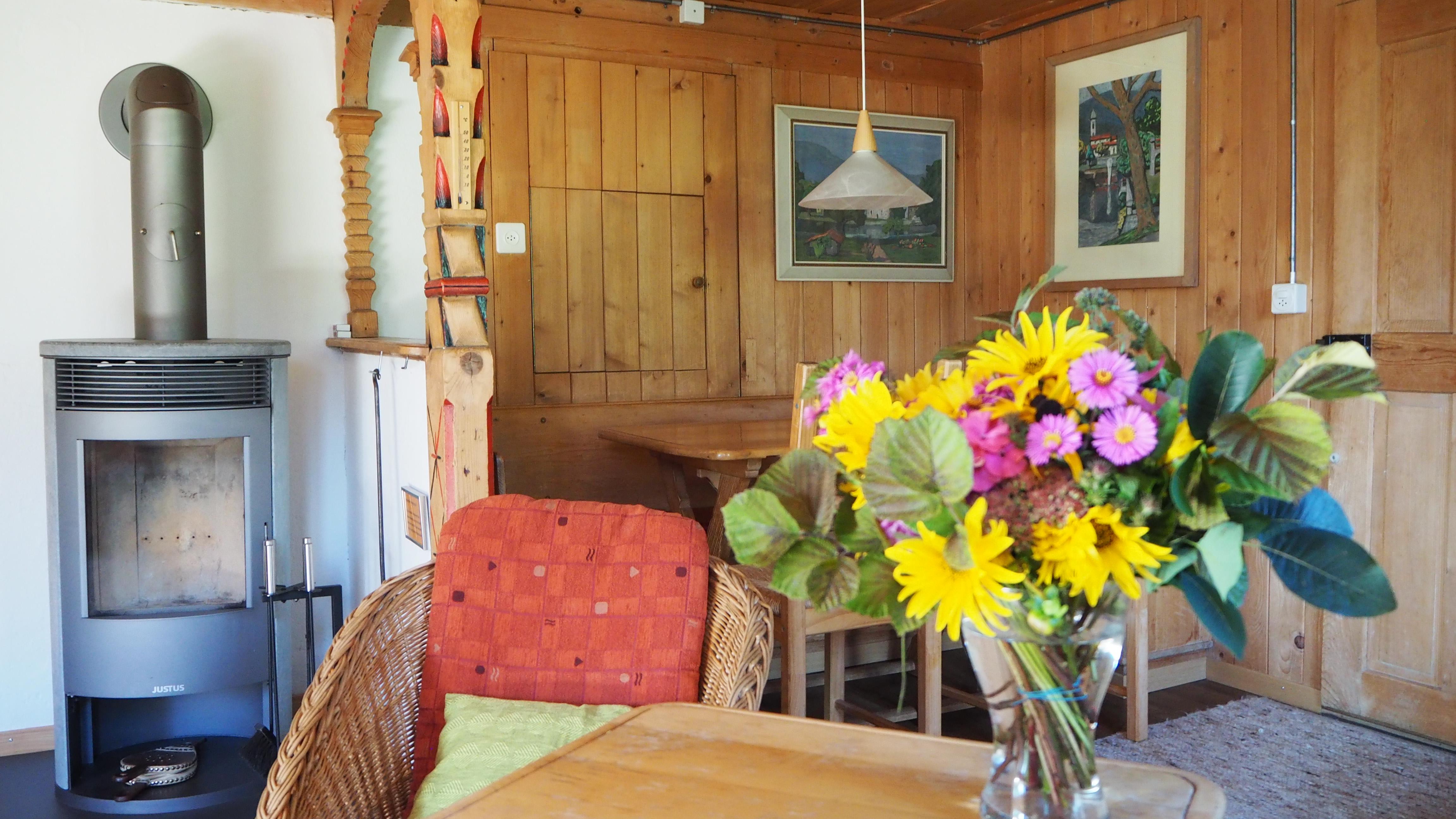 Gemütliches Holzhaus, an unverbauter , sehr sonniger und ruhiger Lage, zentrumsnahe, freier Bergblick. Die Ferienwohnung liegt ebenerdig, vom zugehörigen P-Platz gut erreichbar auf 2 Stockwerken. Im Parterre Wohnstube mit eingebautem Schwedenofen, anschliessend sonnige Veranda und auf der anderen Seite 1 Schlafzimmer mit Doppelbett. Neue moderne Küche mit Geschirrspüler, Backofen, Nespresso-Maschine, Mikrowellenherd. Hinter Küche Abstell-Putzraum und anschliessend Toilettenraum (WC,Lavabo). Im Obergeschoss 2 Schlafzimmer mit je 2 Betten. Zusätzlich 2 Betten in schmalem Raum mit Dachschräge und im Estrich ein zusammengeklapptes Camping-Kinderbett. Badezimmer mit Waschmaschine, dahinter Estrich für Bettwäsche und als Abstellraum. Nichtraucherwohnung. Haustiere nach Absprache mit Vermieter möglich. 2 Aussensitzplätze, kleiner Rasenplatz. Hinter Haus Schopf für Skis und Gartenmobiliar.