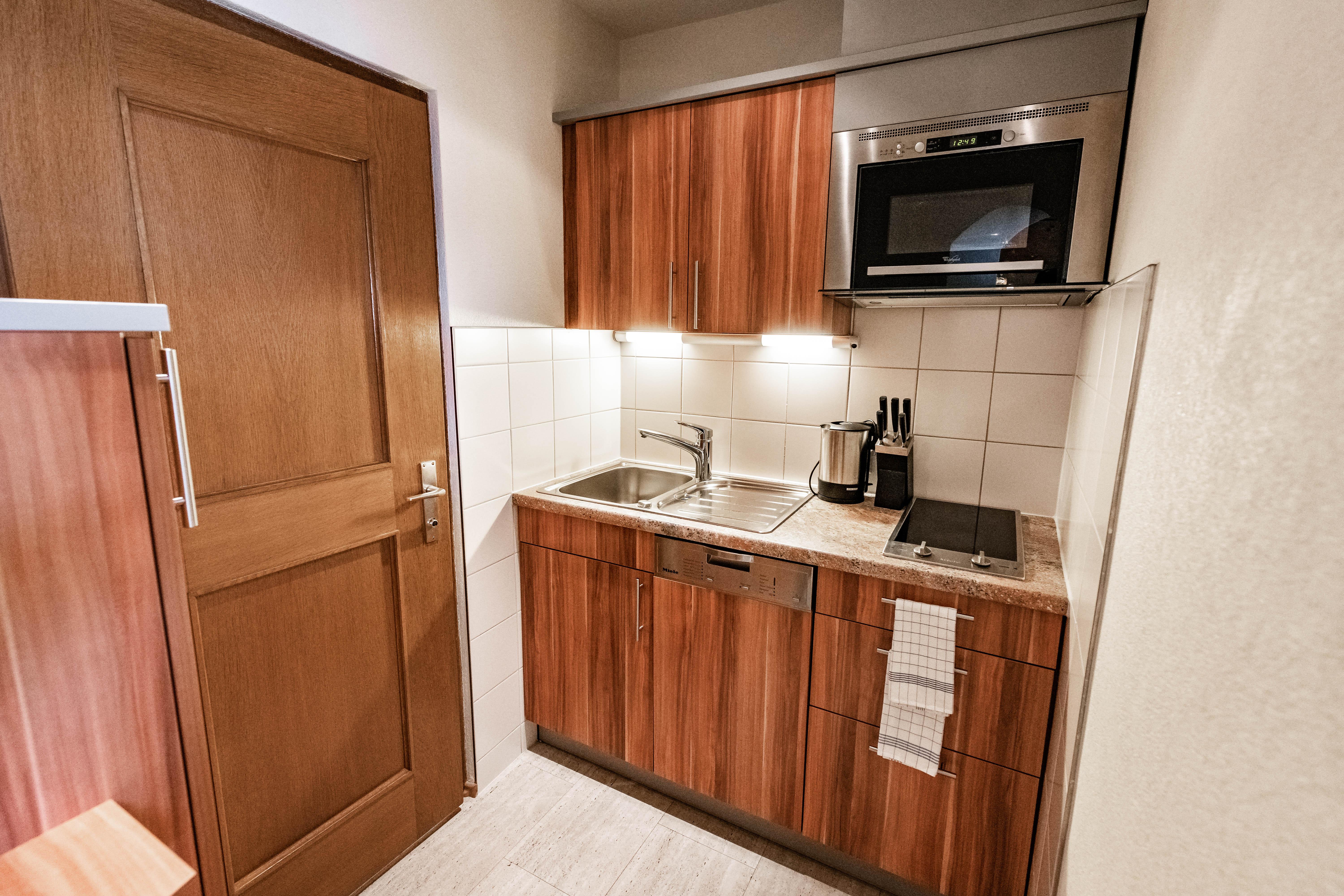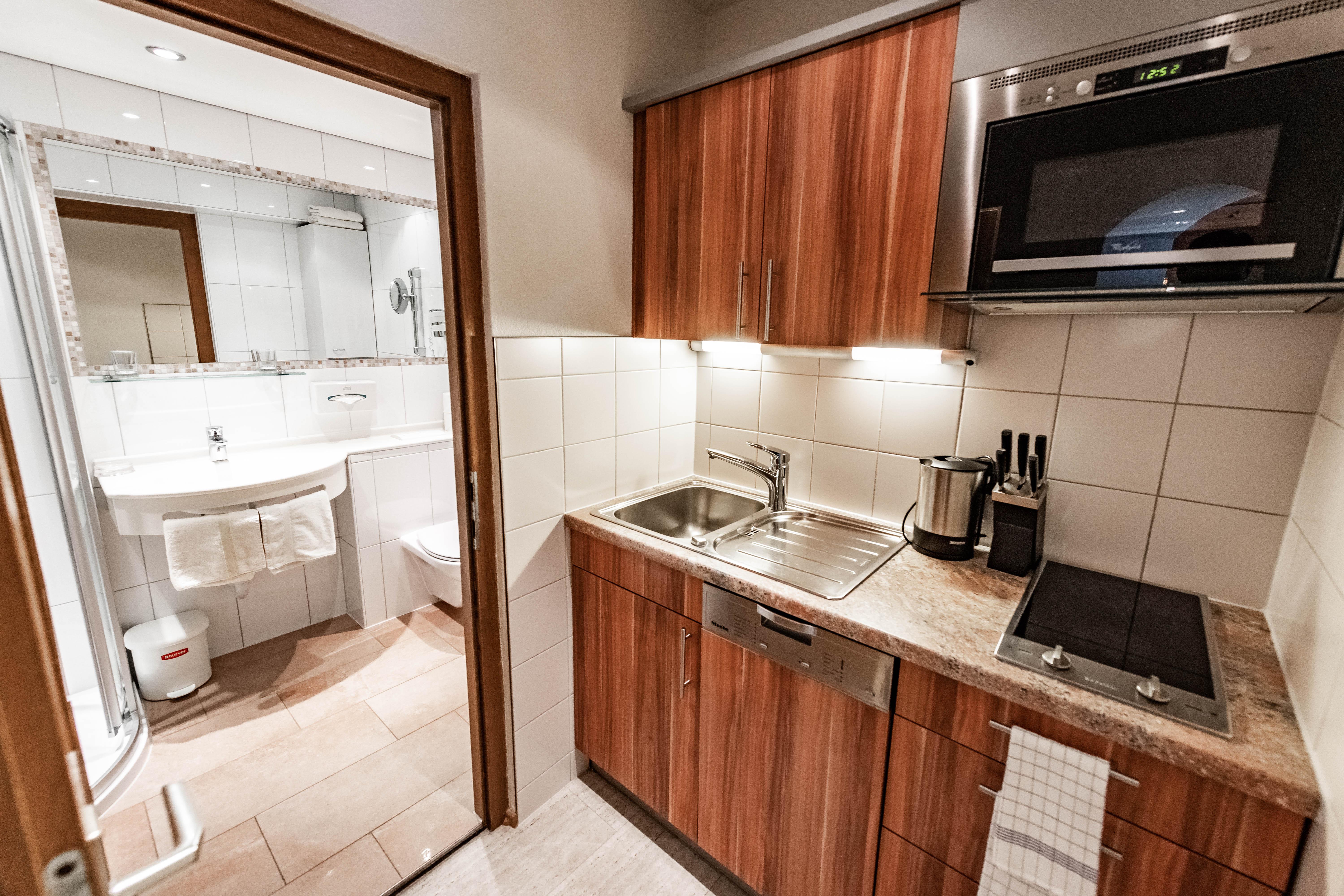 • vollausgestattete Küche mit Geschirrspüler, Ceran-Kochfeld, Mikrowelle, Kaffeemaschine und Kühlschrank