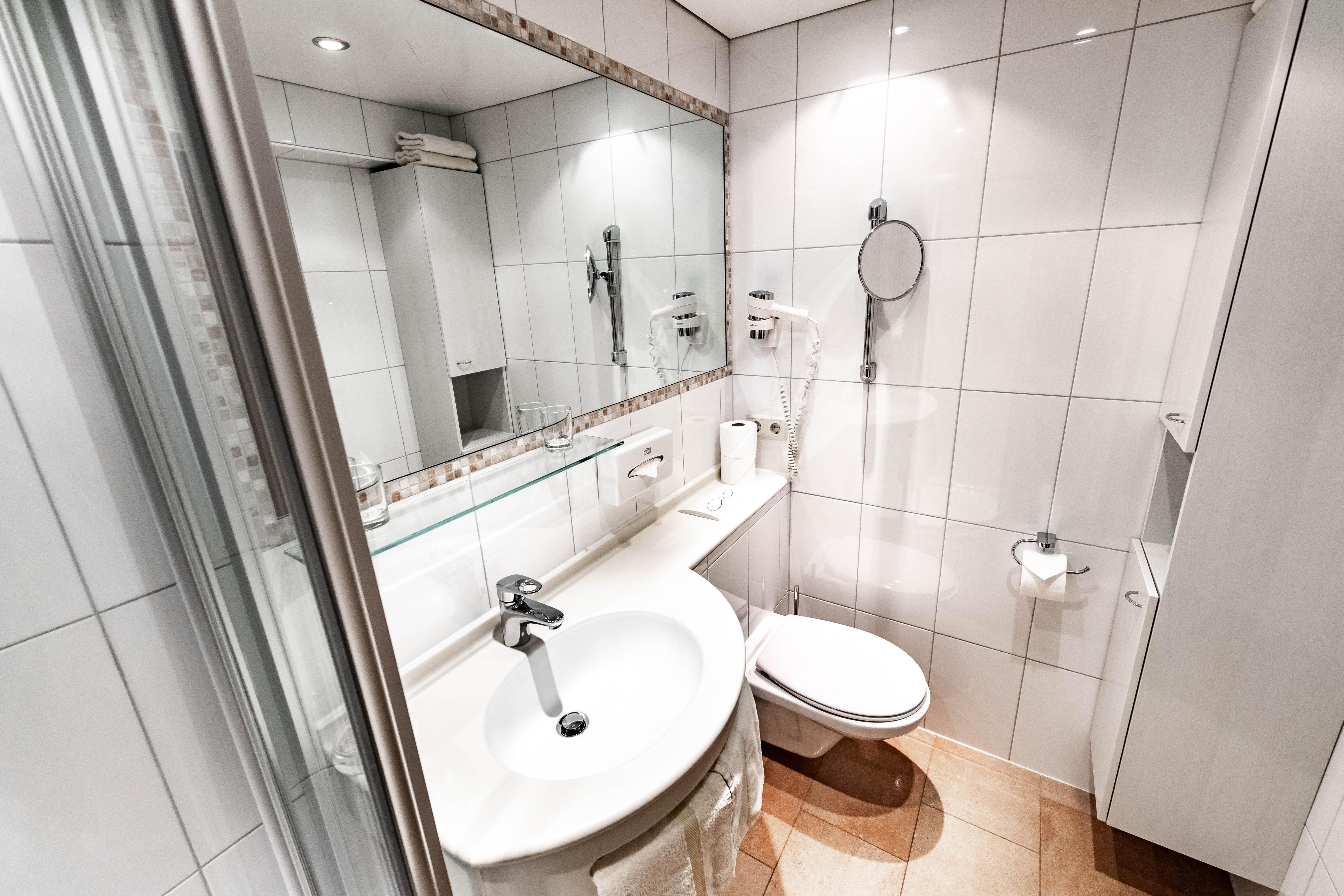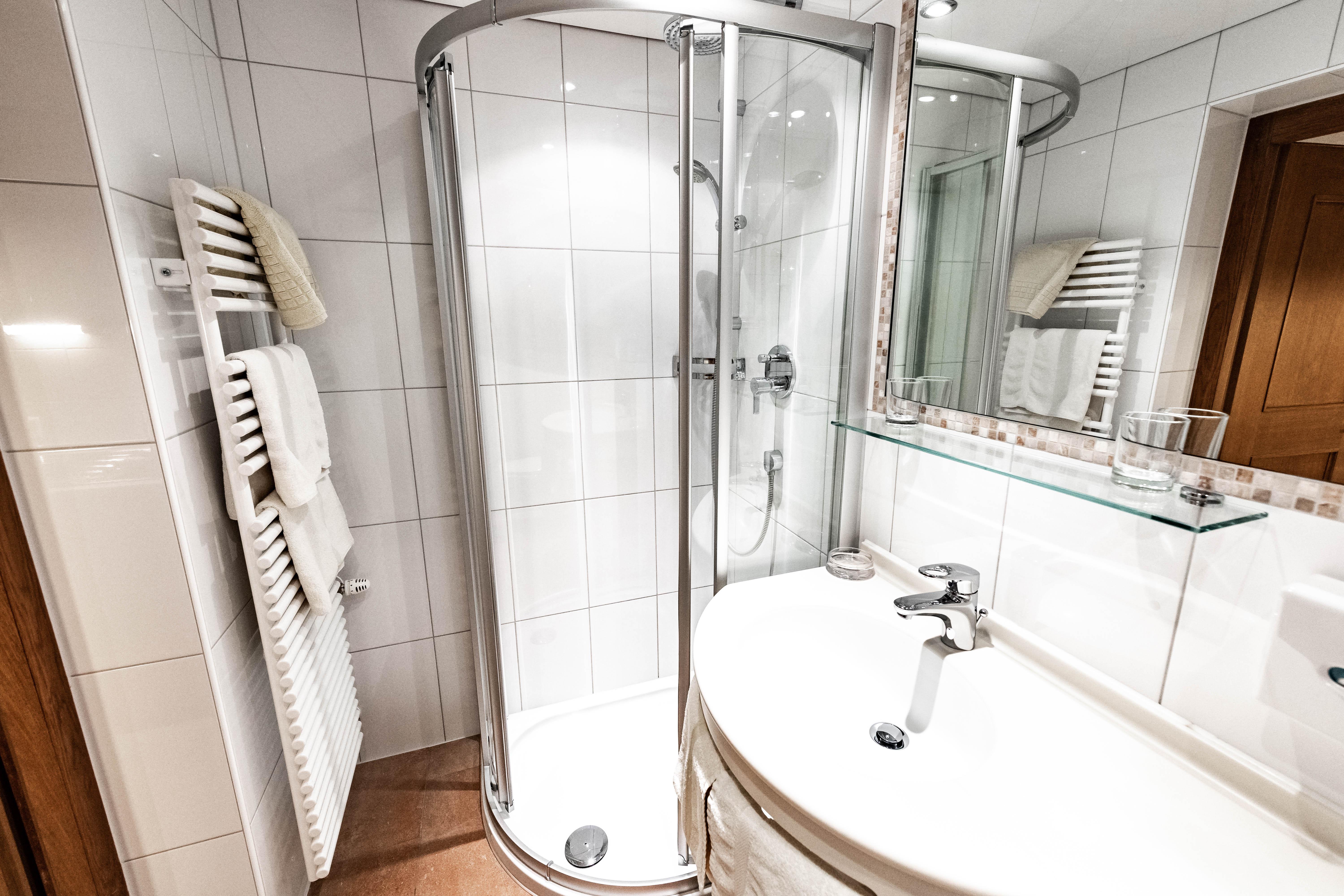 • Badezimmer mit Dusche, WC, Haartrockner und Kosmetikspiegel