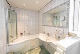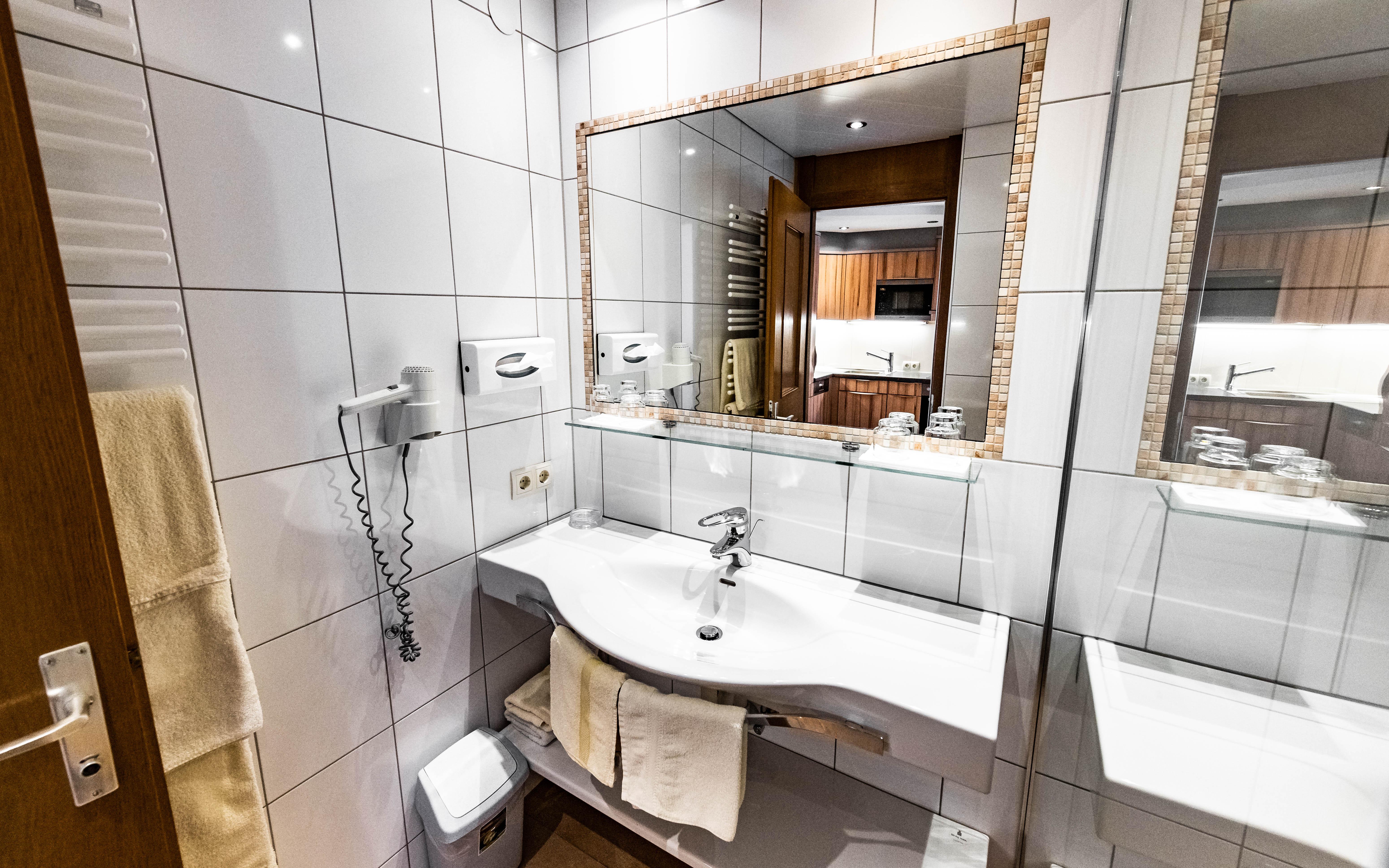 • 1 Badezimmer mit Dusche / Badewanne, Waschbecken, WC, Haartrockner und Kosmetikspiegel